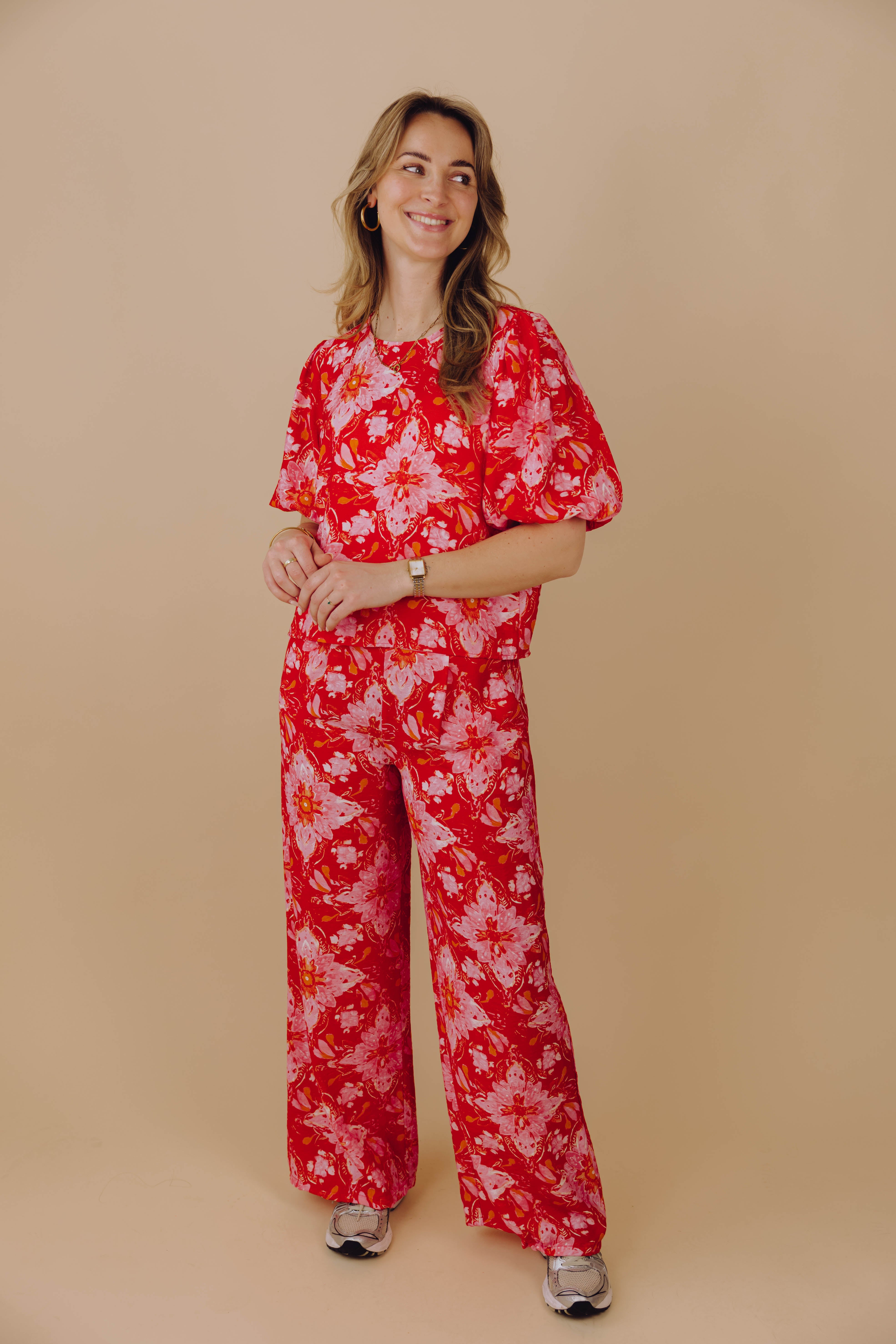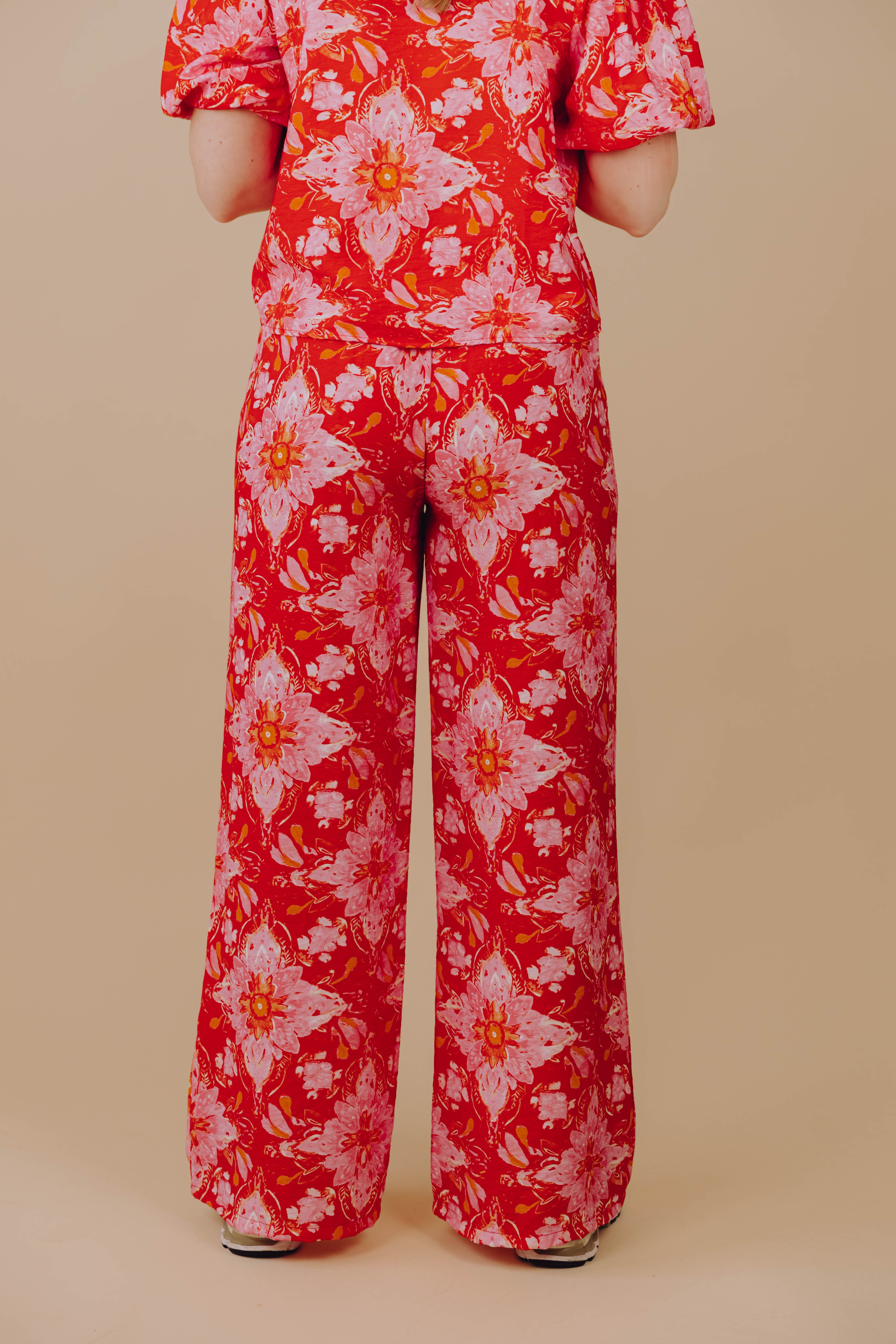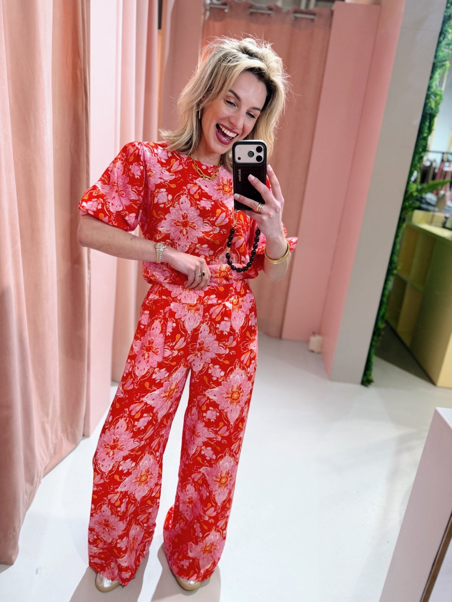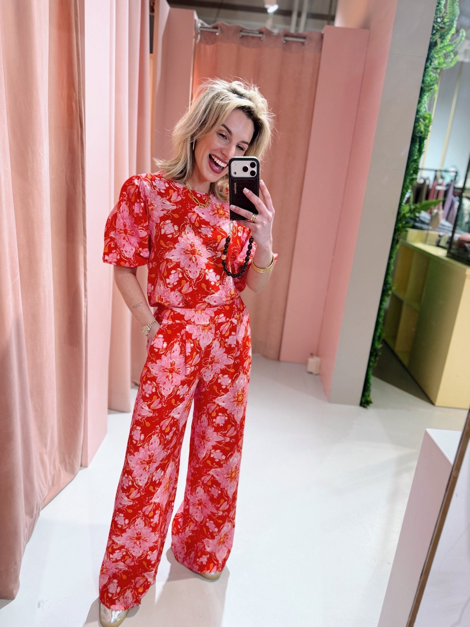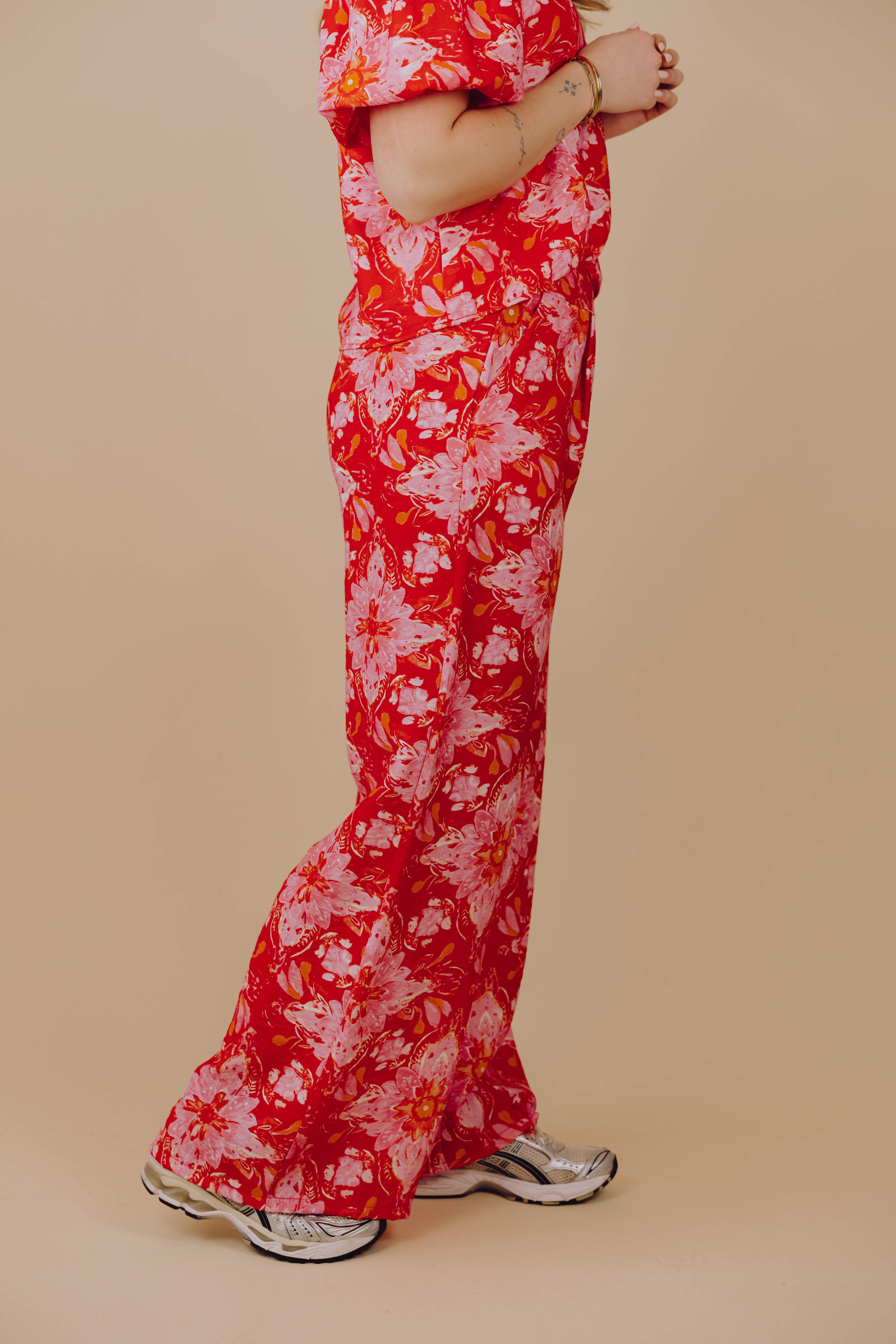De Viona Pants in rood is een wide leg pantalon met dezelfde bloemenprint als de bijpassende blouse. De broek heeft een elegante, losse fit en valt soepel langs het lichaam.
