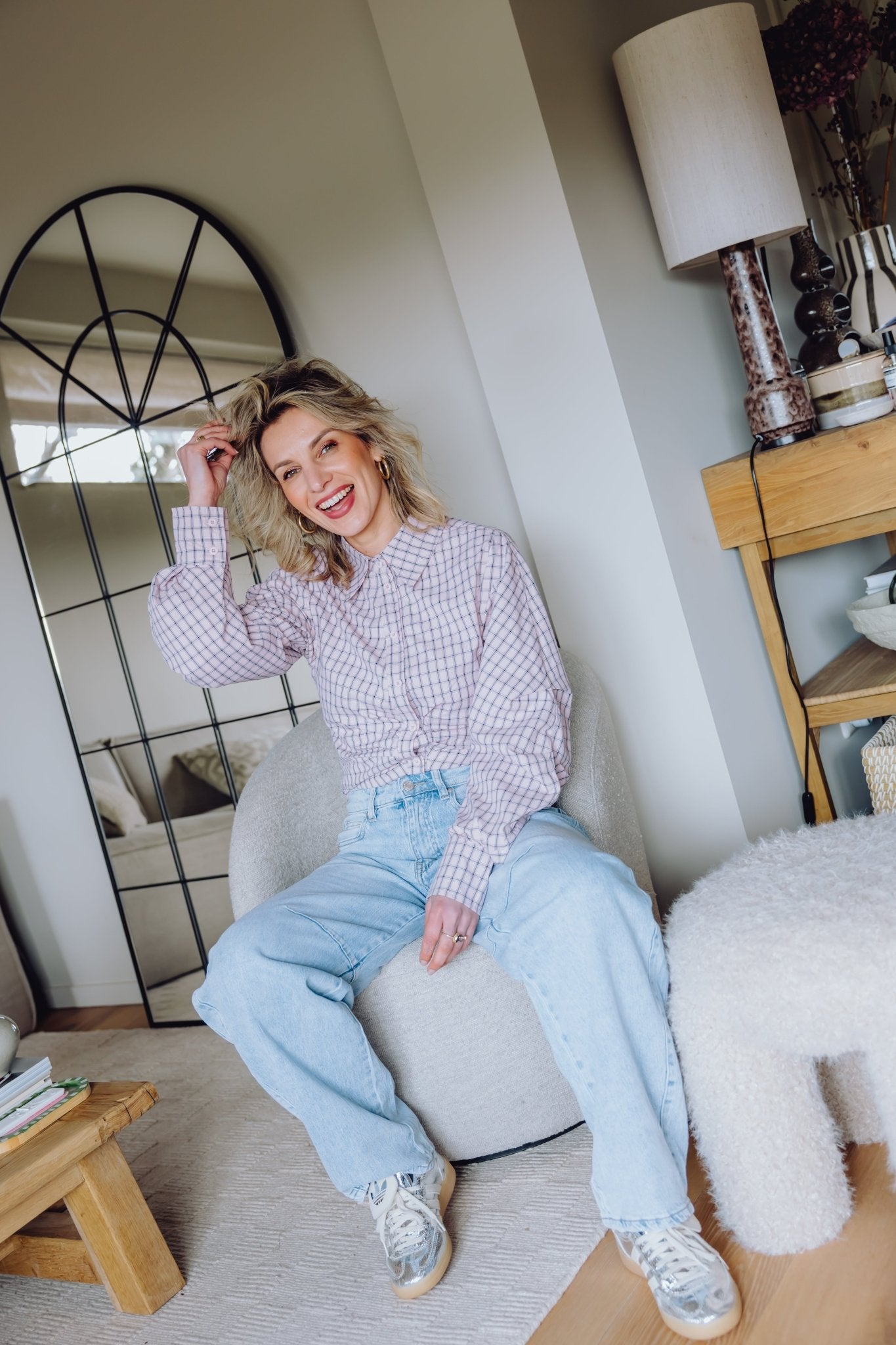 De Amerie Blouse in roze heeft een aangesloten pasvorm en een ruitjes patroon. Aan de zijkanten zitten geplooide details, waardoor de blouse mooi tailleert. De blouse heeft een kraagje en een knoopsluiting aan de voorkant. De stof voelt luchtig aan en draagt comfortabel.