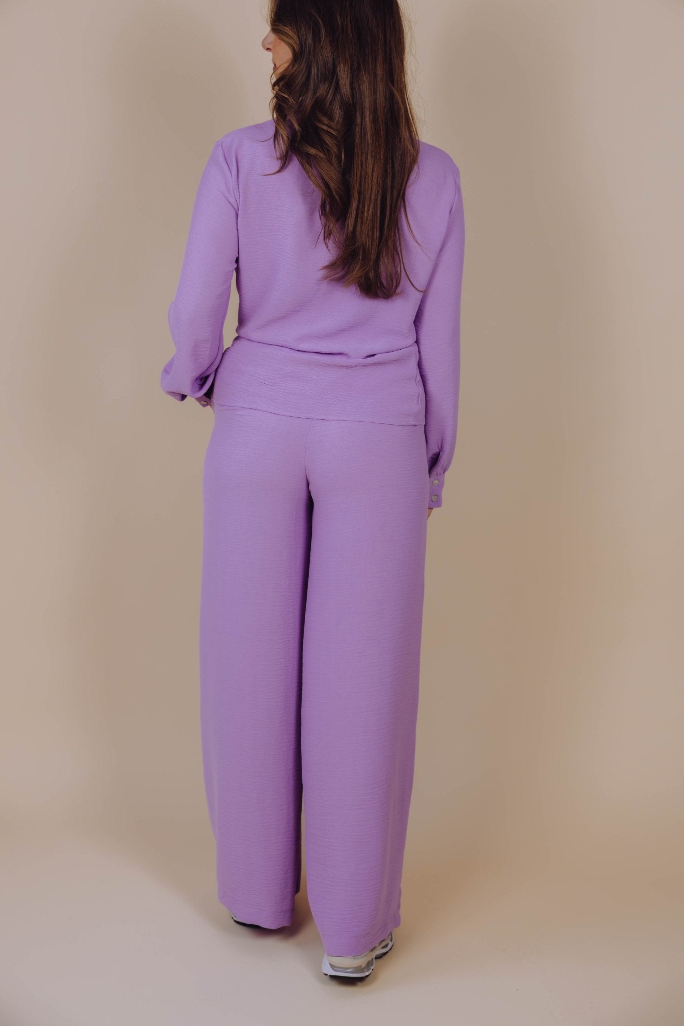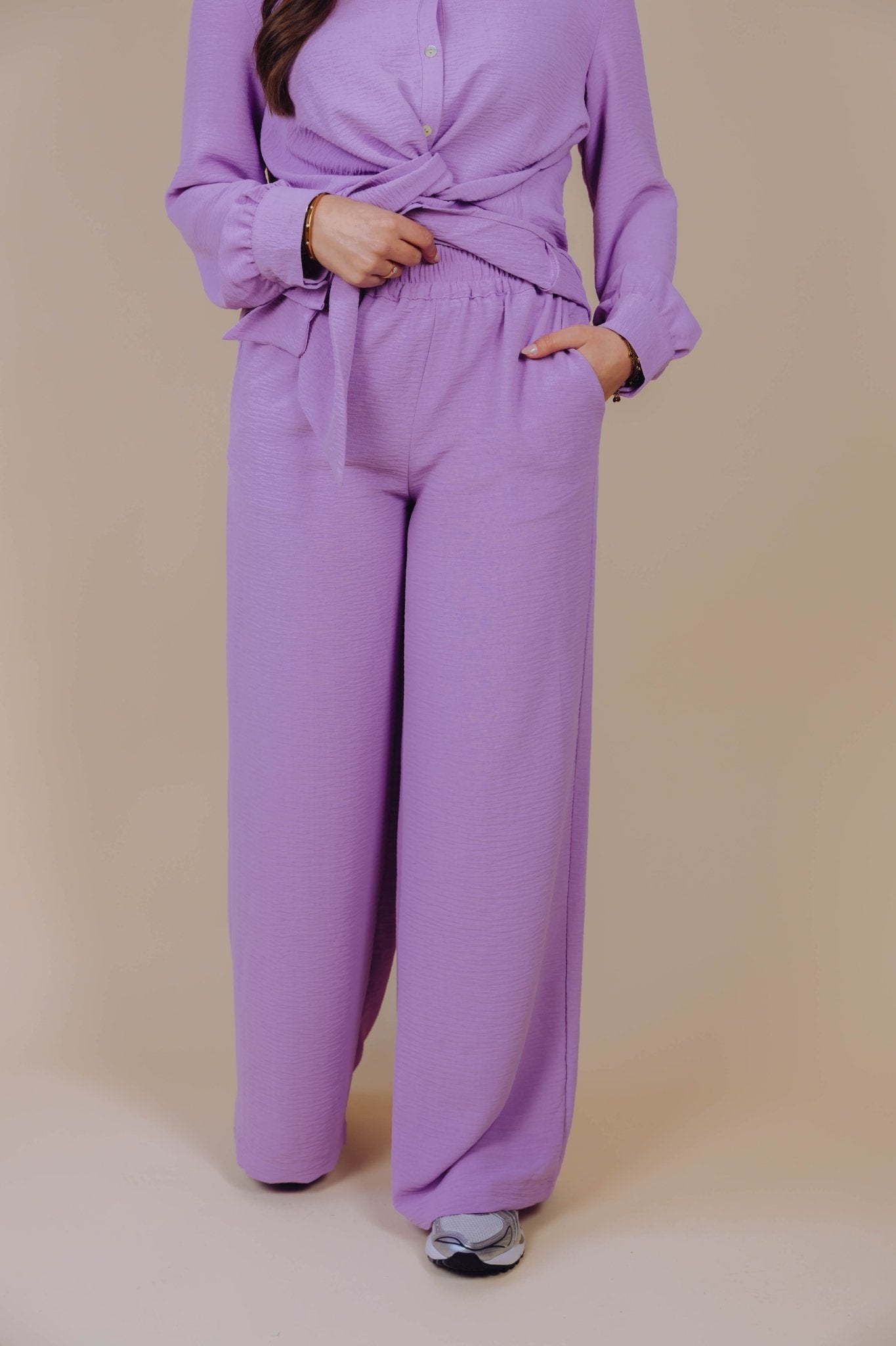 De Nessa Pants in lila is een wide leg broek met een comfortabele pasvorm. De elastische tailleband zorgt ervoor dat de broek prettig zit en makkelijk aan te trekken is. Aan de zijkanten zitten twee steekzakken voor een praktisch detail.