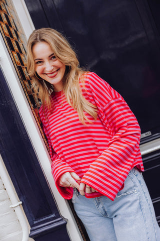 De Marais Longsleeve in oranje met roze is een top met een iets wijder model. De top is gemaakt van een stretchy stof, heeft lange mouwen met een hoge, ronde halslijn en een streep patroon. Op de achterkant staat een kleurrijke backprint met de tekst " Le Marais". Deze lange mouwen top is perfect om laagjes mee te creëren in het najaar.