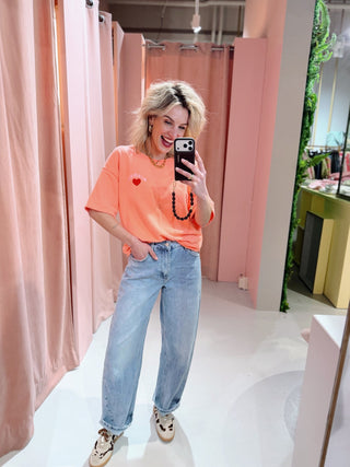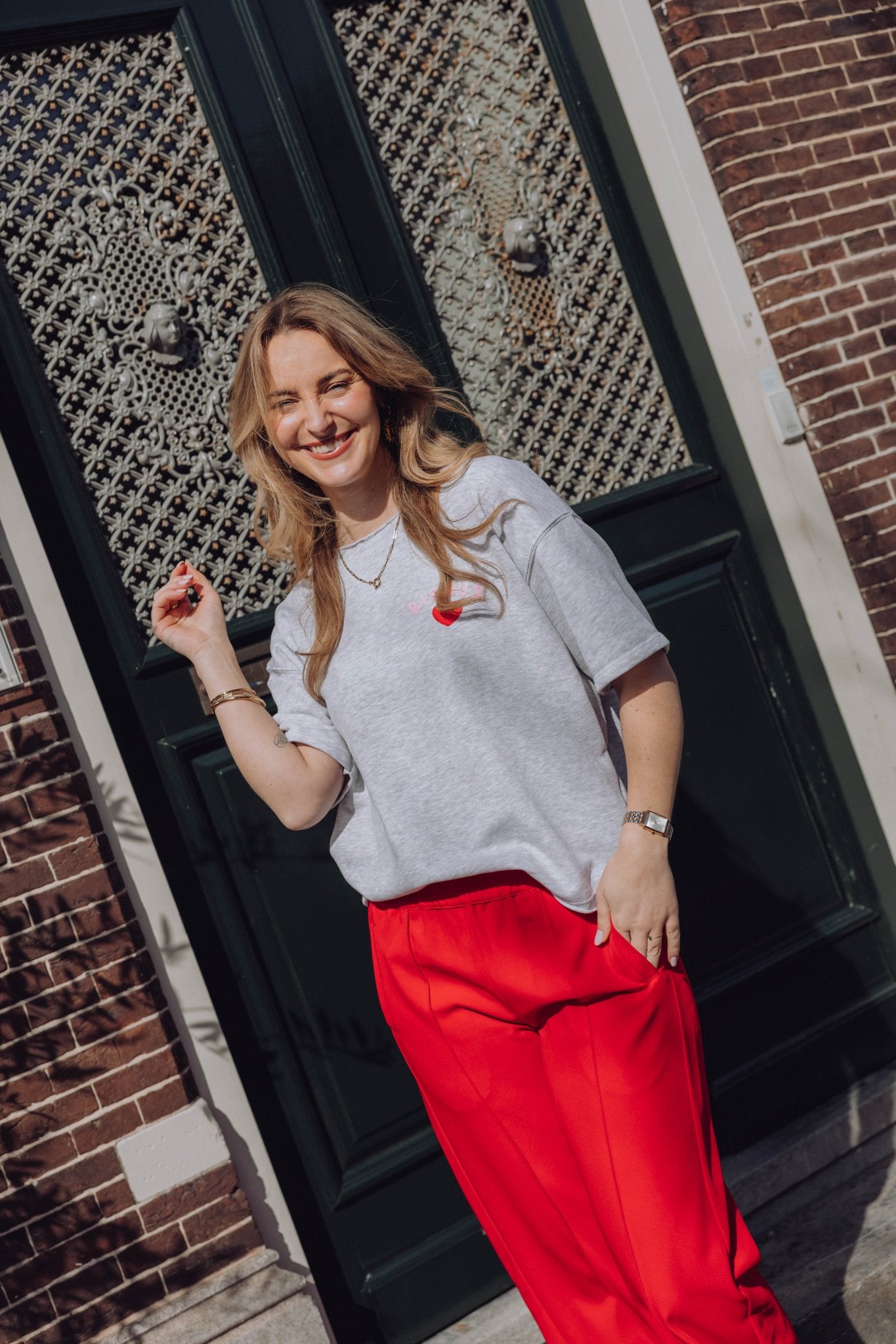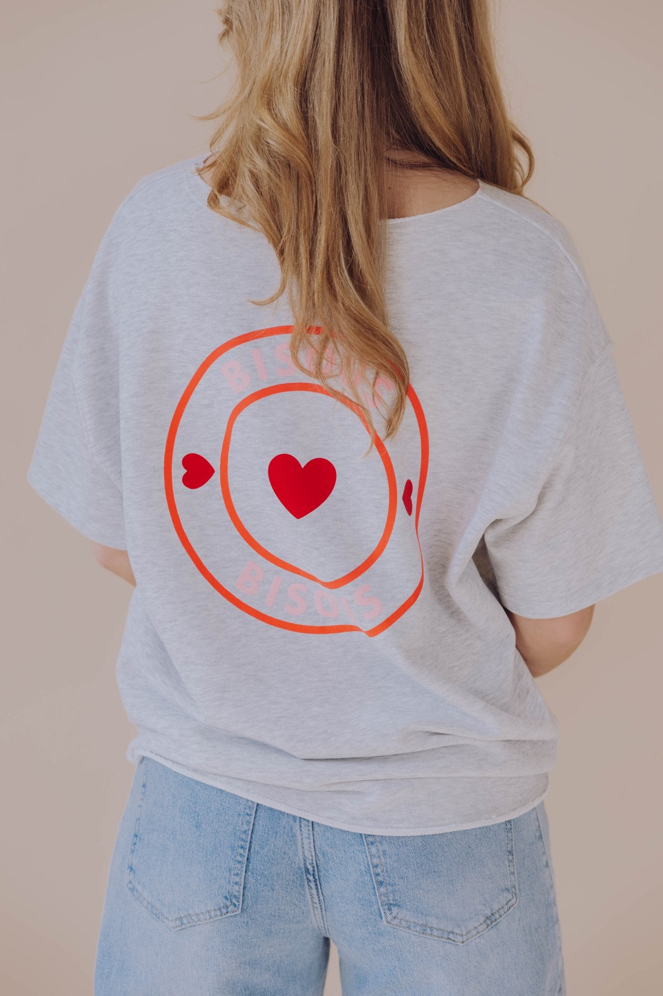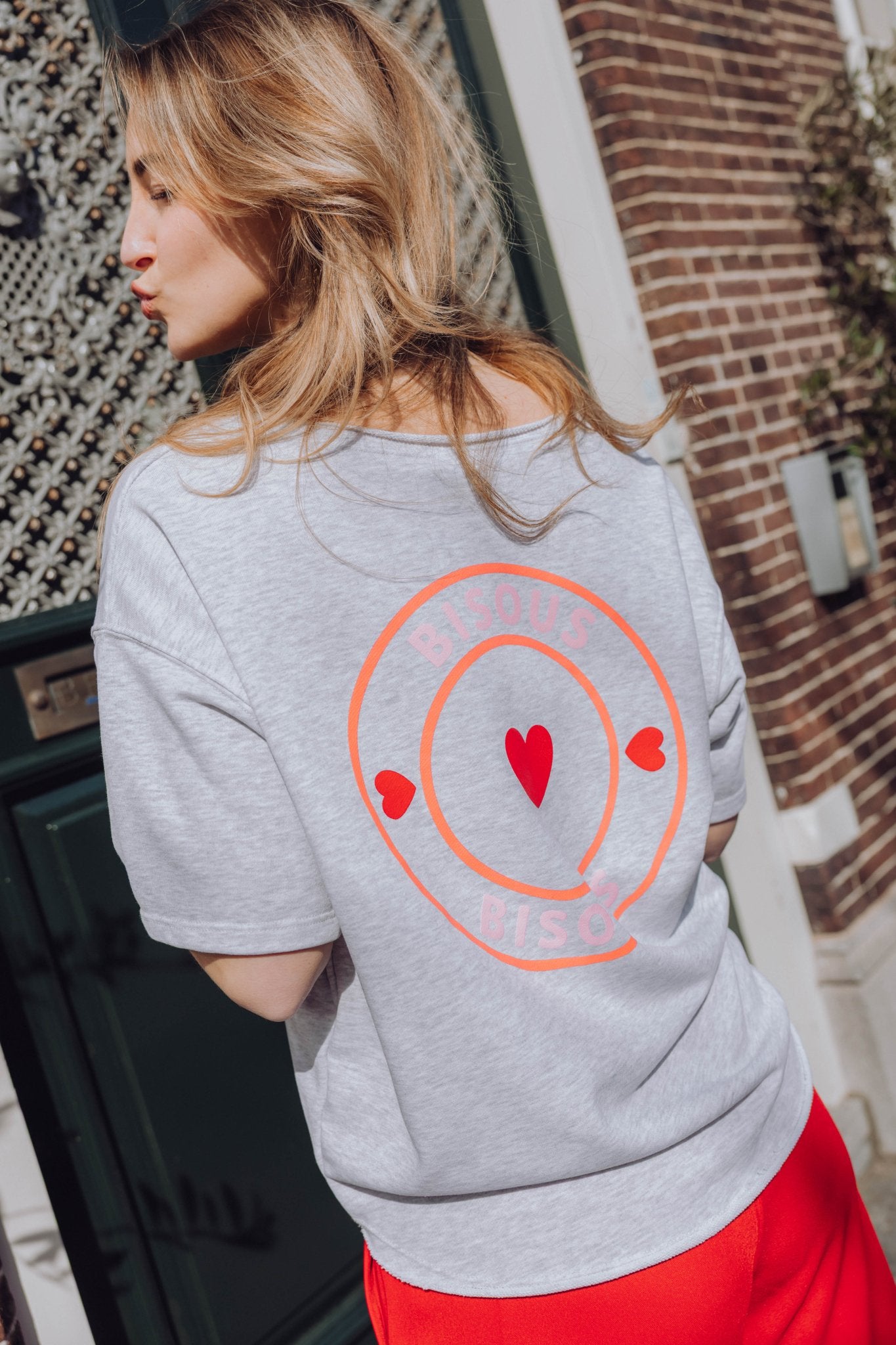 De Bisous Tee in grijs is een top met een iets wijder model. De top is gemaakt van sweat stof, heeft korte mouwen met een ronde halslijn en een opdruk op de borst en de rug. Deze korte mouwen top is perfect voor het komende seizoen!