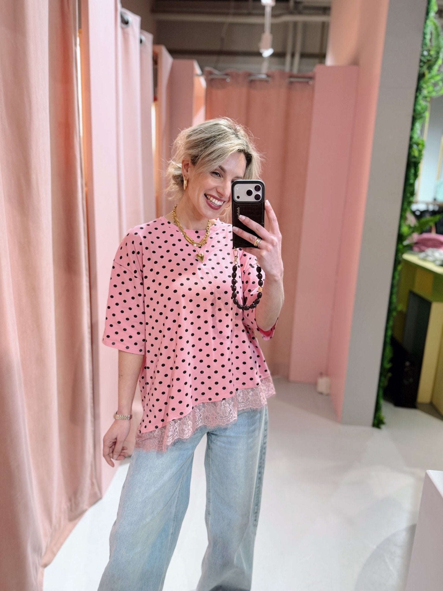 Dit loose fit T-shirt in het roze is een perfecte mix van speels en vrouwelijk. De stippenprint geeft een vrolijke touch, terwijl het kanten detail aan de onderkant zorgt voor een vrouwelijke touch.
