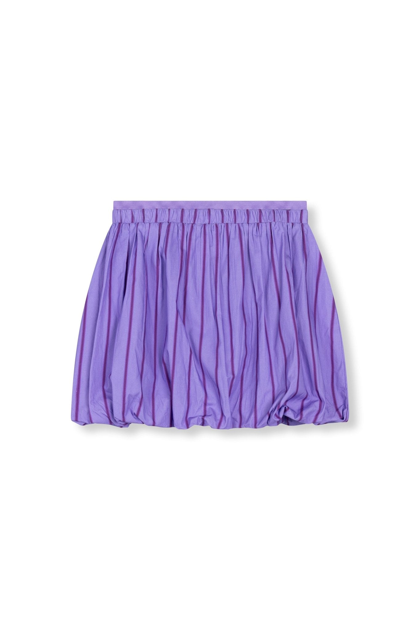 Deze korte balloon rok is gemaakt van 100% katoen met een subtiel streeppatroon. De rok heeft een dubbele elastische tailleband, waardoor hij fijn aansluit en makkelijk zit. Aan de onderkant is extra elastiek verwerkt, wat zorgt voor een balloon effect en extra volume.