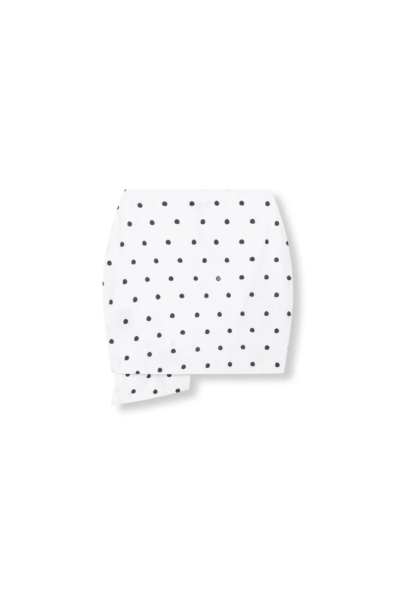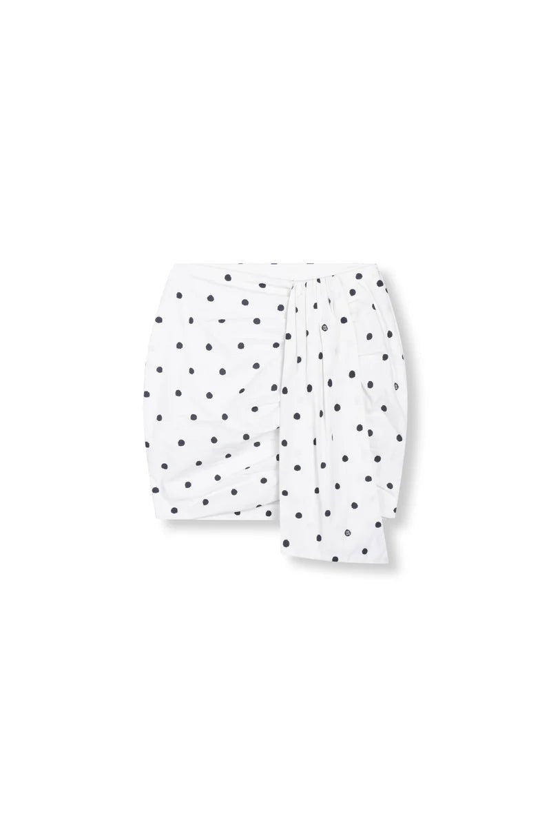 De Leah Skirt is een mini rok met een aangesloten pasvorm en een speelse all-over polkadot print. Het model is ontworpen met een lange strikband aan de voorkant en een subtiel geplooid effect eronder, wat zorgt voor een mooi vallend detail en een flatterende look.