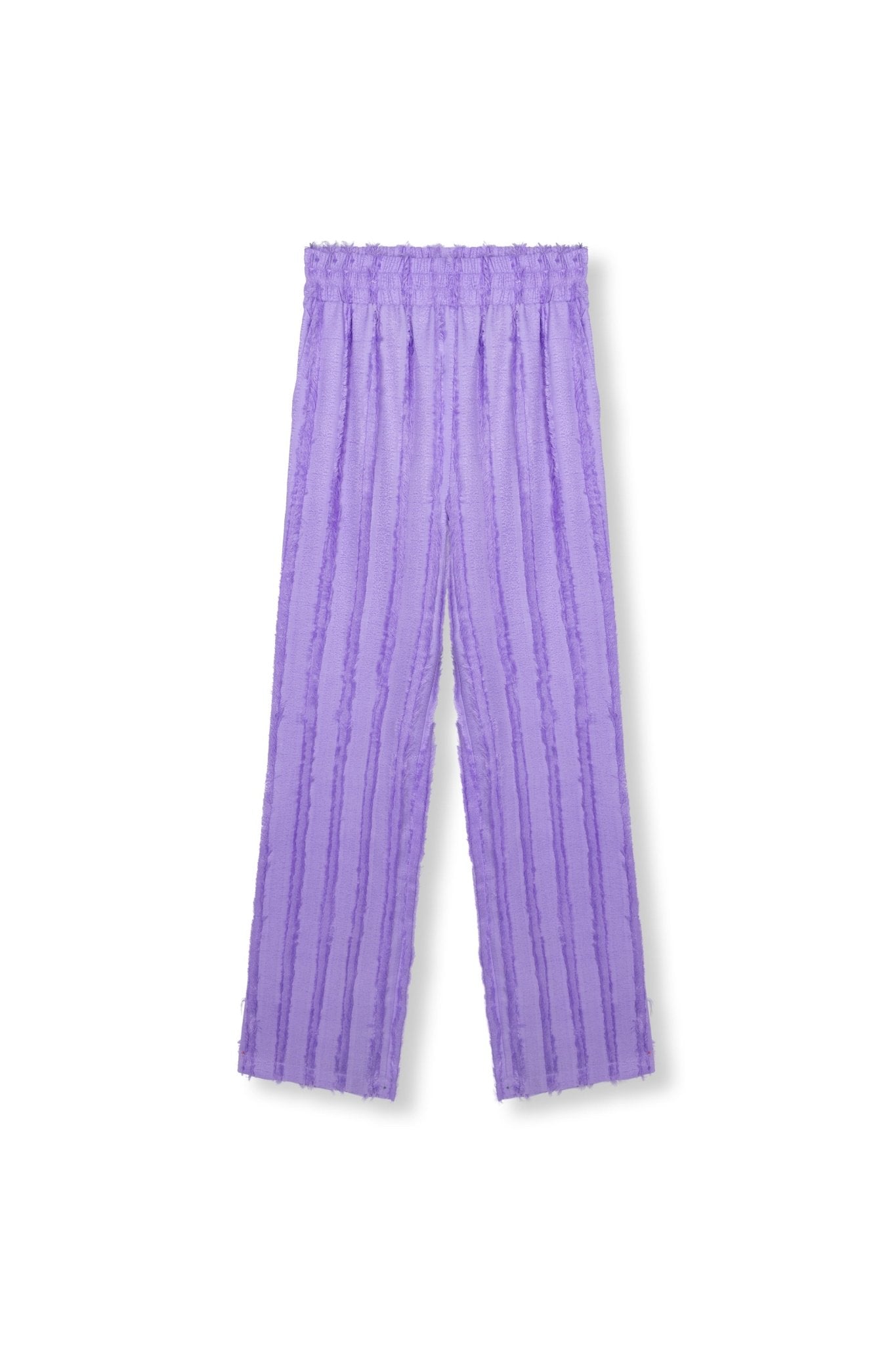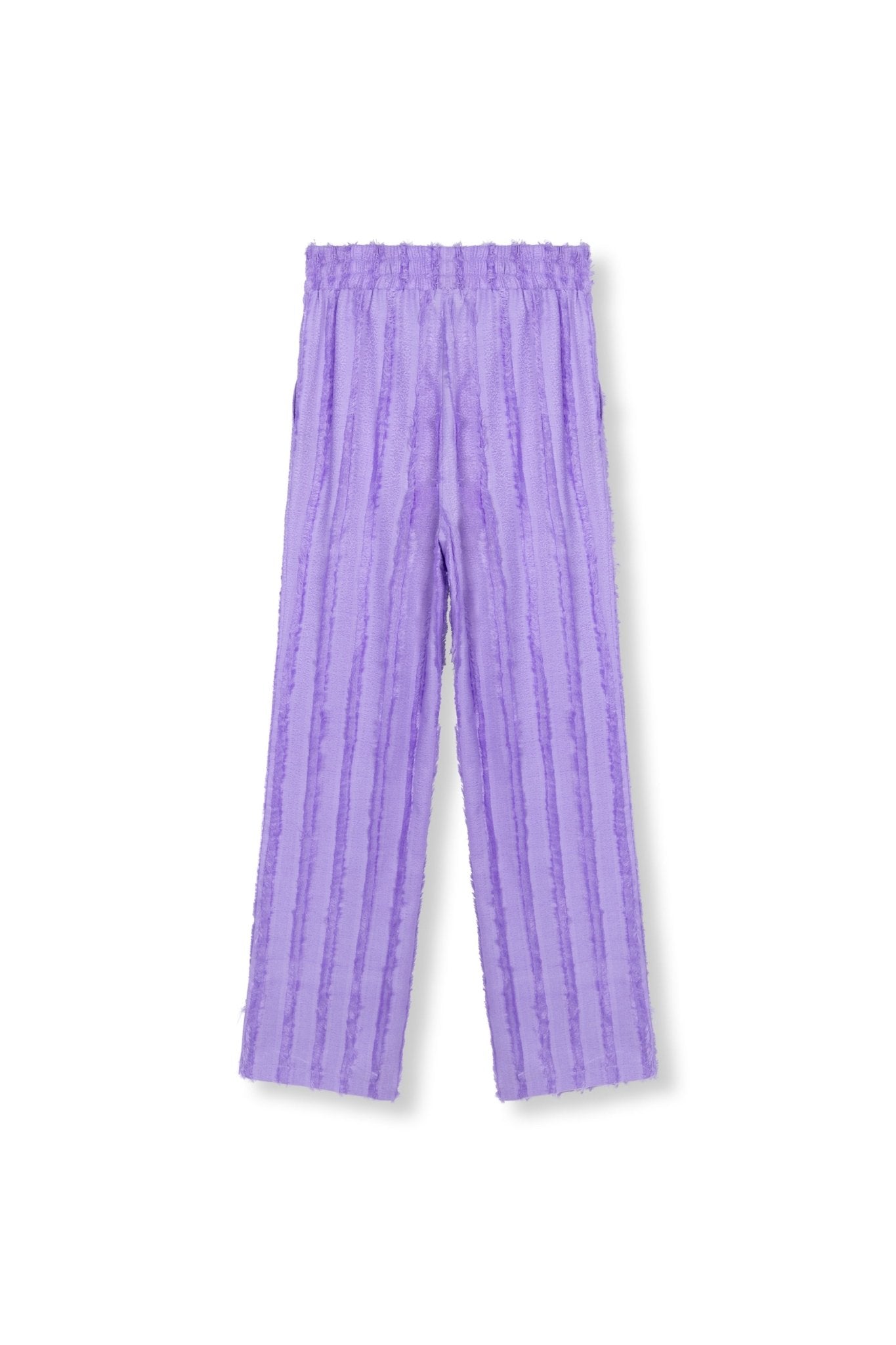 • Deze paarse broek heeft een elastische tailleband en valt lekker los. De stof is licht en heeft een speelse structuur met verticale lijnen, wat de kleur extra laat knallen. De broek zit soepel, beweegt fijn mee en voelt luchtig aan. Een leuk item dat meteen opvalt door de kleur en textuur.
