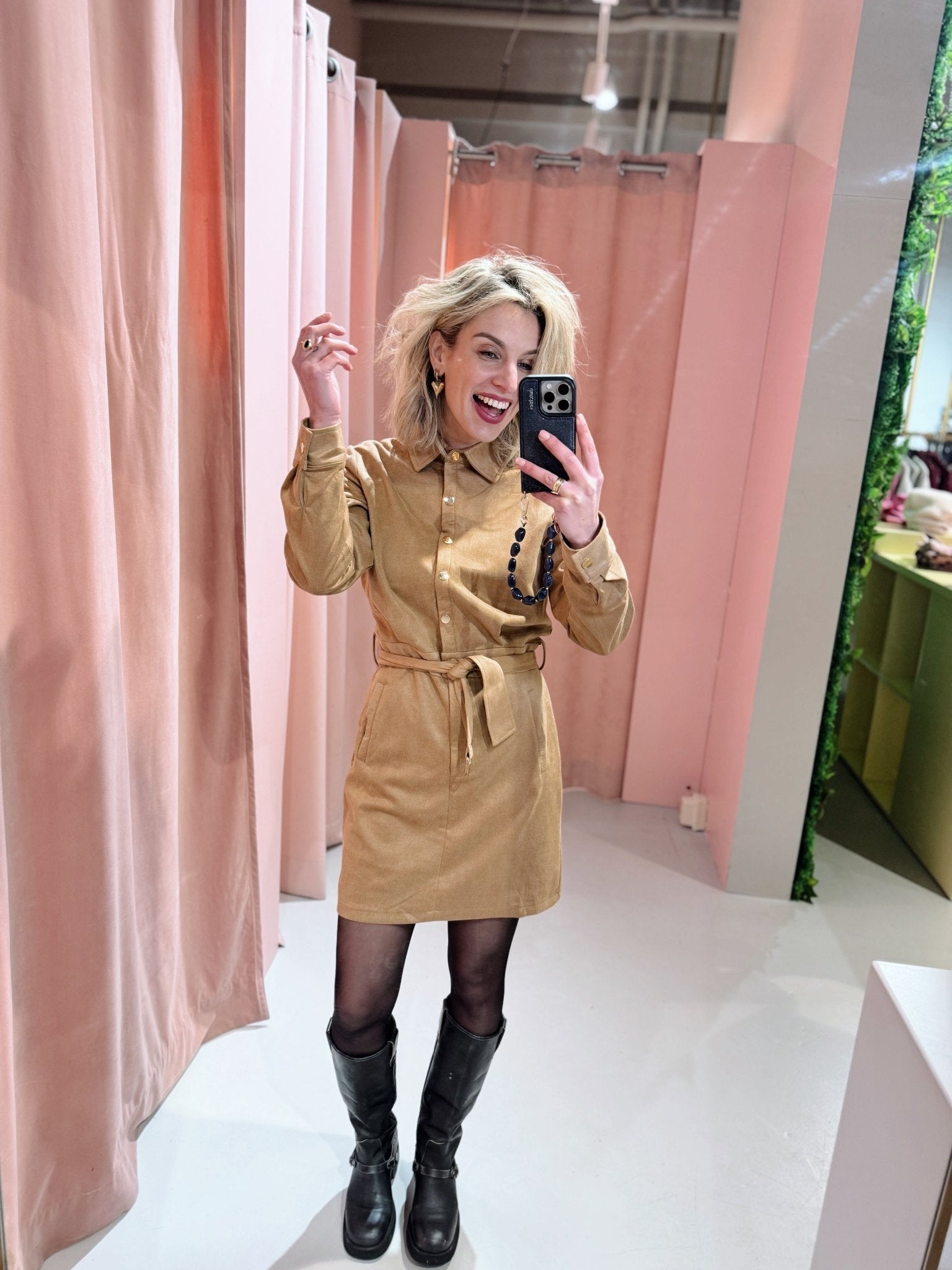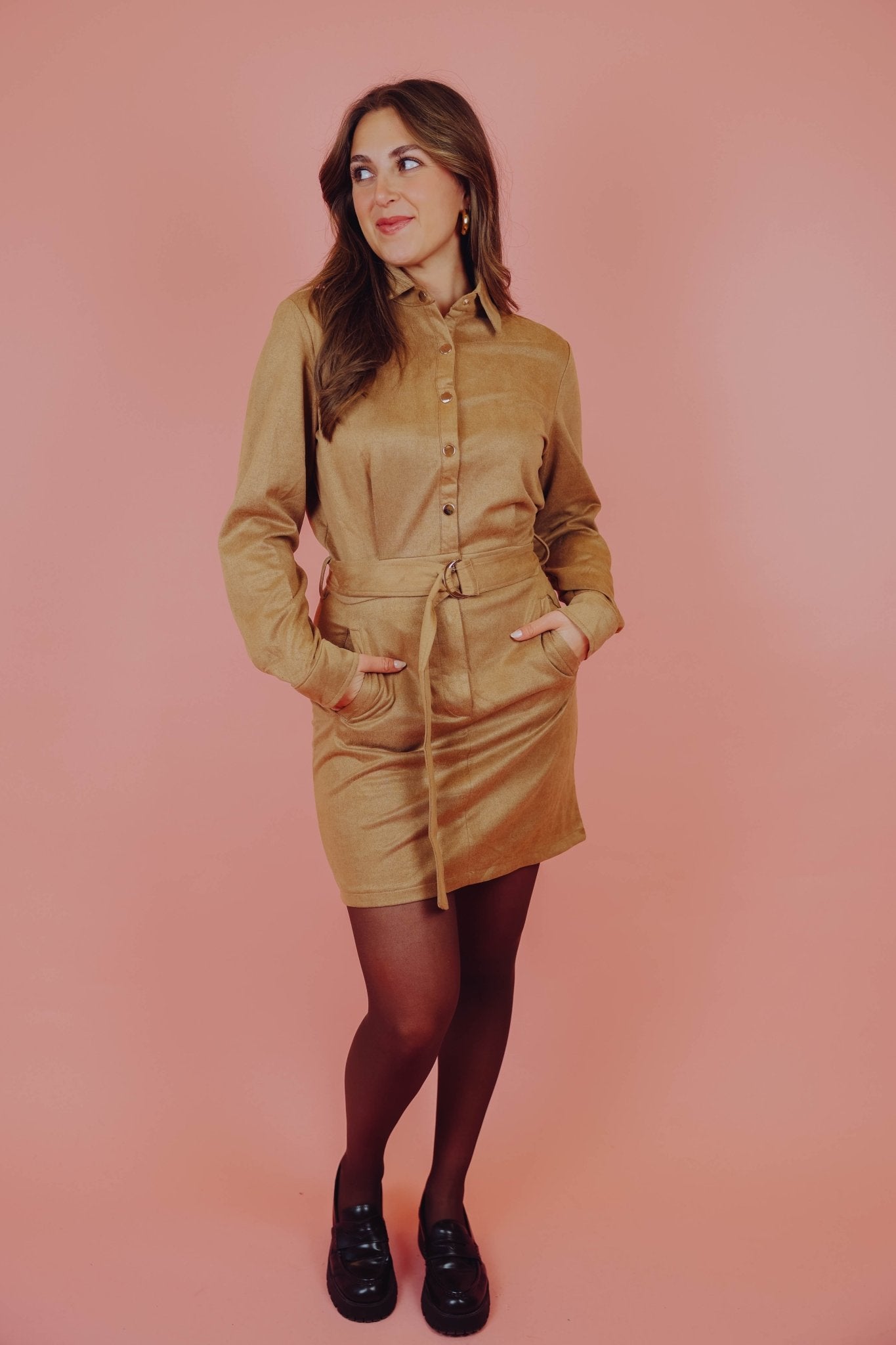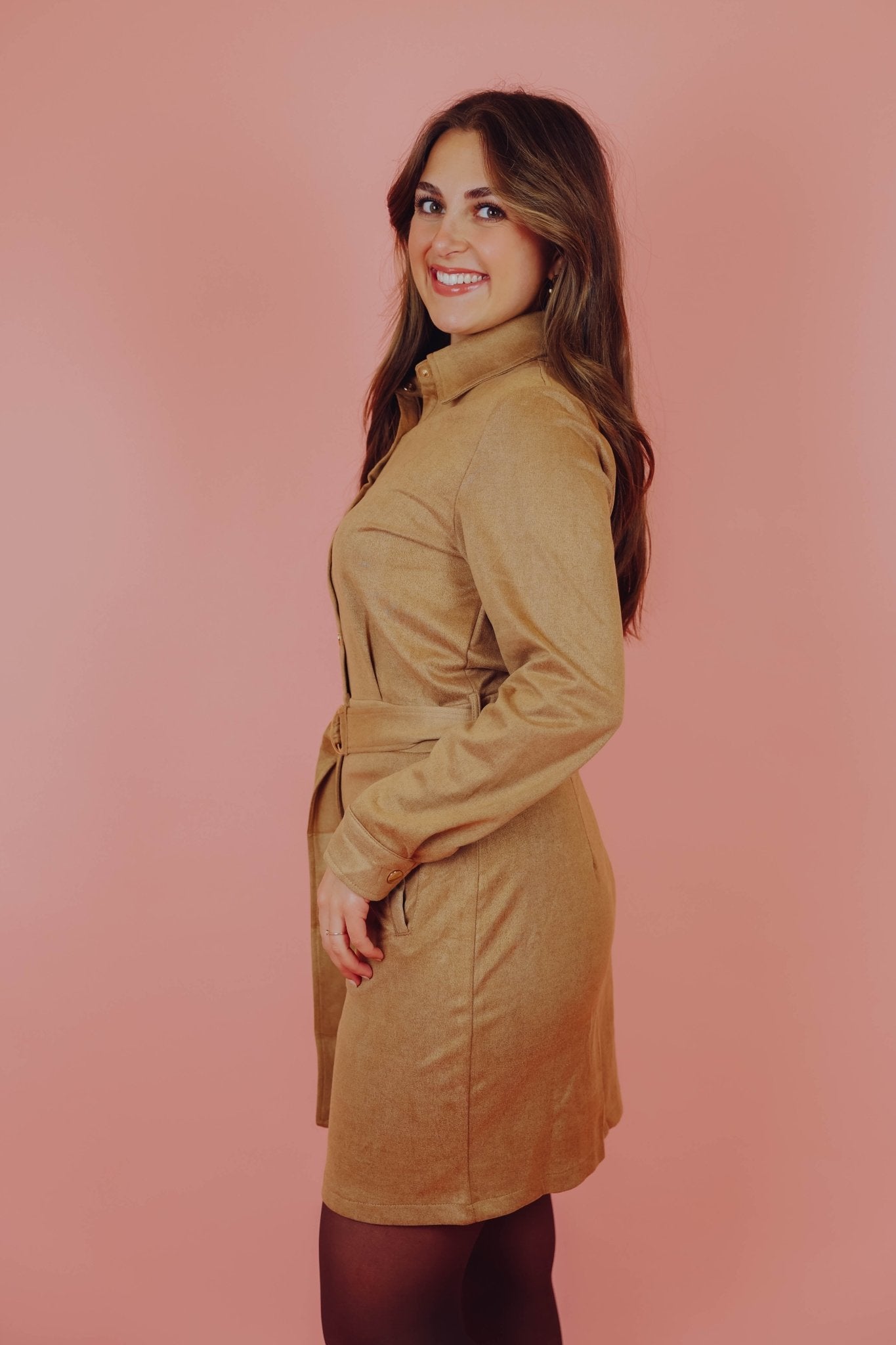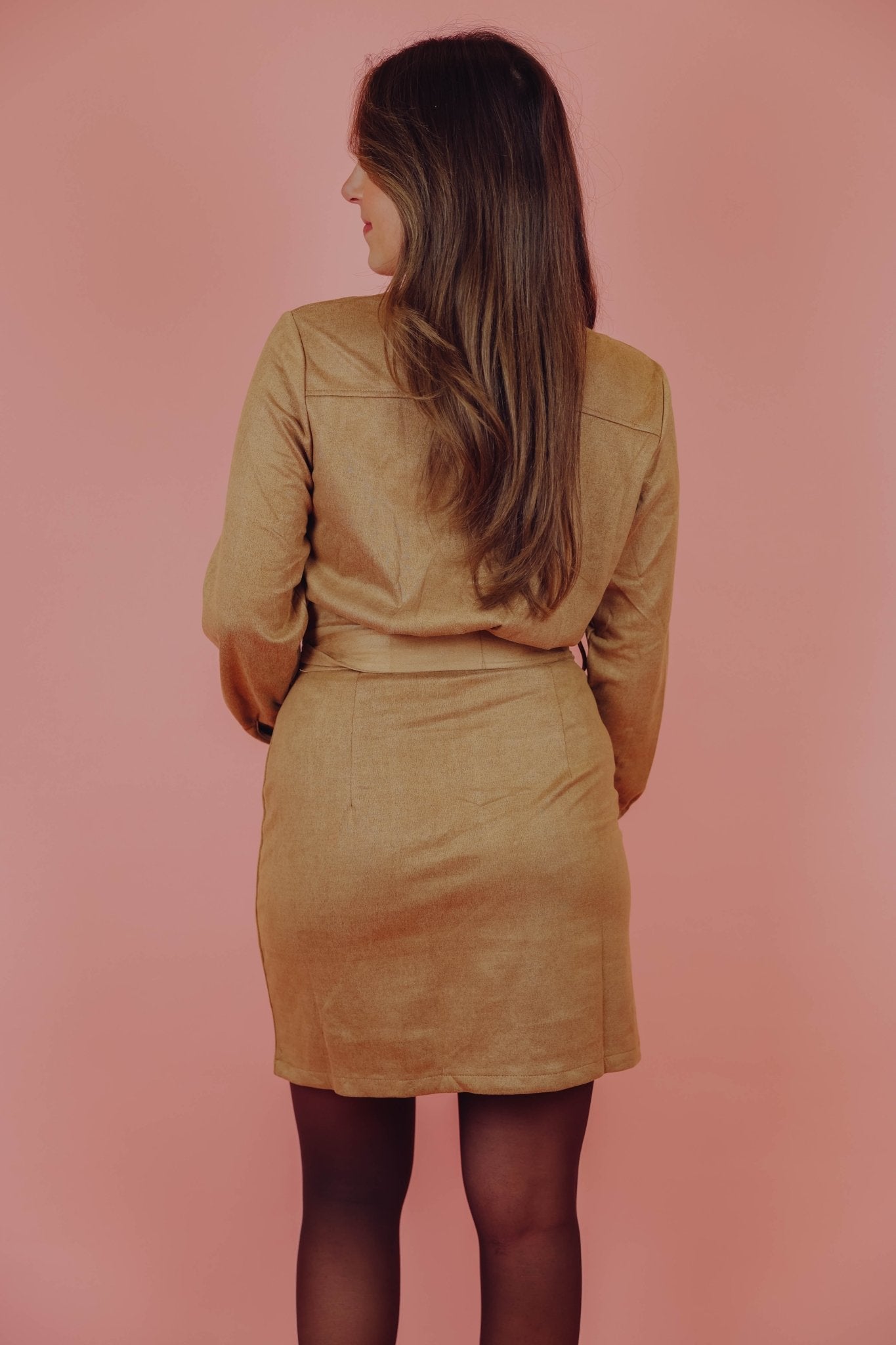 Onze bestseller is terug! De Tarah Dress in camel is een suède-look jurk met lange mouwen en twee steekzakken. De jurk is voorzien van een kraagje en een knoopsluiting en wordt geleverd met een bijpassende tailleband.