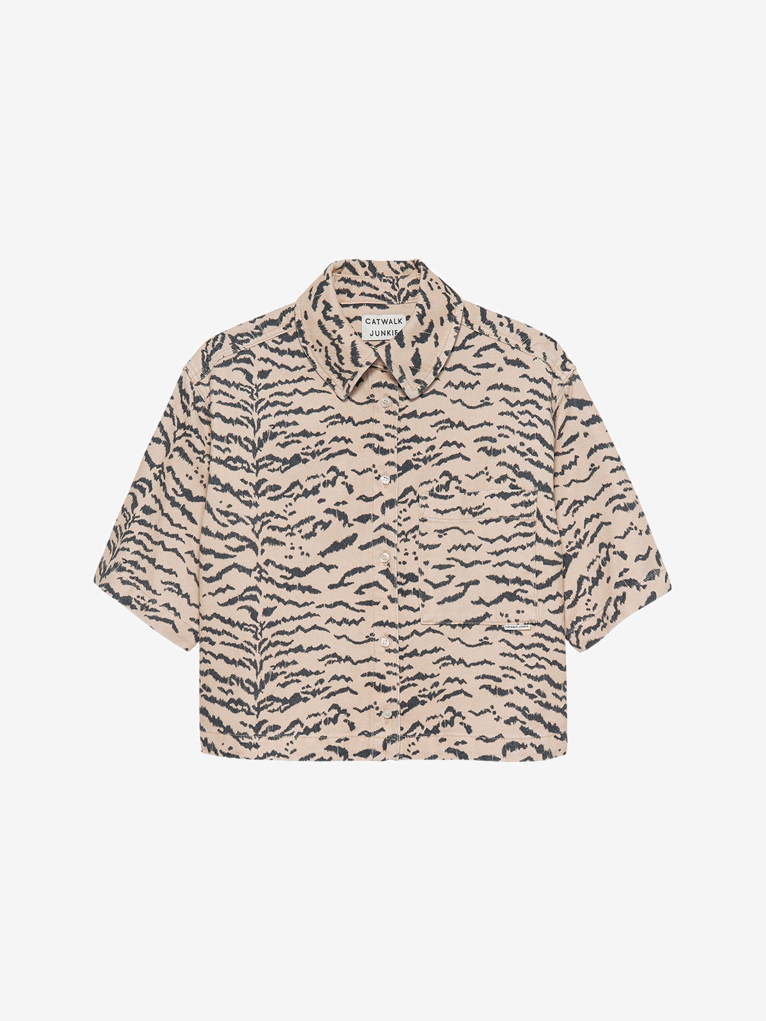 Deze blouse is voorzien van een all-over animalprint en een rechte, losse fit. Het model heeft korte mouwen en een klassieke kraag met knoopsluiting aan de voorkant. De stof voelt licht aan en draagt prettig, ideaal voor dagelijks gebruik. Door de print en het korte model is dit een opvallend item dat makkelijk te combineren is binnen je garderobe.