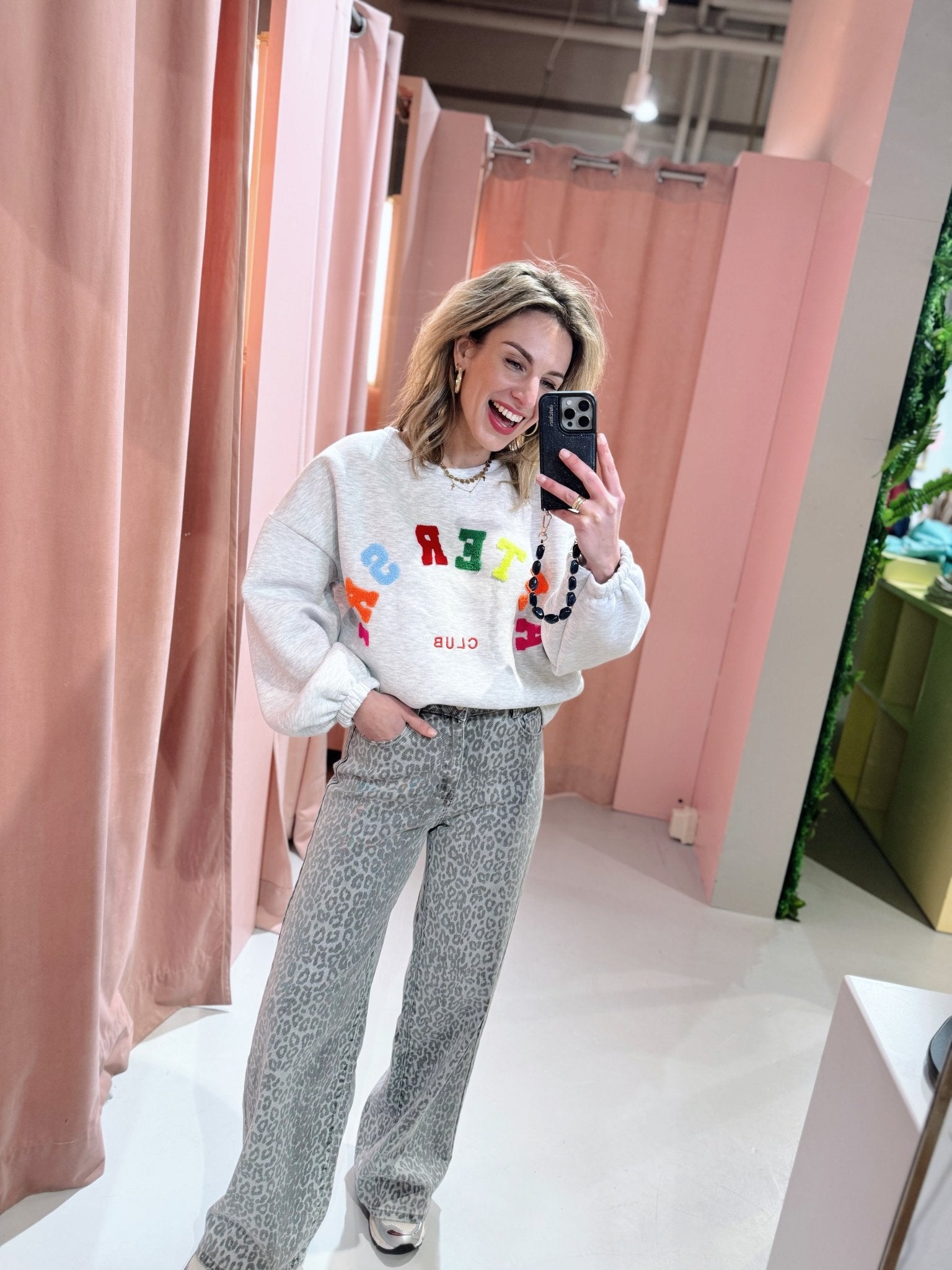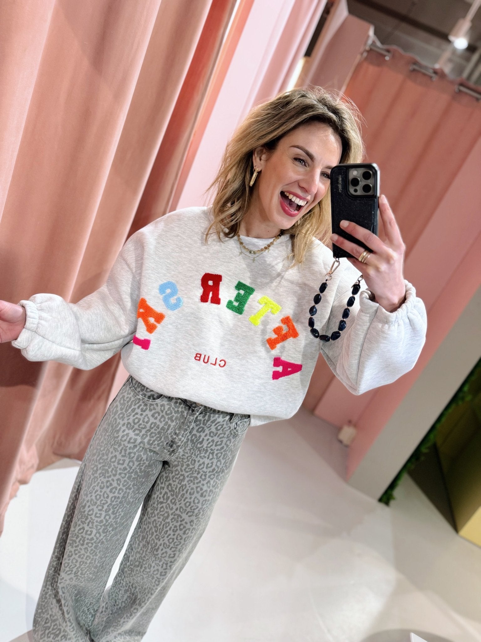 De After Ski Sweater in grijs is een oversized trui met lange mouwen en een ronde halslijn. De trui heeft een losse pasvorm en is voorzien van een kleurrijke teddy opdruk op de voorkant.
