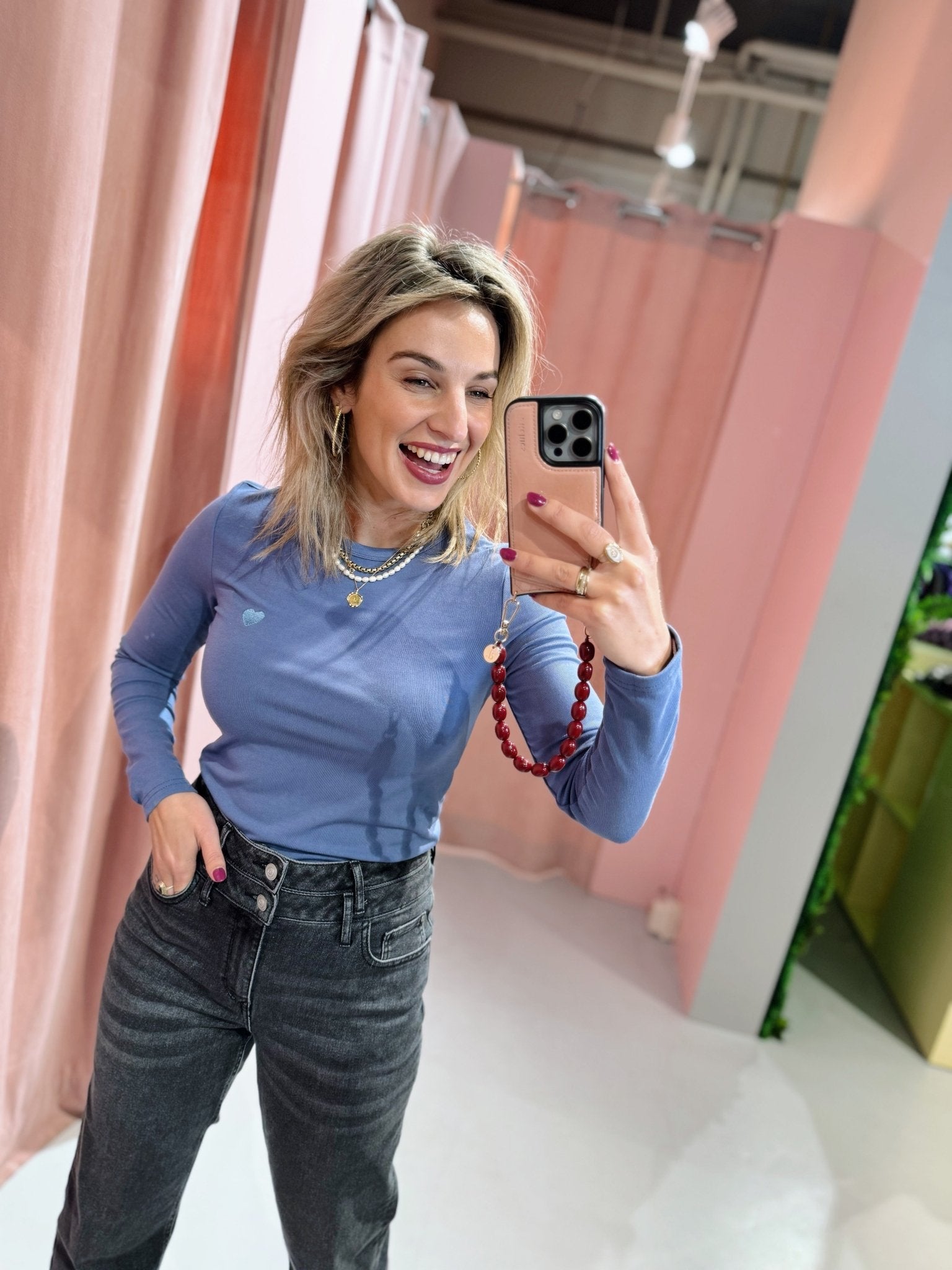 De Aimee Longsleeve in blauw is een top met een aansluitend model. De top is gemaakt van een stretchy stof, heeft lange mouwen met een hoge, ronde halslijn en een geborduurd hartje op de borst. Deze lange mouwen top is perfect om laagjes mee te creëren in het najaar.