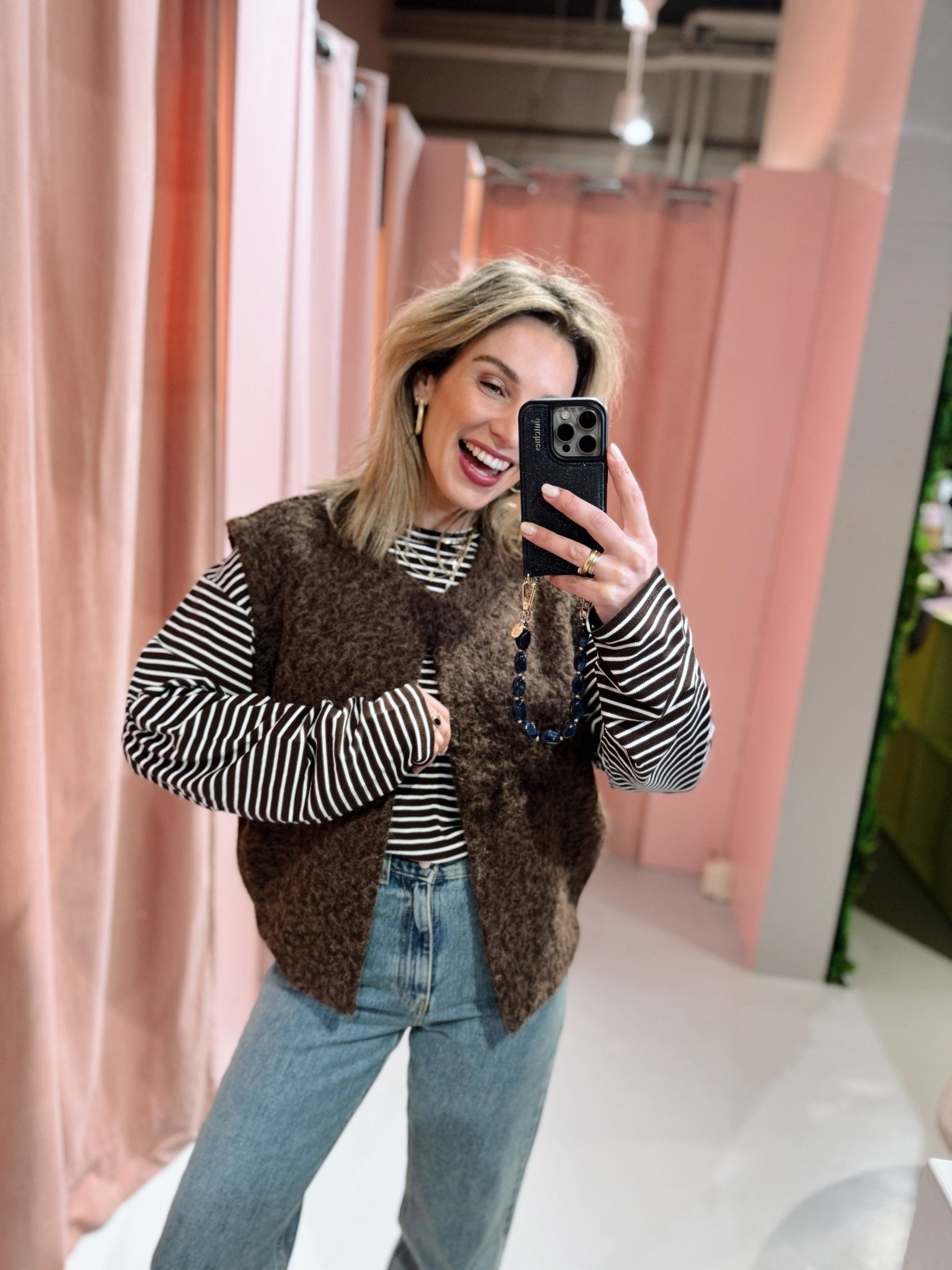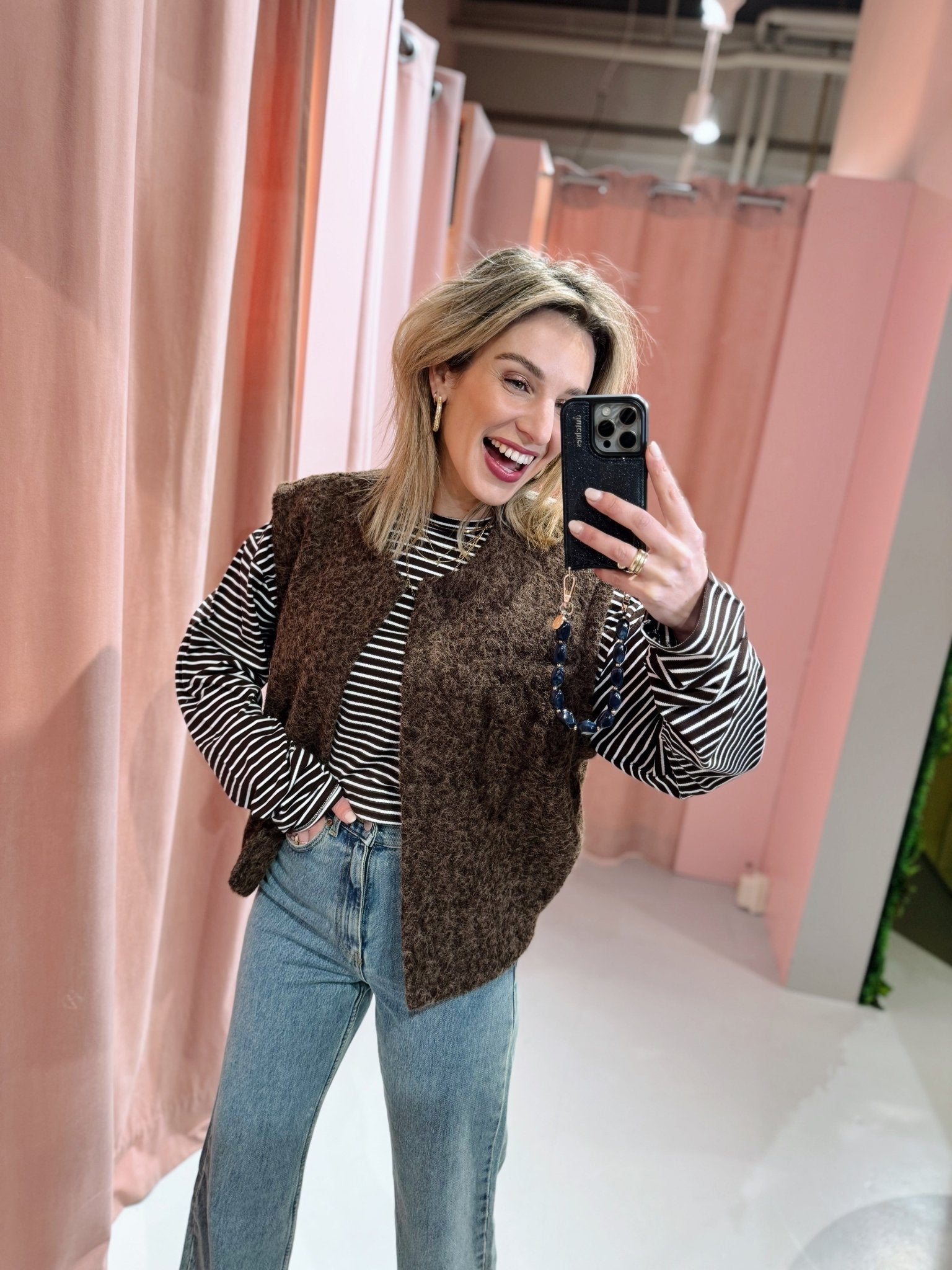 De Alice Gilet in bruin is gemaakt van een zachte, wollige stof, waardoor hij heerlijk warm is! Het gilet is mouwloos en is leuk te combineren met één van onze longsleeves.