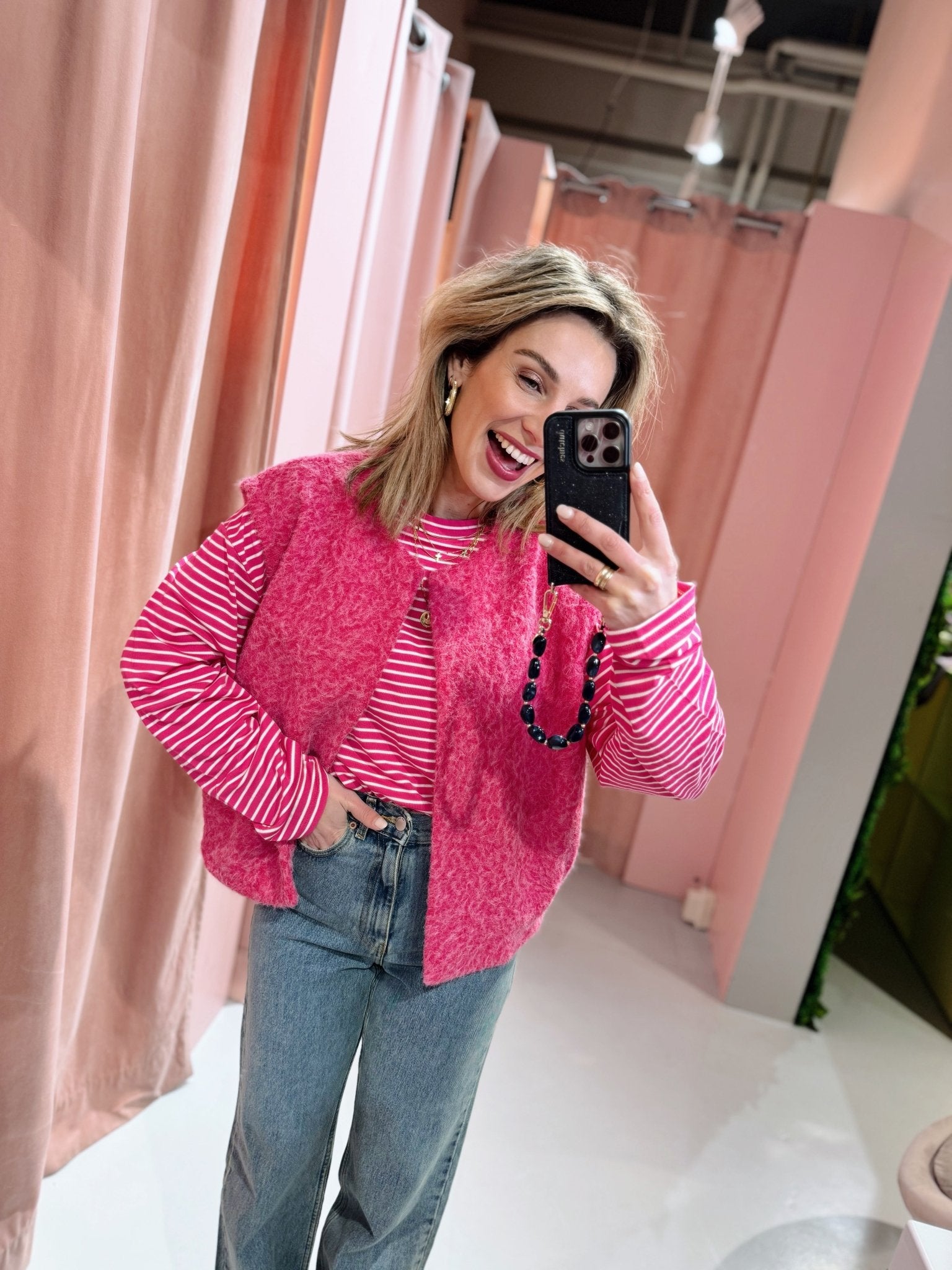 De Alice Gilet in roze is gemaakt van een zachte, wollige stof, waardoor hij heerlijk warm is! Het gilet is mouwloos en is leuk te combineren met één van onze longsleeves.