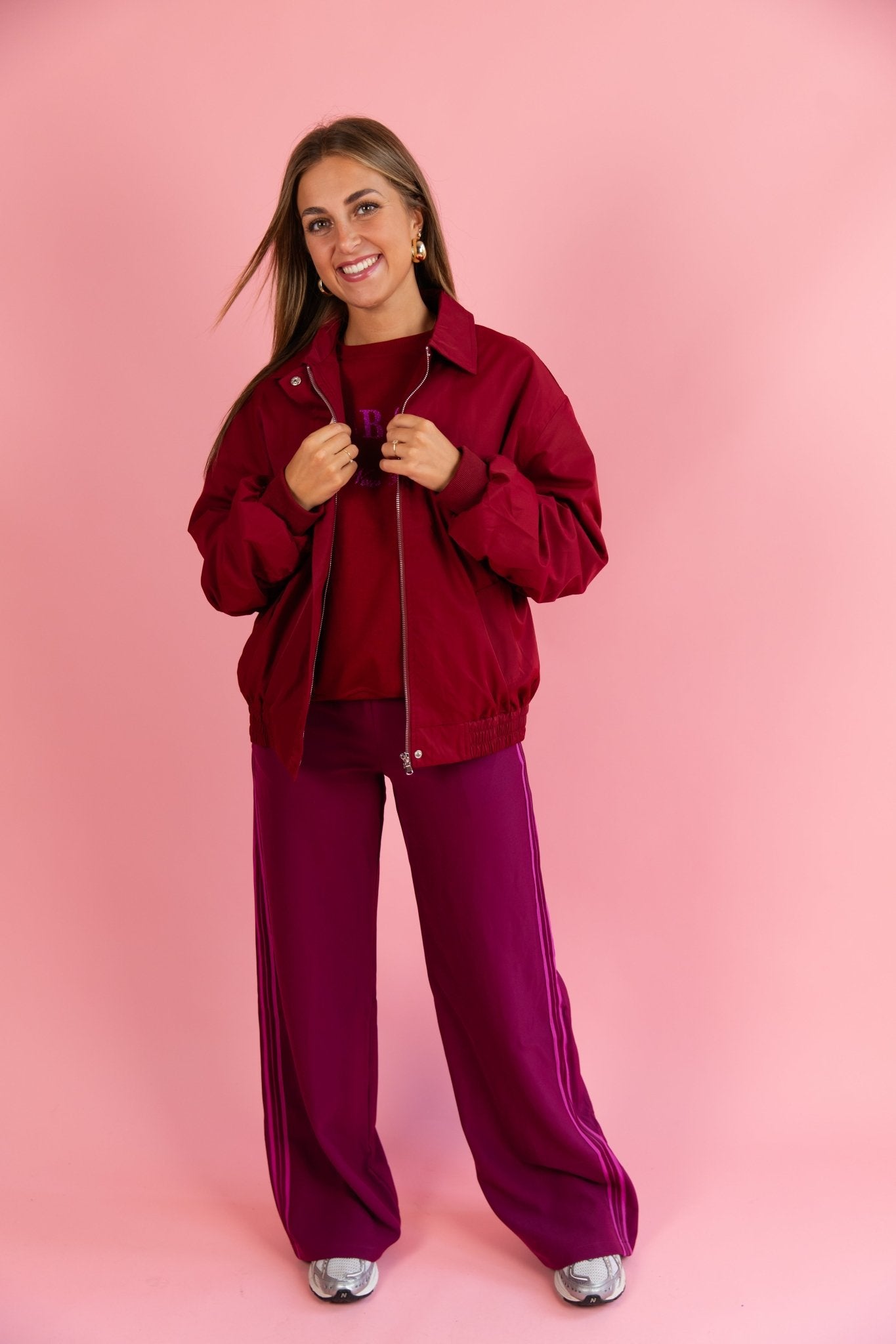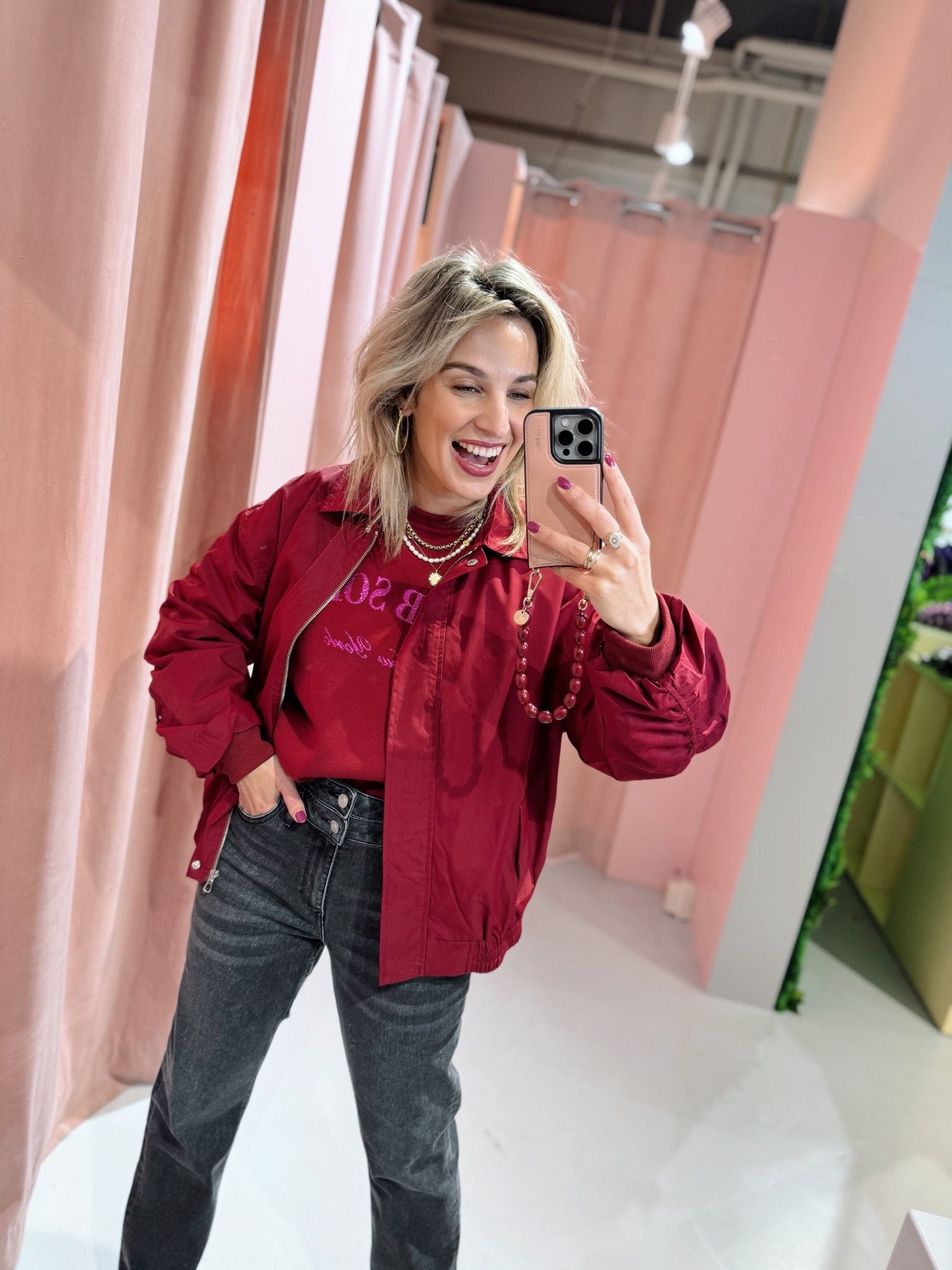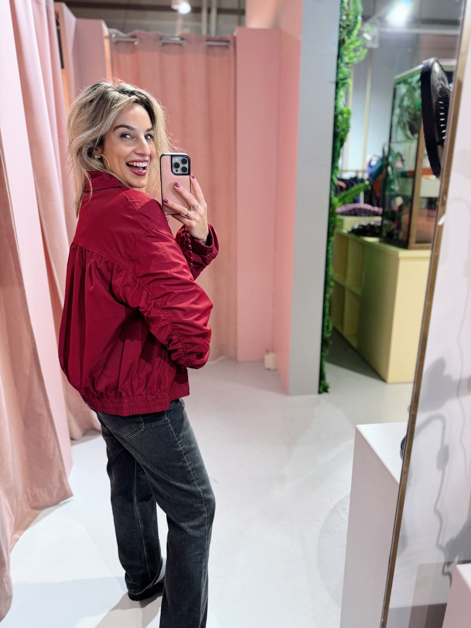 De Alix Bomber in bordeaux is fijn tussenjasje gemaakt van een gladde stof met geplooide details op de mouwen. Het jasje heeft een oversized model en heeft een kraagje. Daarnaast is het jasje voorzien van twee steekzakken en is hij gemakkelijk te sluiten door middel van de ritssluiting aan de voorkant.