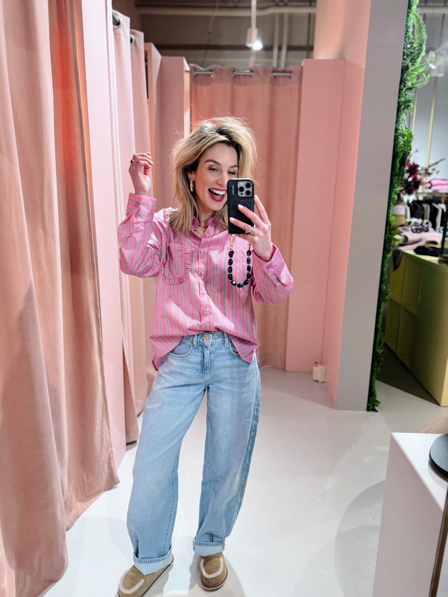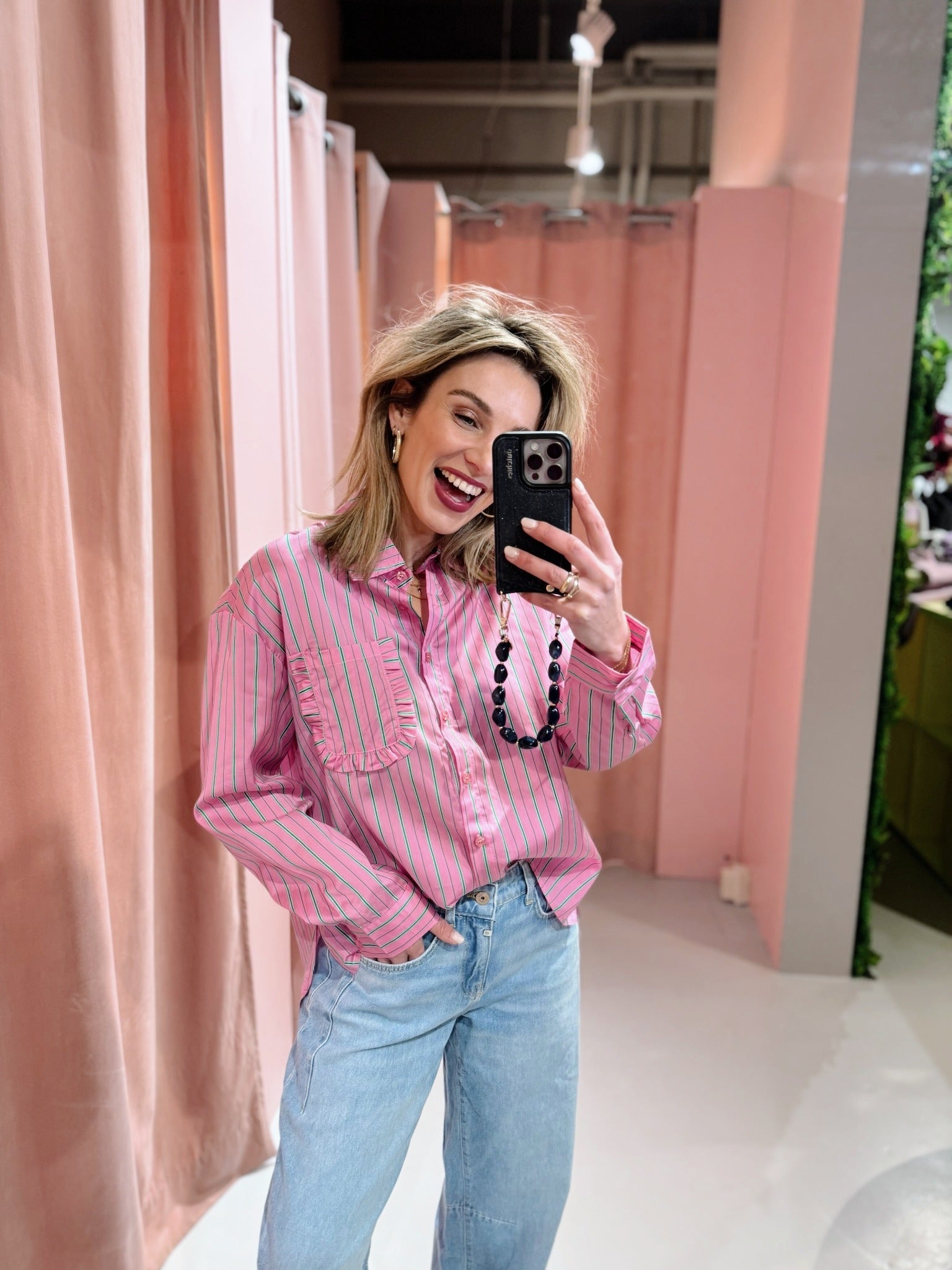 De Amanda Blouse in roze is een luchtige blouse en is voorzien van lange mouwen en een kraagje. Daarnaast heeft de blouse een streep patroon en een boxy fit. Je kunt de blouse gemakkelijk sluiten door middel van de knoopsluiting aan de voorkant. Wat deze blouse extra leuk maakt, is het borstzakje met ruches.