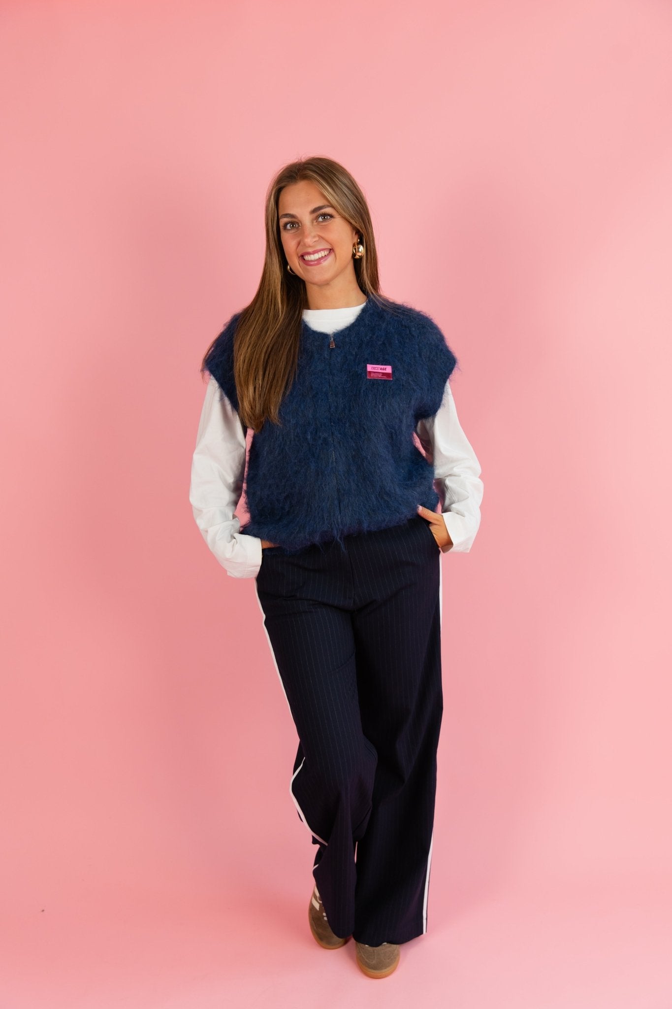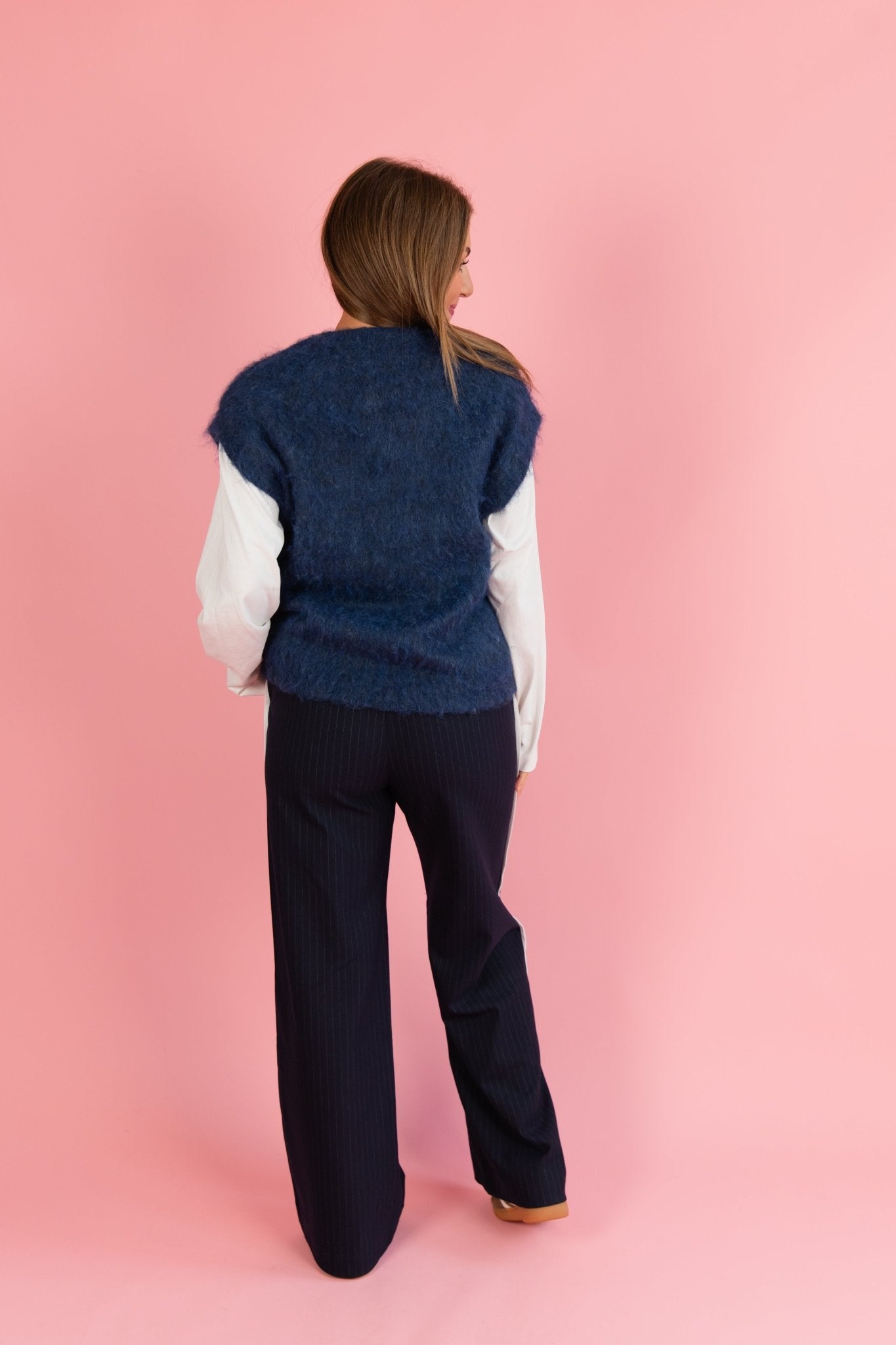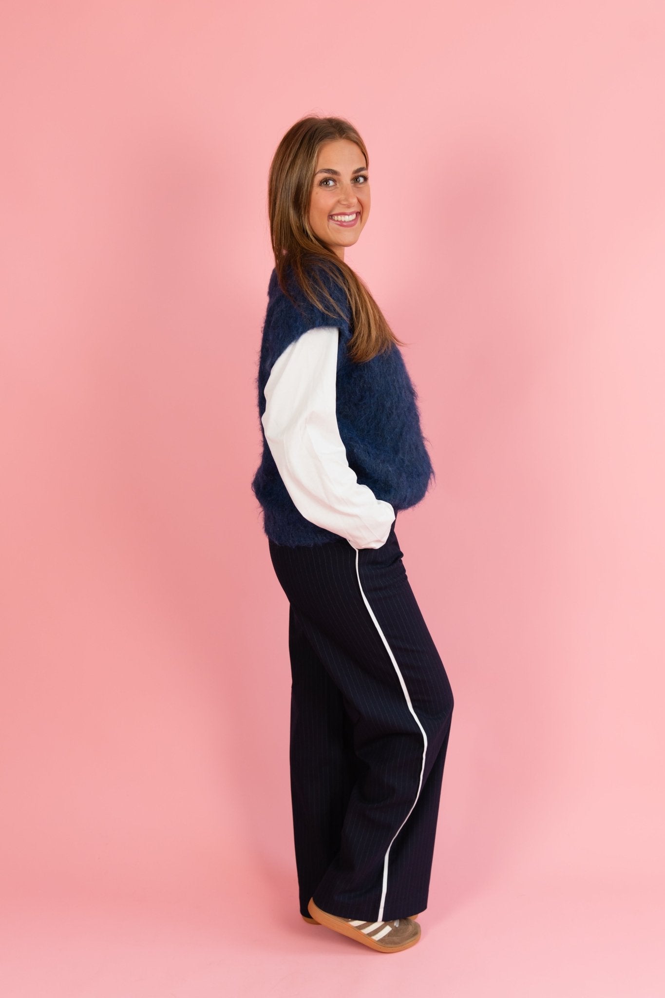 De Amanda Pants in navy is een wide leg pantalon met een knoopsluiting en twee steekzakken. De zijkant van de broek is voorzien van strepen, wat hem een stoere touch geeft. Daarnaast heeft deze broek riemlusjes, een elastisch detail aan de achterkant en een krijt streepje.