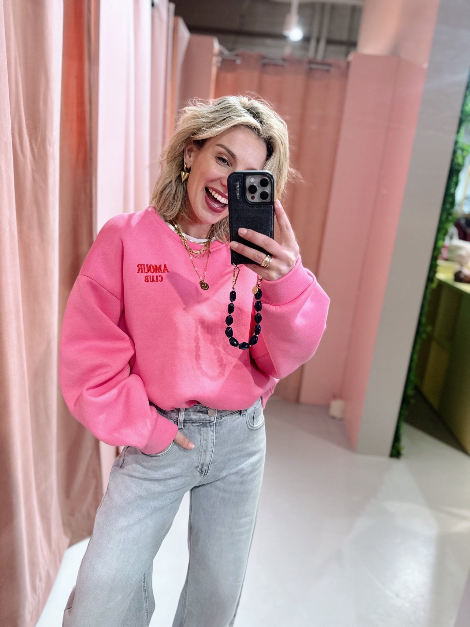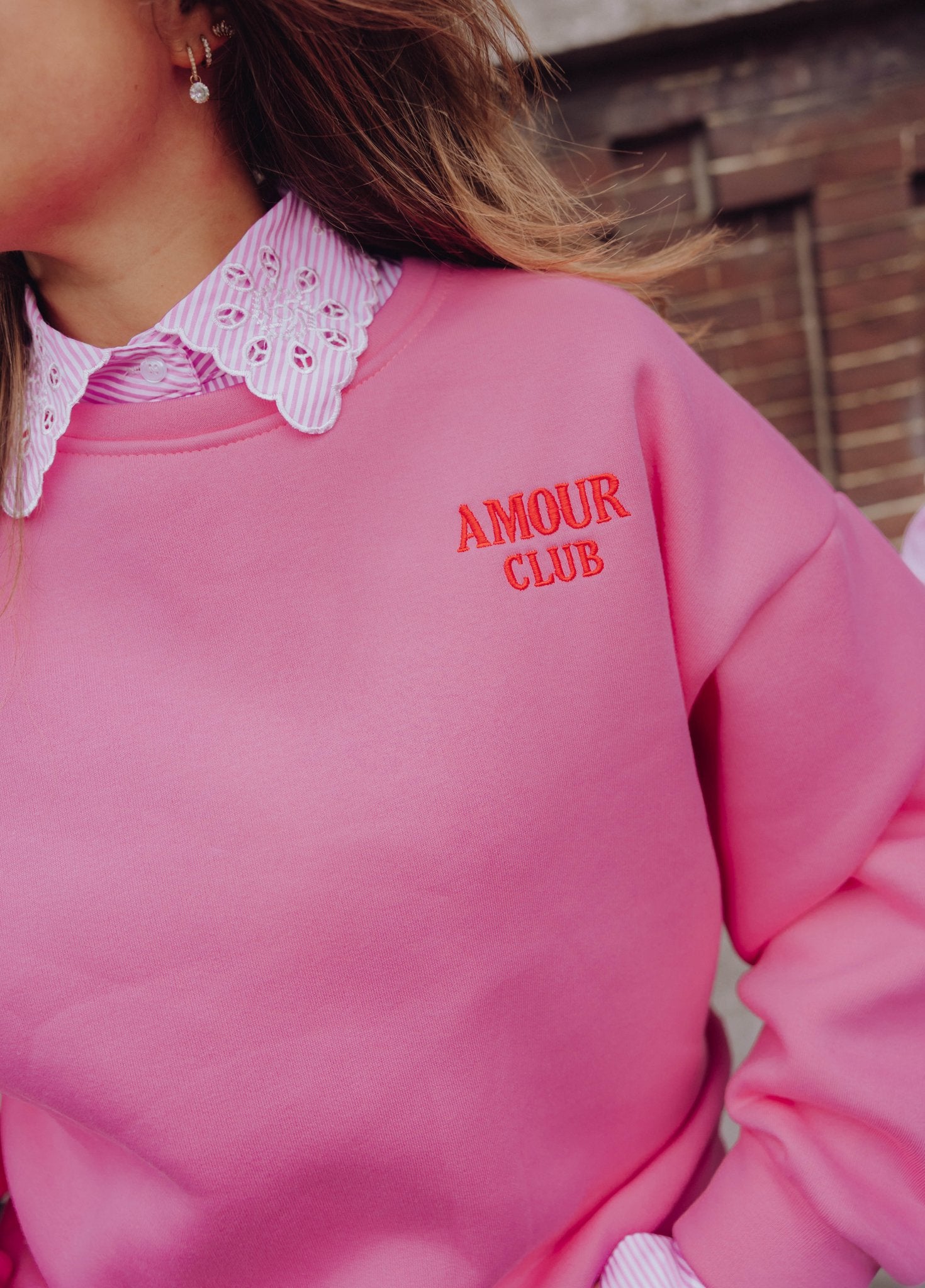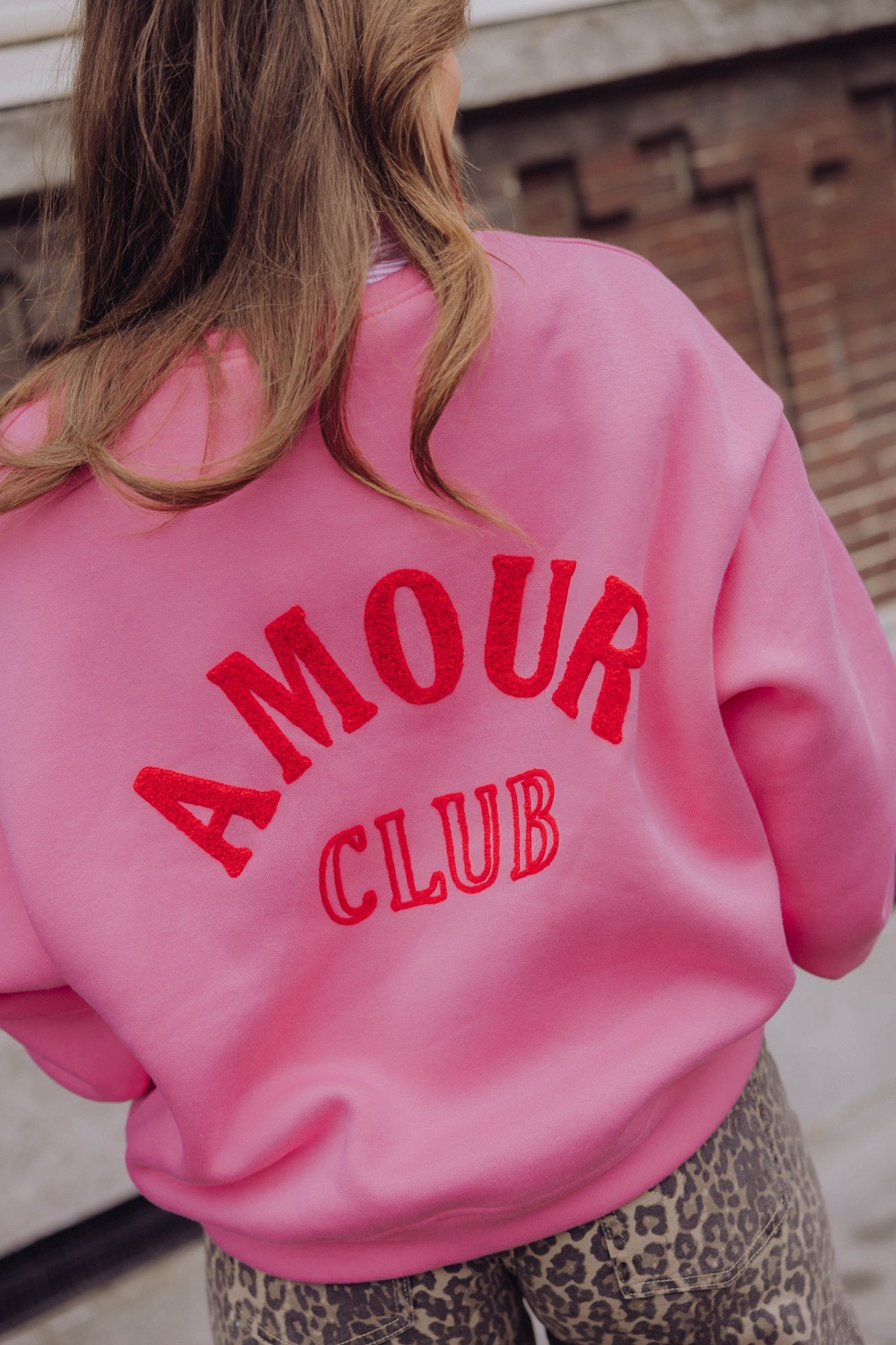 De Amour Club Sweater in roze is een oversized trui met lange mouwen en een ronde halslijn. De trui heeft een losse pasvorm en is voorzien van een leopard tekst "Amour club" op de voor- en achterkant.
