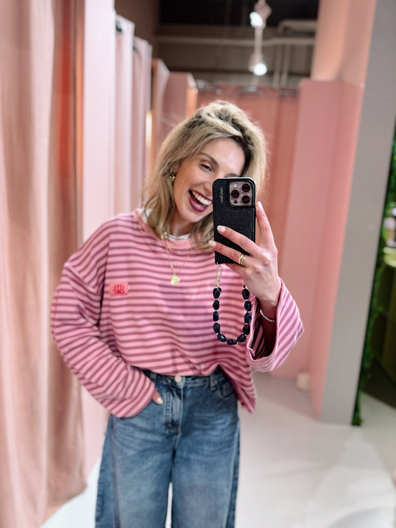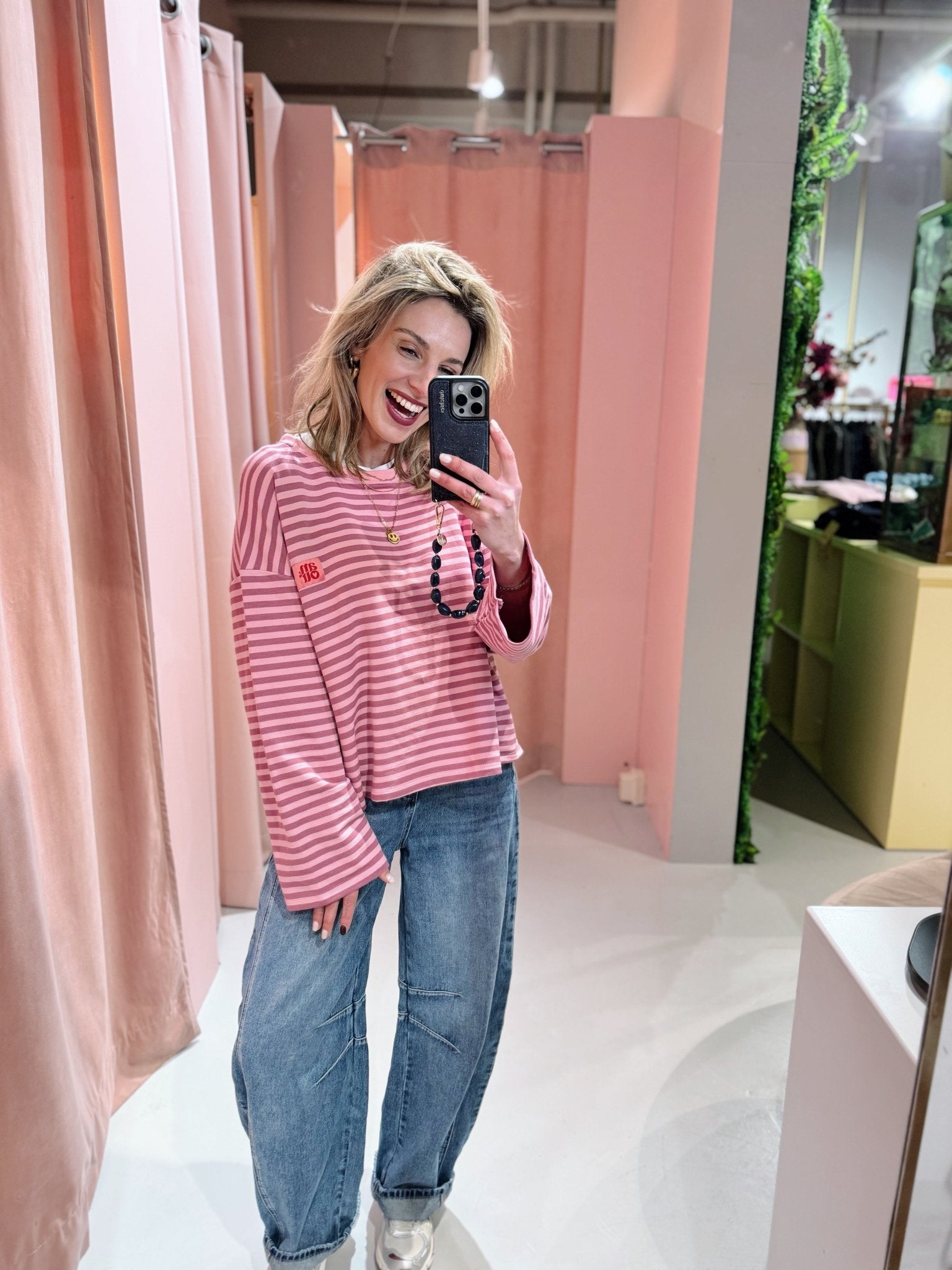 De Amour Longsleeve in roze is een top met een iets wijder model. De top is gemaakt van een stretchy stof, heeft lange mouwen met een hoge, ronde halslijn en een streep patroon. Daarnaast is de top voorzien van een patch met de tekst "Amour" op de borst. Deze lange mouwen top is perfect om laagjes mee te creëren in het najaar.