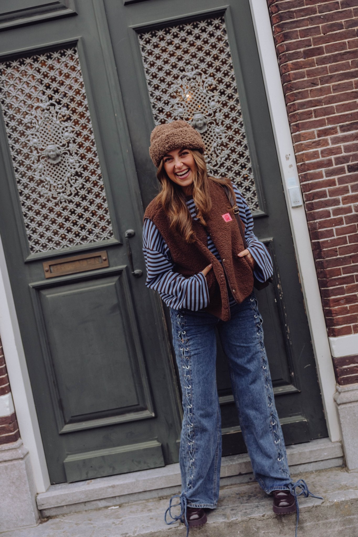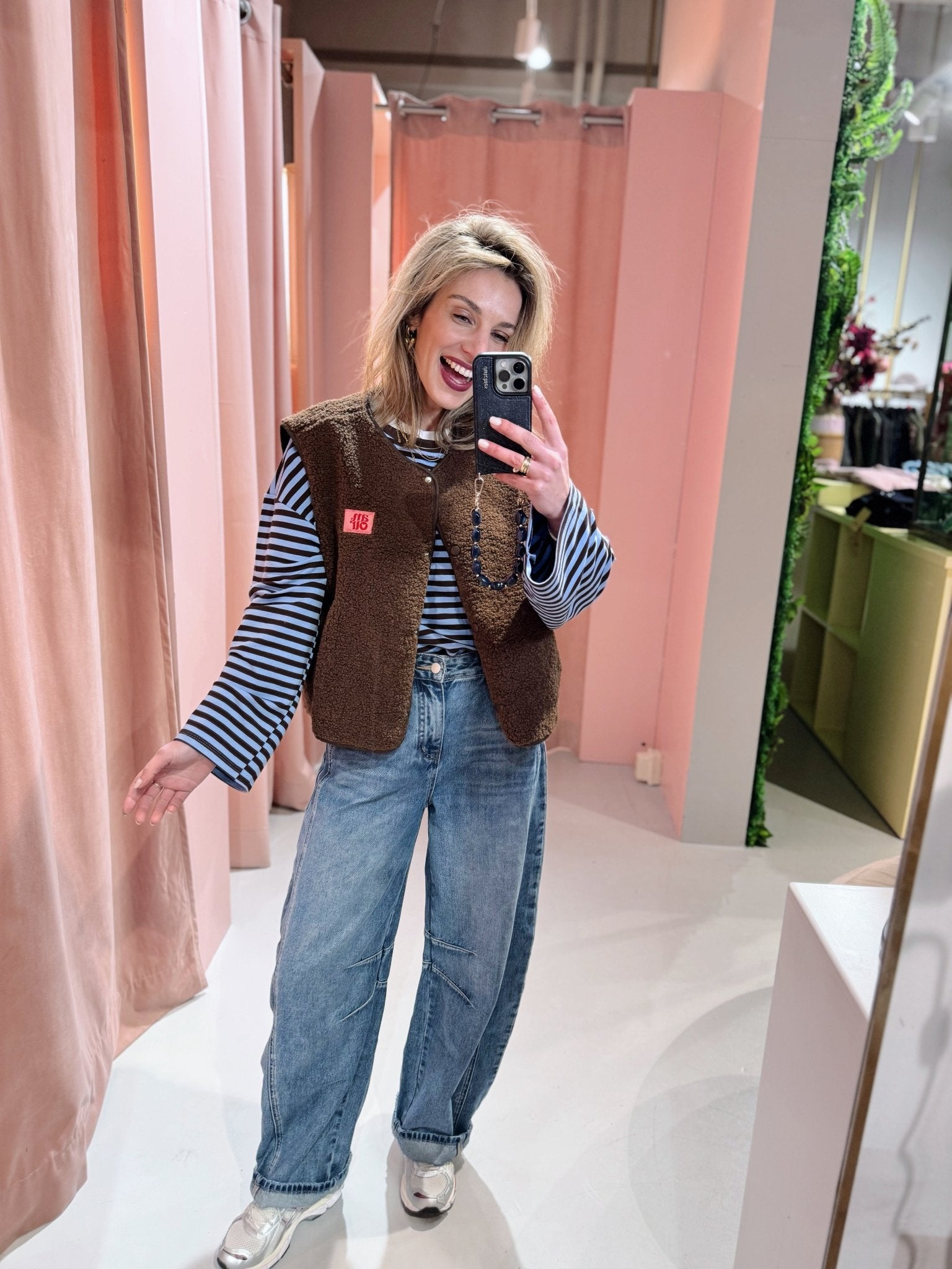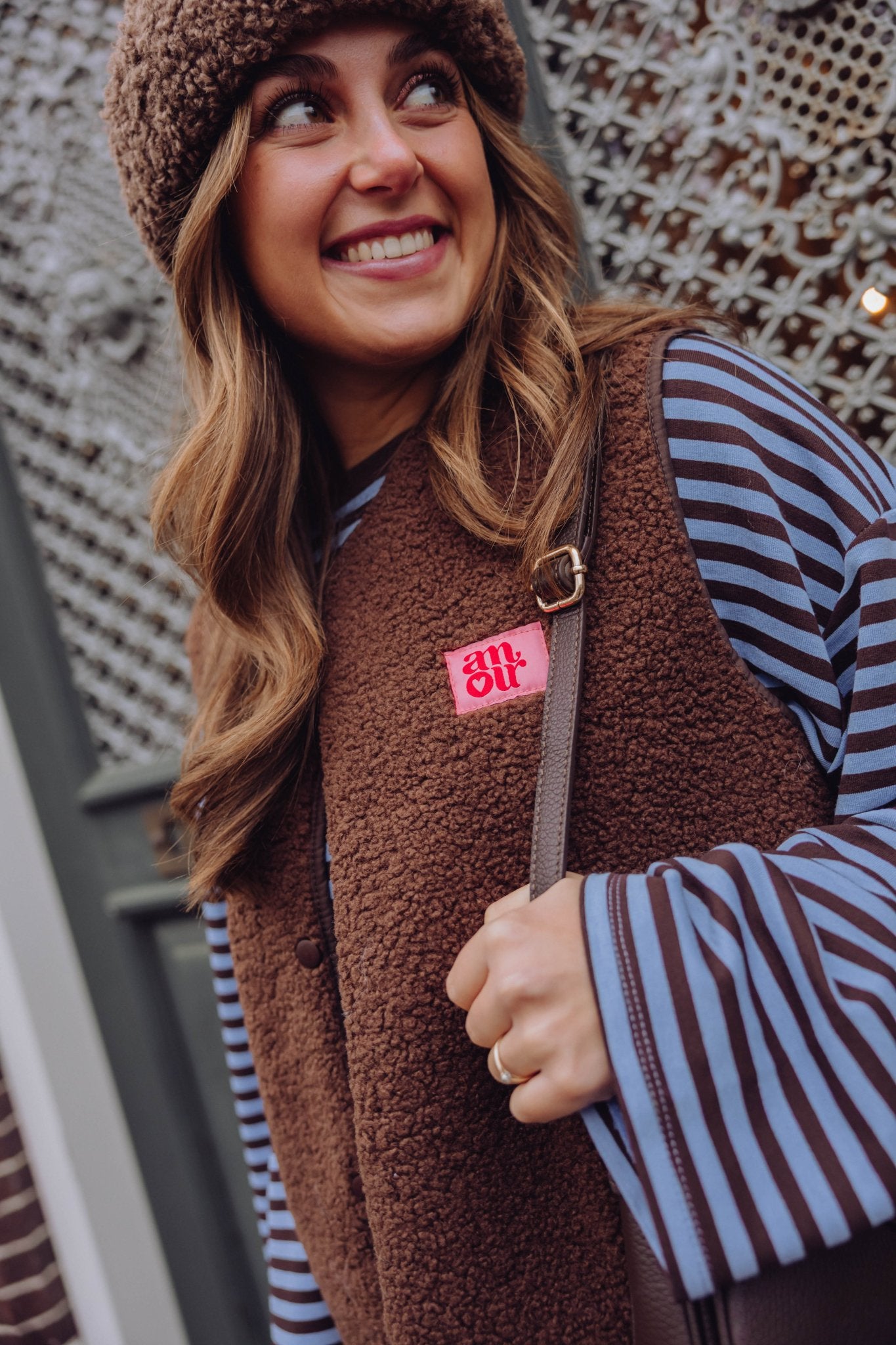 Het Amour Teddy Gilet in bruin is een zachte teddy bodywarmer en perfect voor de koude dagen. Het gilet is heerlijk warm en is voorzien van twee steekzakken en een knoopsluiting aan de voorkant. Op de linker borst zit een patch met de tekst “amour”, wat zorgt voor een leuk en speels detail.