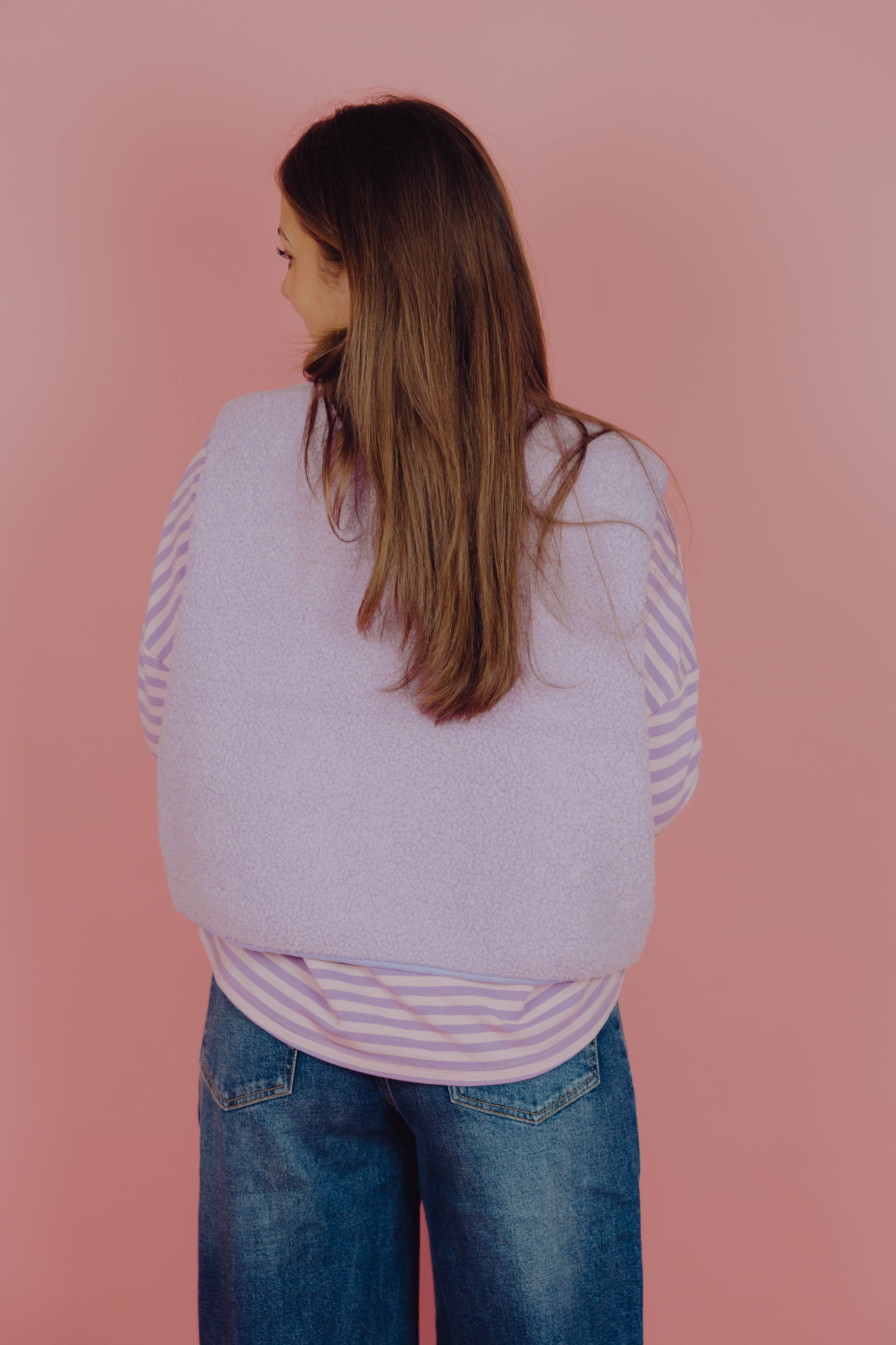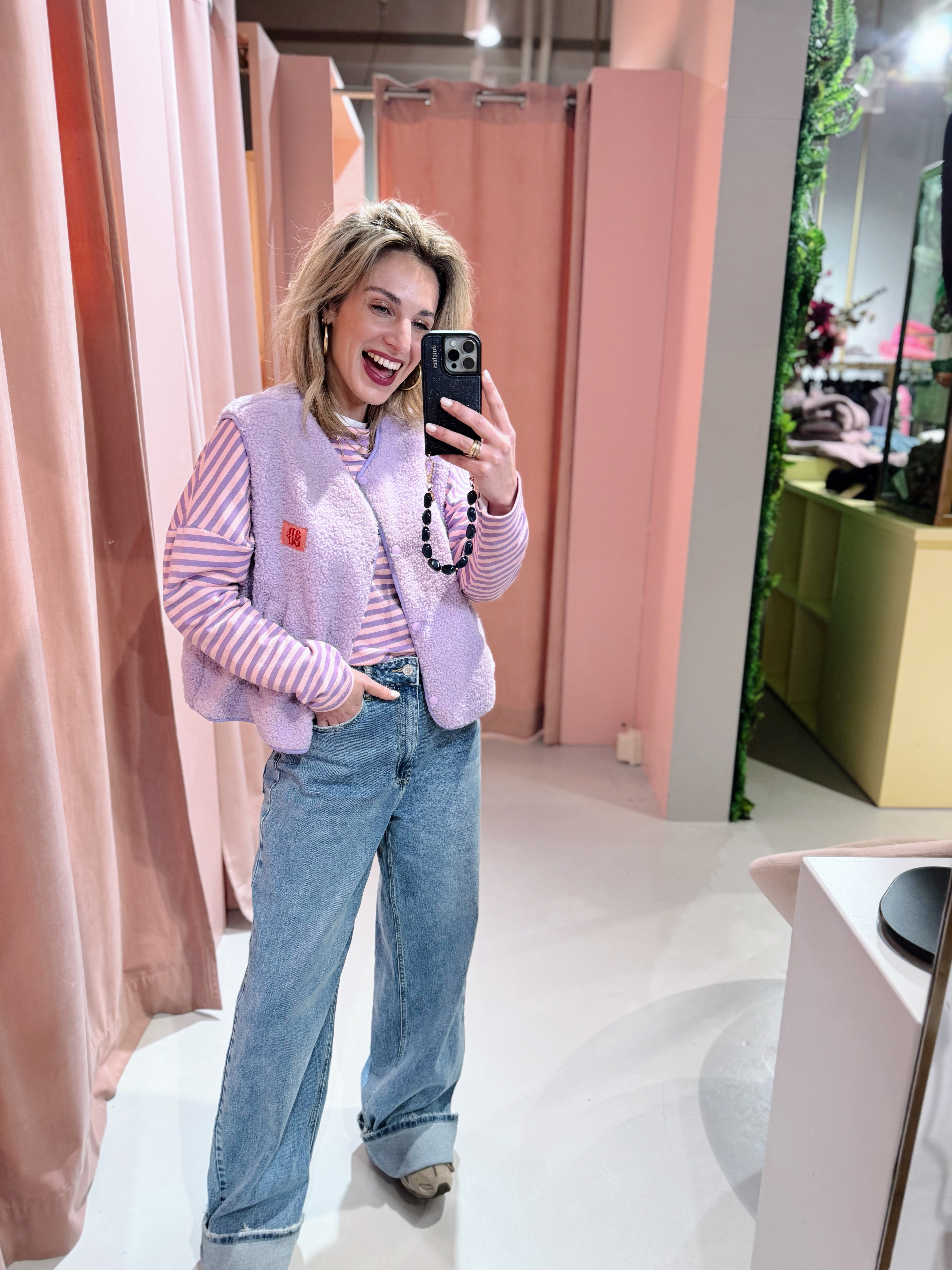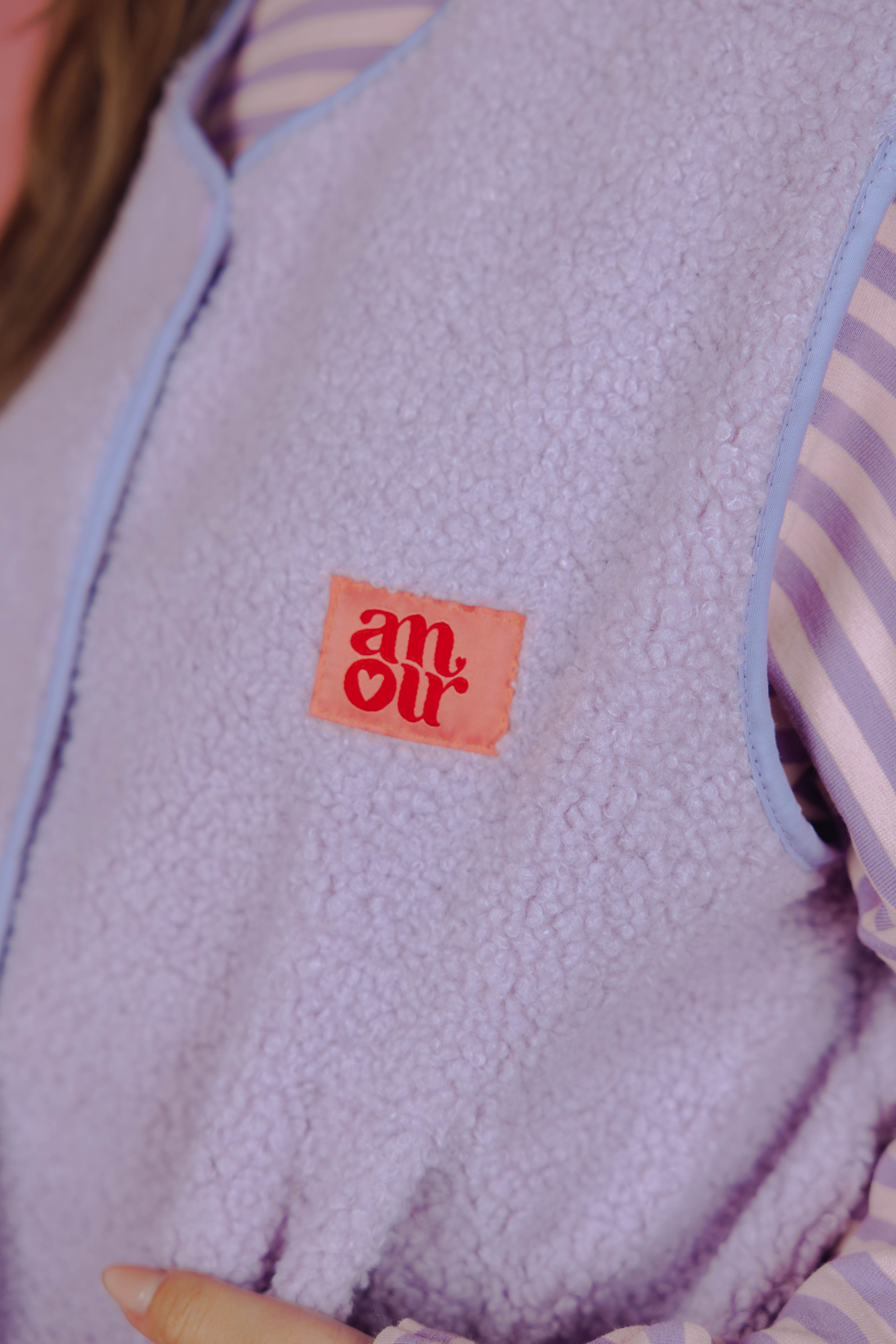 Het Amour Teddy Gilet in lila is een zachte teddy bodywarmer en perfect voor de koude dagen. Het gilet is heerlijk warm en is voorzien van twee steekzakken en een knoopsluiting aan de voorkant. Op de linker borst zit een patch met de tekst “amour”, wat zorgt voor een leuk en speels detail.