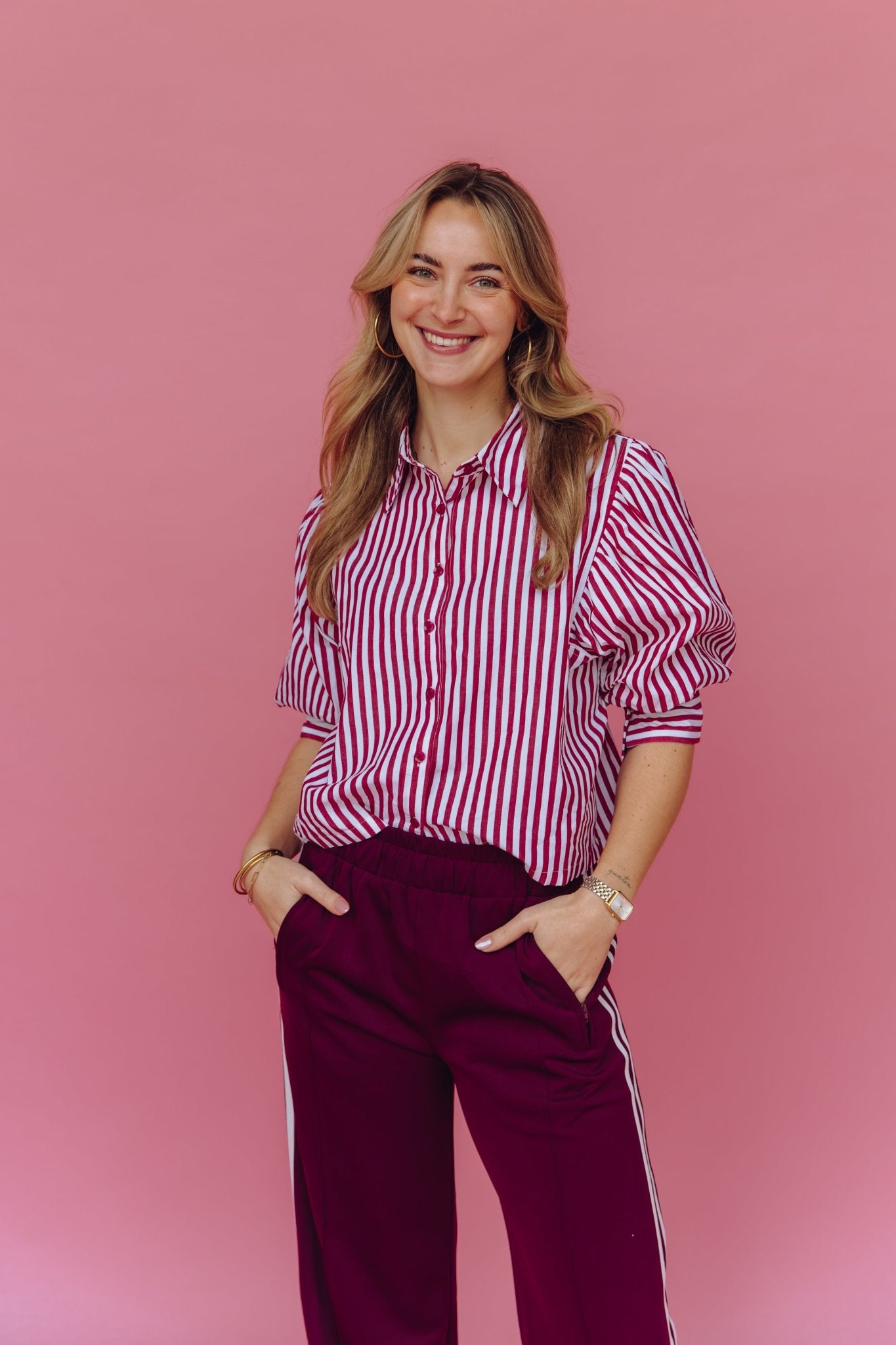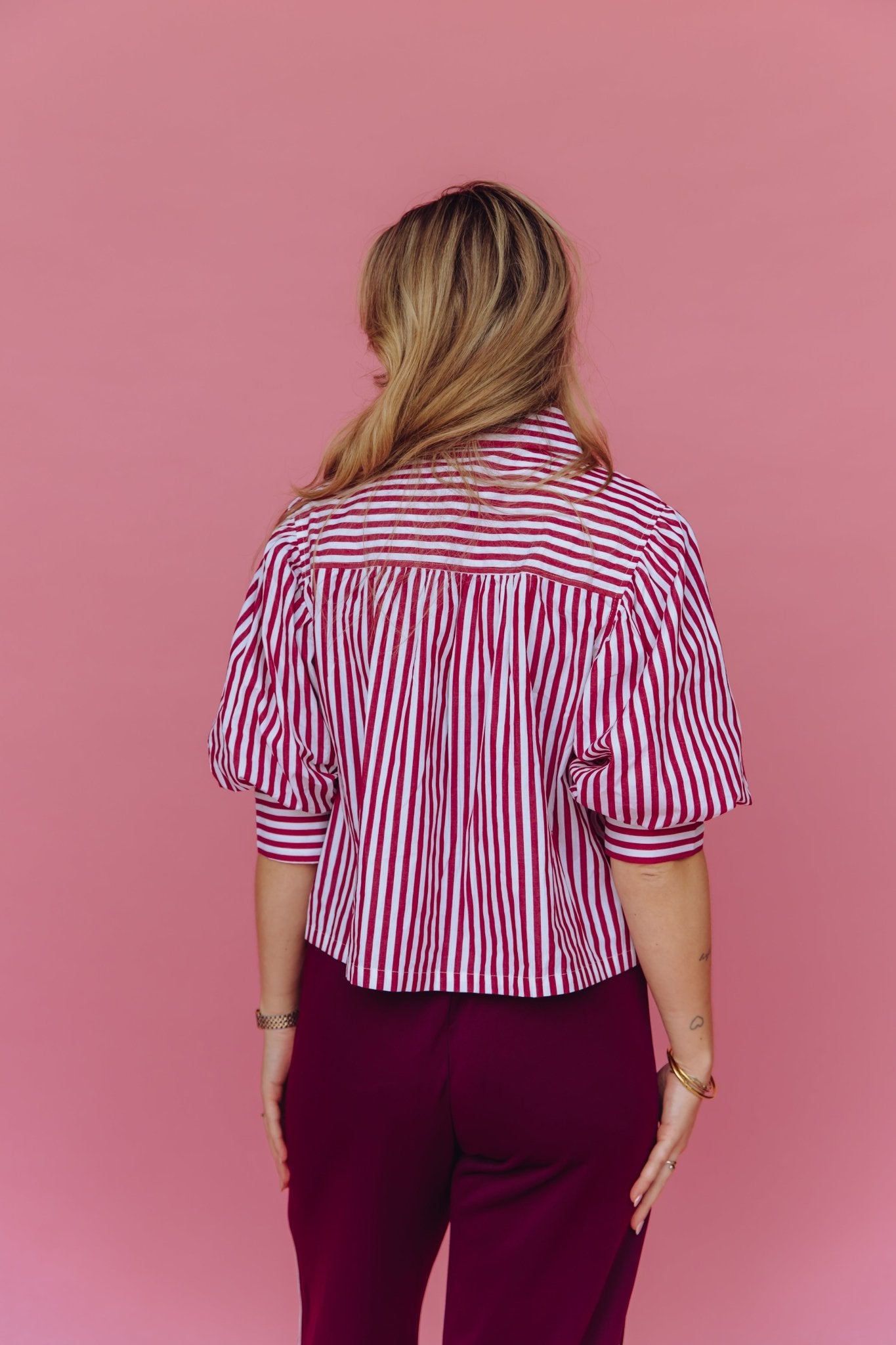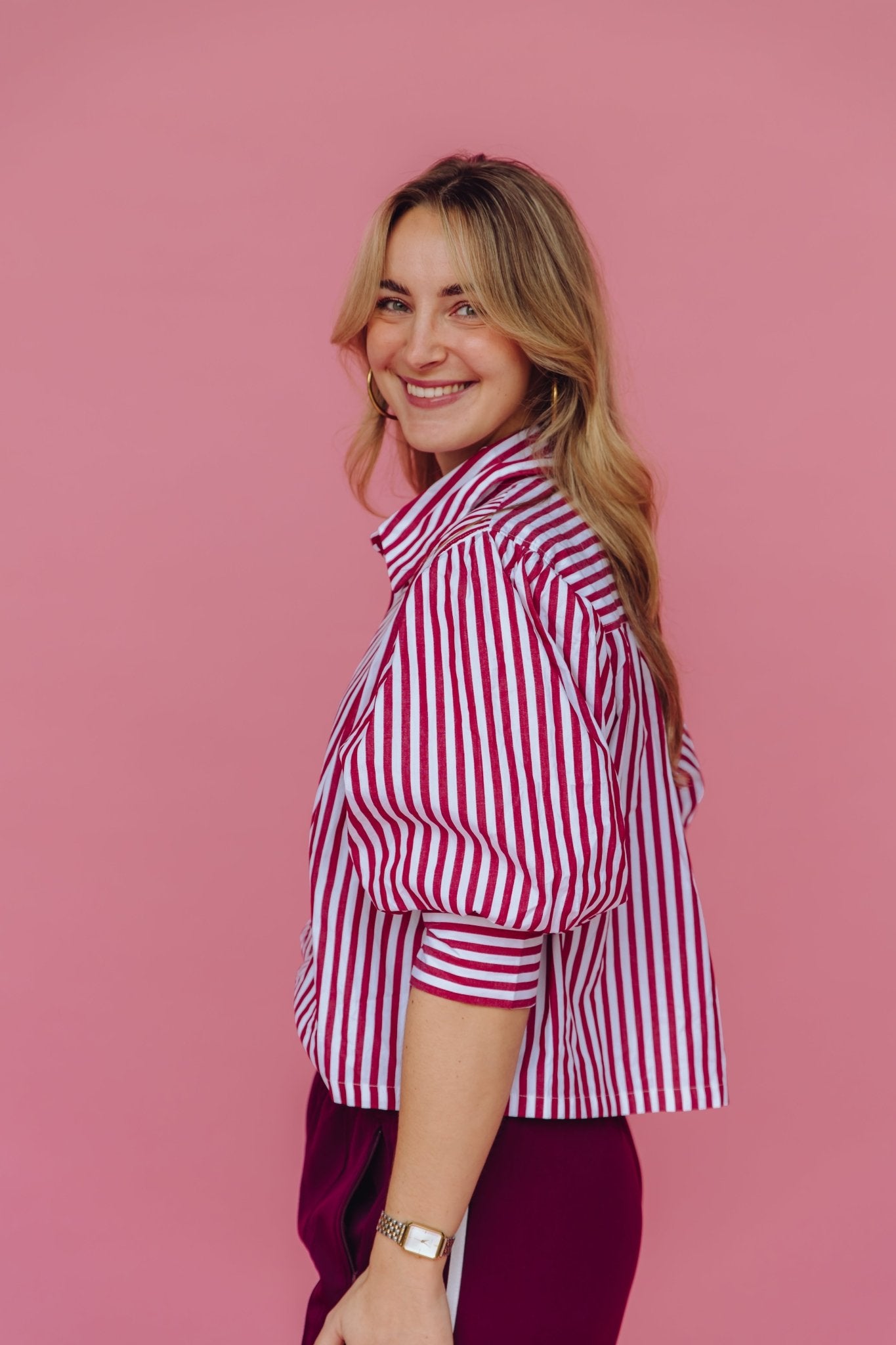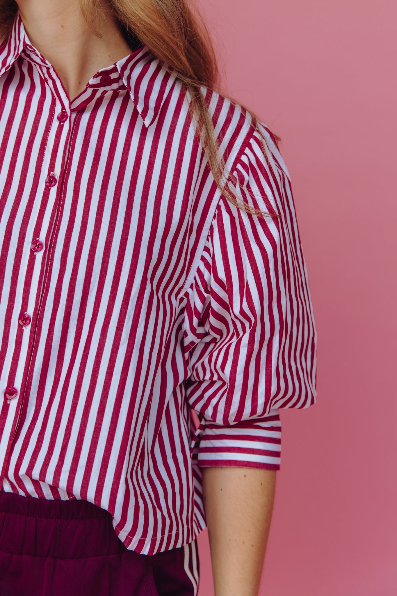 De Anais Blouse in bordeaux is gemaakt van een luchtige stof met een streep patroon. De blouse is voorzien van 3/4 pofmouwen en een kraagje en is gemakkelijk te sluiten door middel van een knoopsluiting aan de voorkant. Daarnaast heeft deze blouse een boxy model en is hij leuk om zowel casual als netjes te dragen.