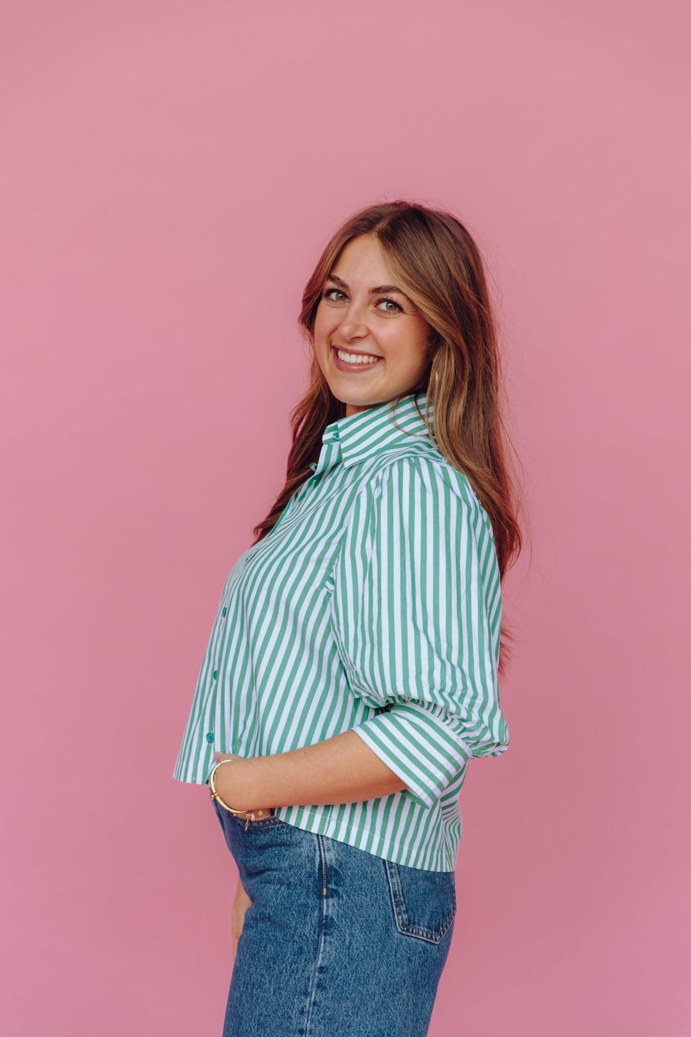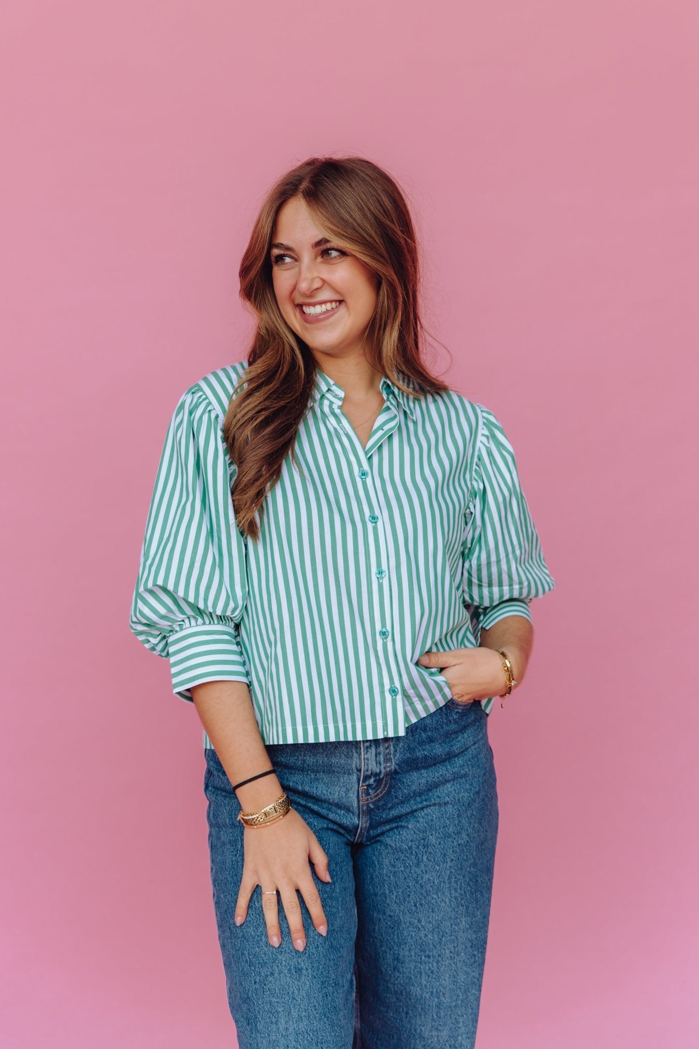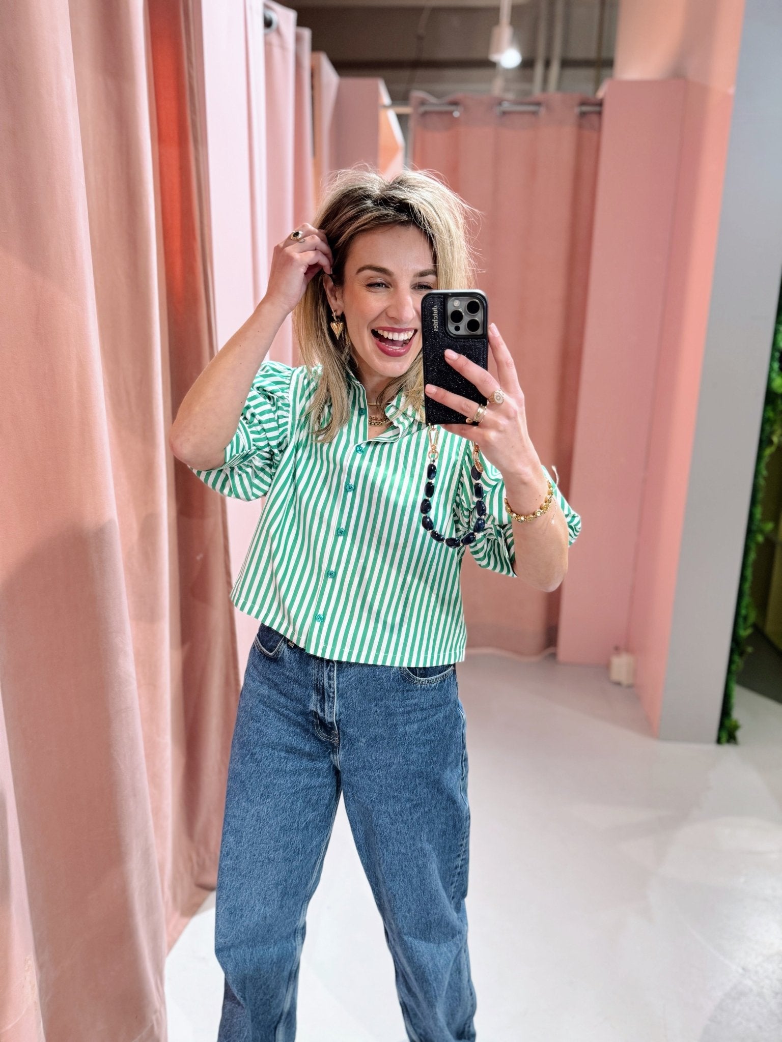 De Anais Blouse in groen is gemaakt van een luchtige stof met een streep patroon. De blouse is voorzien van 3/4 pofmouwen en een kraagje en is gemakkelijk te sluiten door middel van een knoopsluiting aan de voorkant. Daarnaast heeft deze blouse een boxy model en is hij leuk om zowel casual als netjes te dragen.