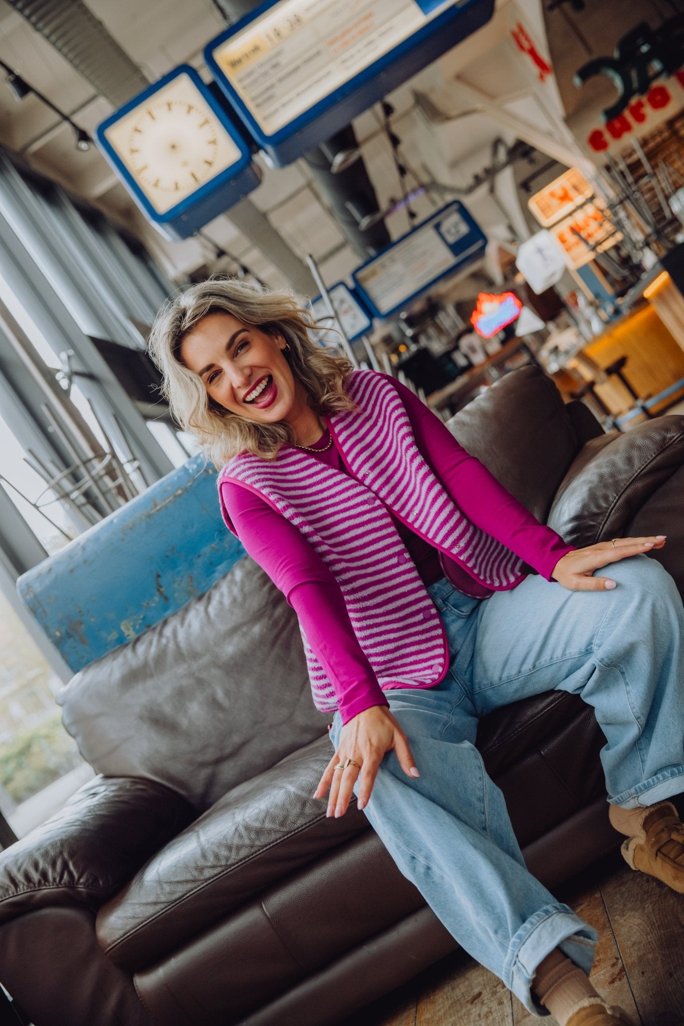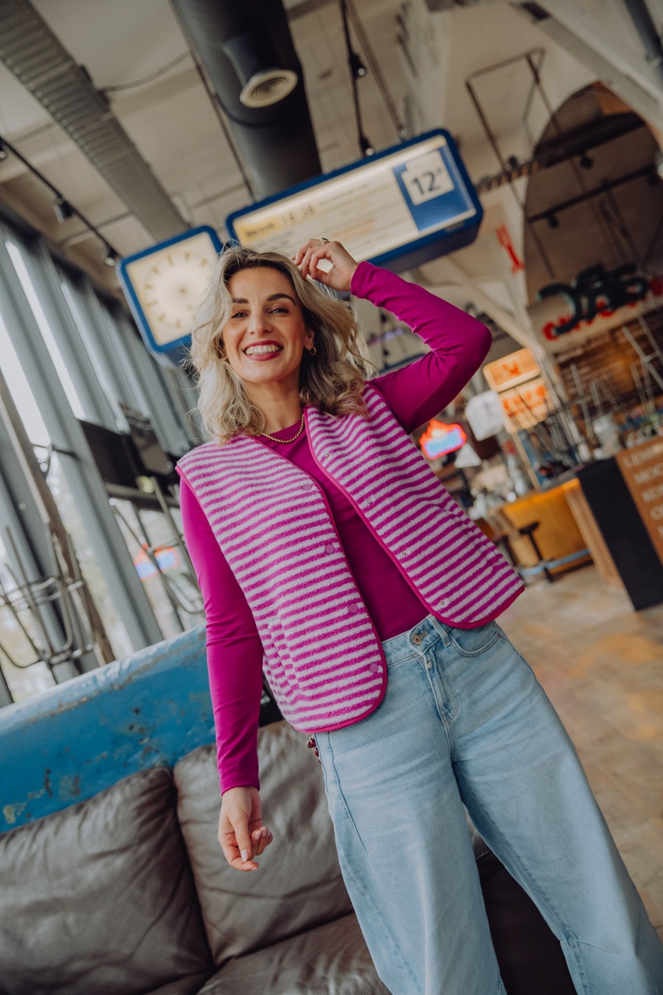 Het Anika Teddy Gilet in roze is een zachte gestreepte teddy bodywarmer en perfect voor het najaar. Het gilet is heerlijk warm en is voorzien van twee steekzakken en een knoopsluiting aan de voorkant.