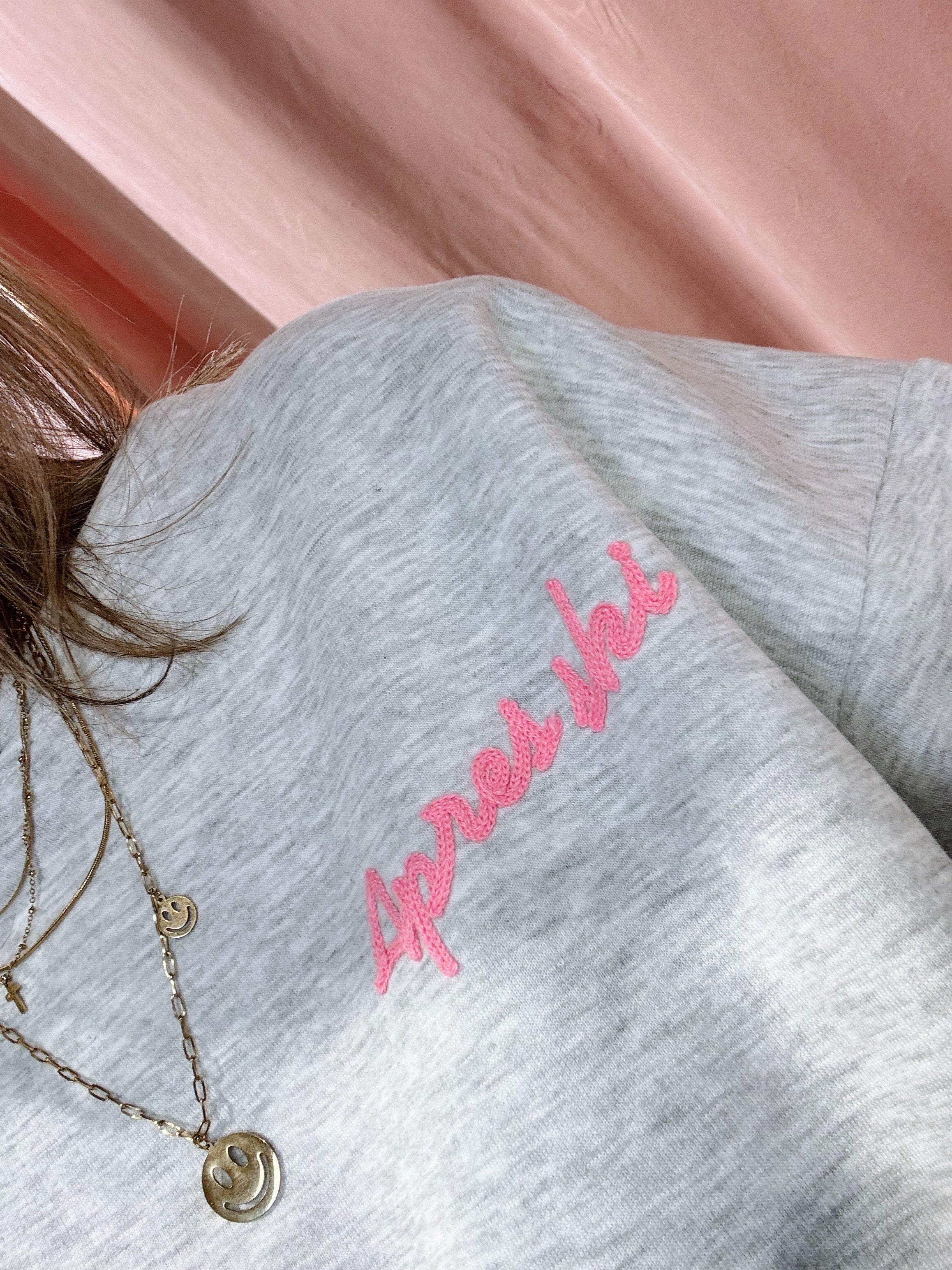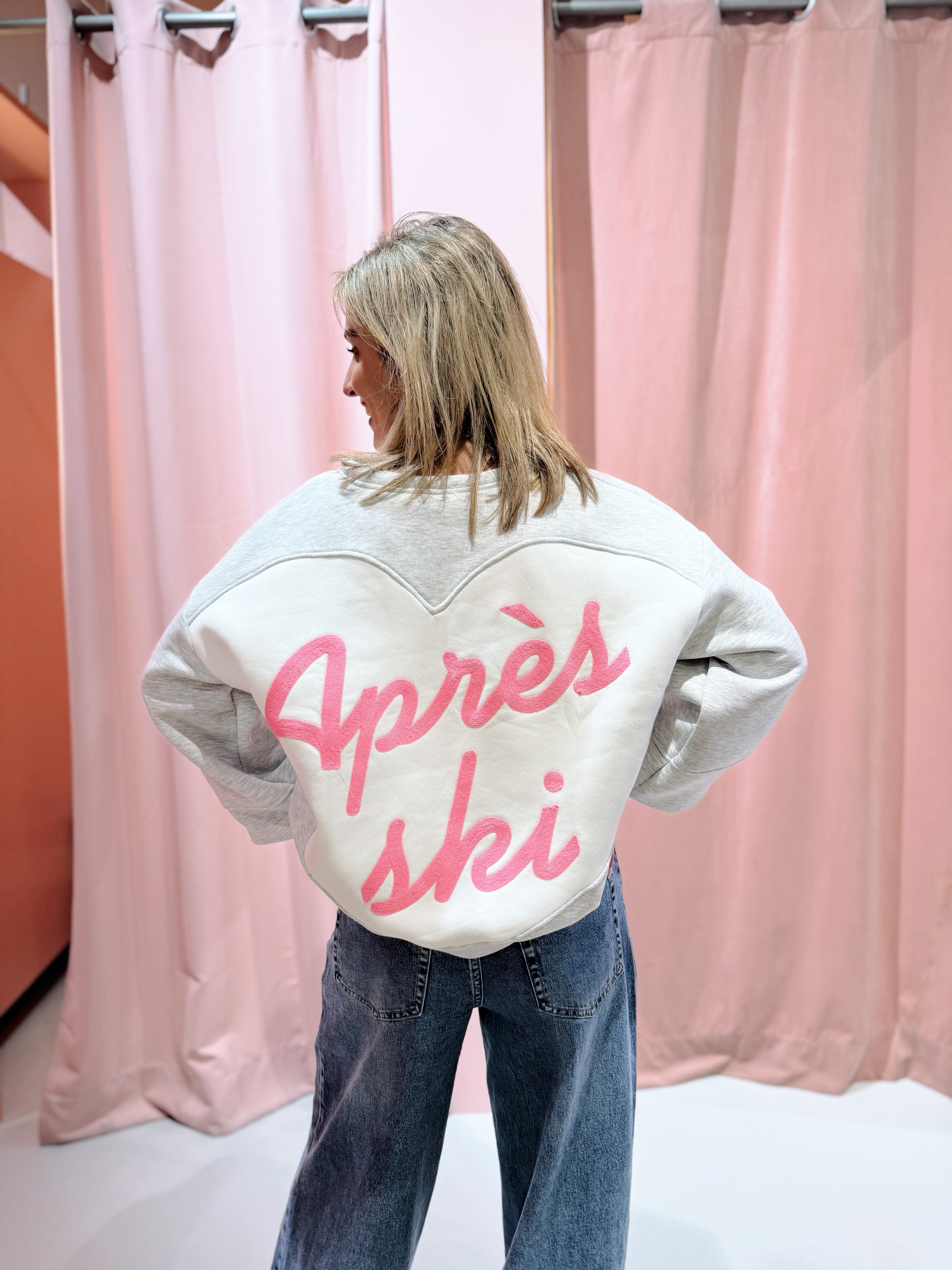 De Apres Ski Sweater in grijs is een oversized trui met lange mouwen en een ronde halslijn. De trui heeft een losse pasvorm en is voorzien van een tekst "Apres Ski" op de borst. Deze tekst staat ook in het groot op de achterkant. Doordat deze sweater voorzien is van een fleece binnenkant, is hij perfect voor de koude dagen!