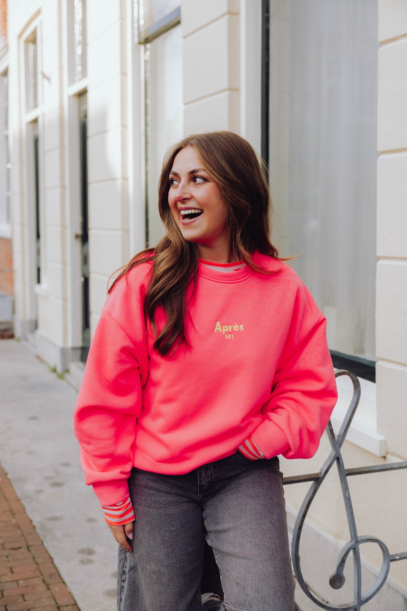 De Apres Ski Sweater in neon roze is een oversized trui met lange mouwen en een ronde halslijn. De trui heeft een losse pasvorm en is voorzien van een tekst "Apres Ski" op de borst. Deze tekst staat ook in het groot op de achterkant.