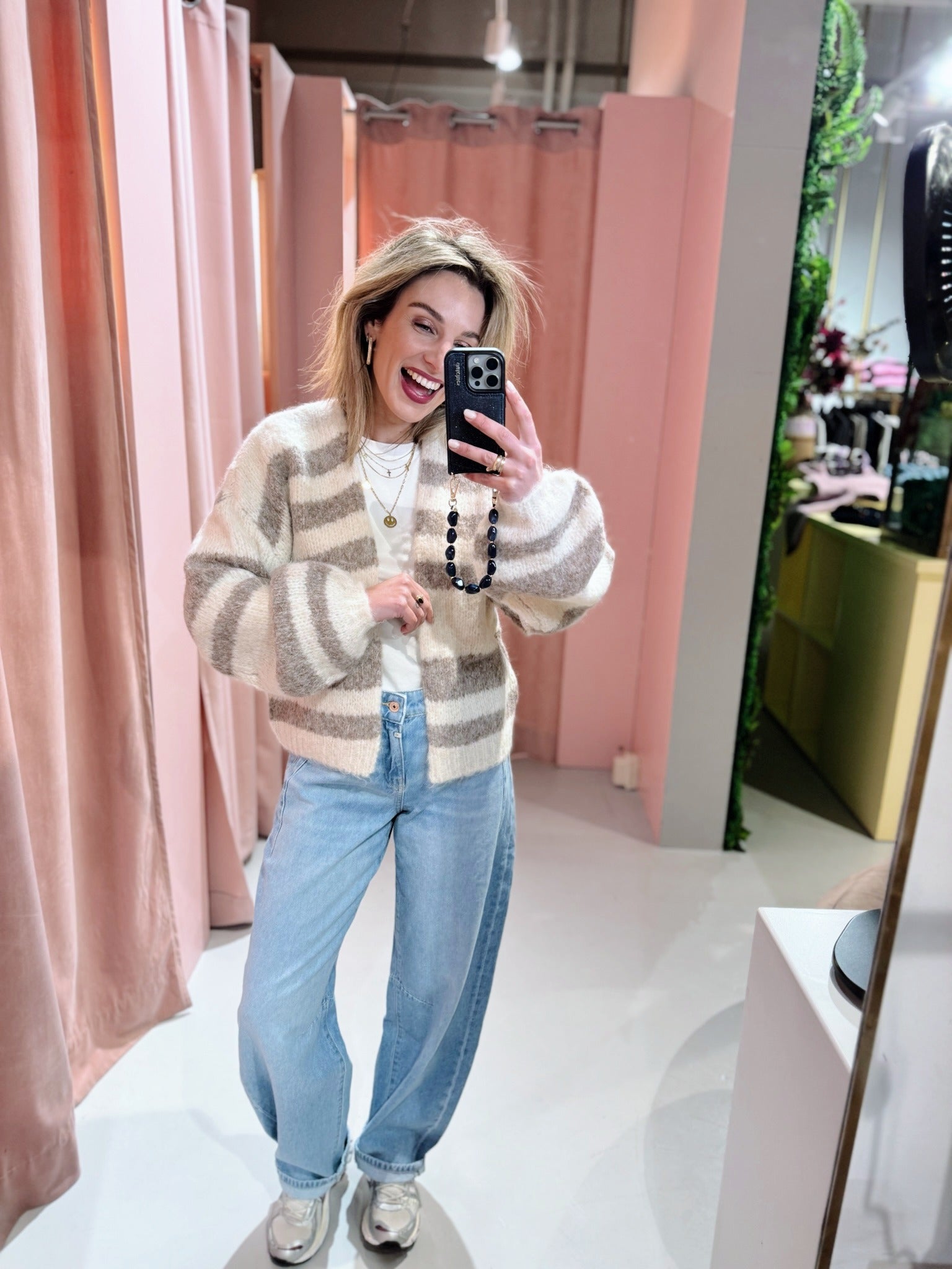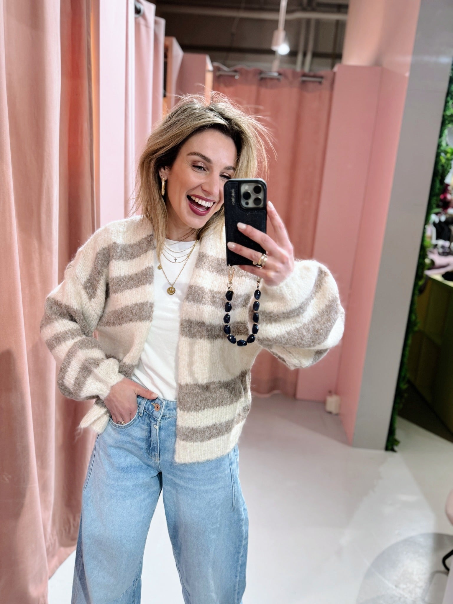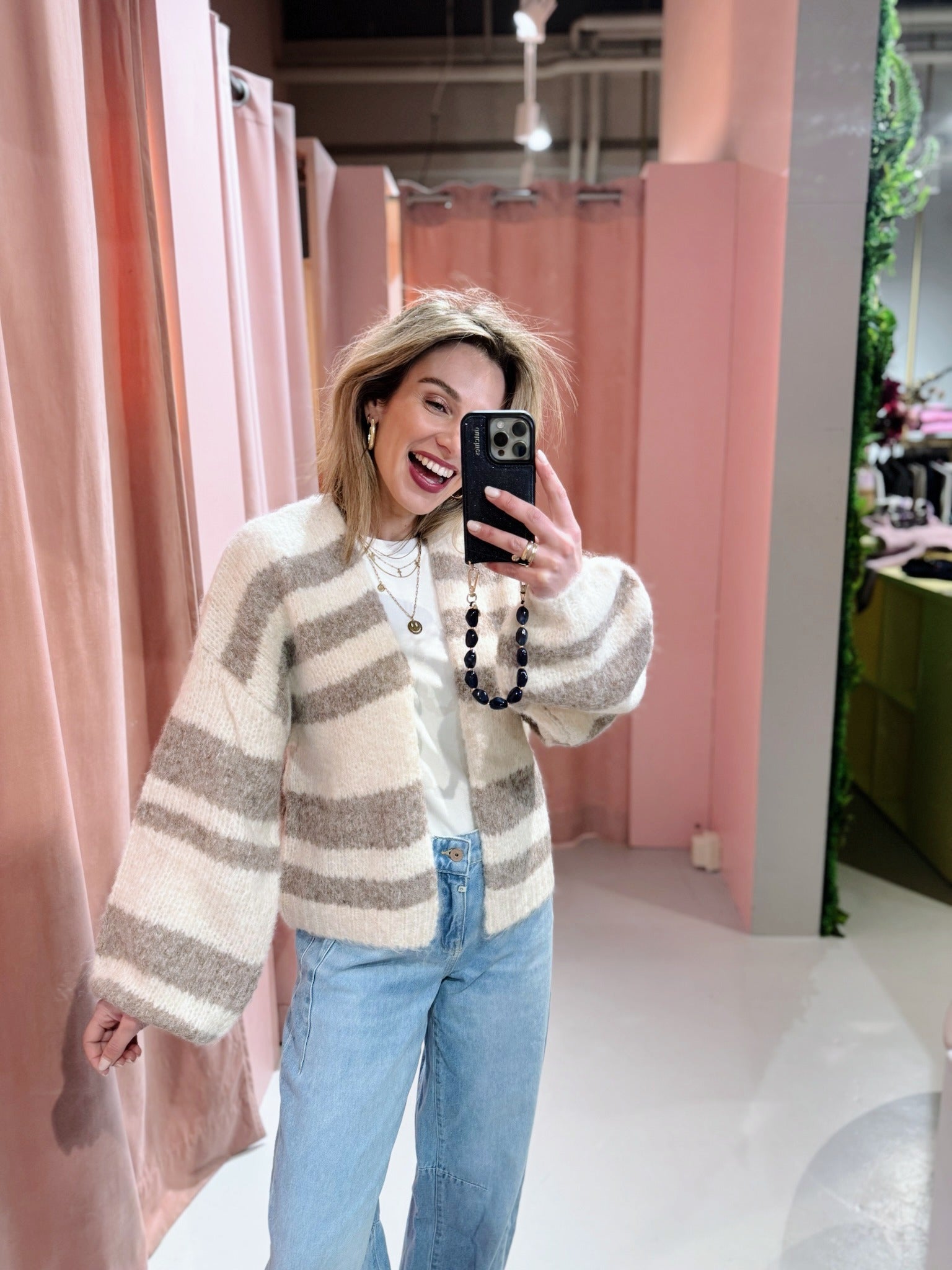 De Ashley Cardigan in beige heeft een oversized fit en is gemaakt van een zachte, gebreide stof met een streep patroon. Het vest heeft lange mouwen en valt open aan de voorkant.