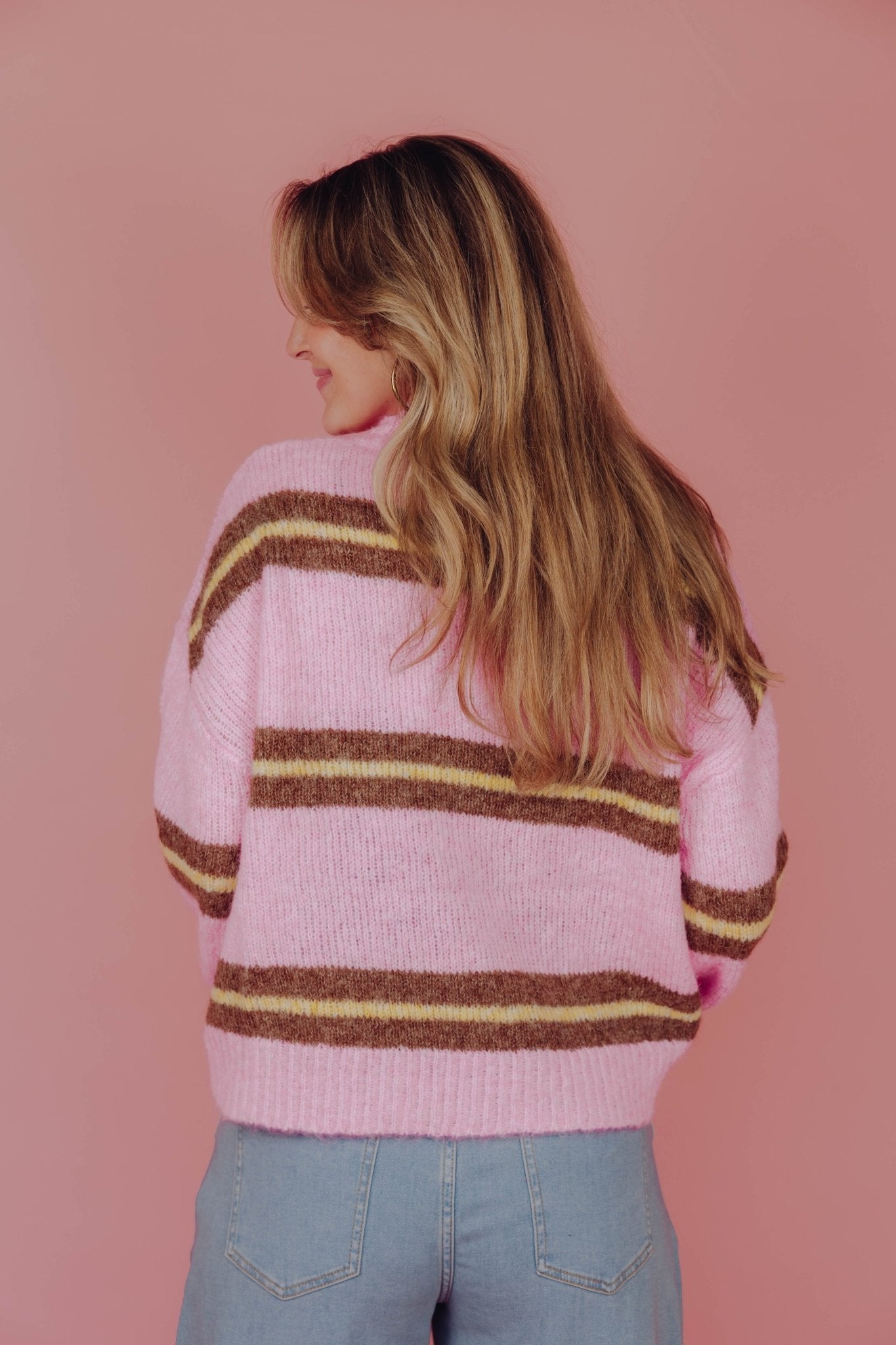 De Babette Knit in roze is gemaakt van een gebreid materiaal, waardoor hij heerlijk warm is. De sweater heeft lange mouwen, een kleine col en is voorzien van een bruin met geel streep patroon. Combineer deze trui met een jeans voor een casual outfit.