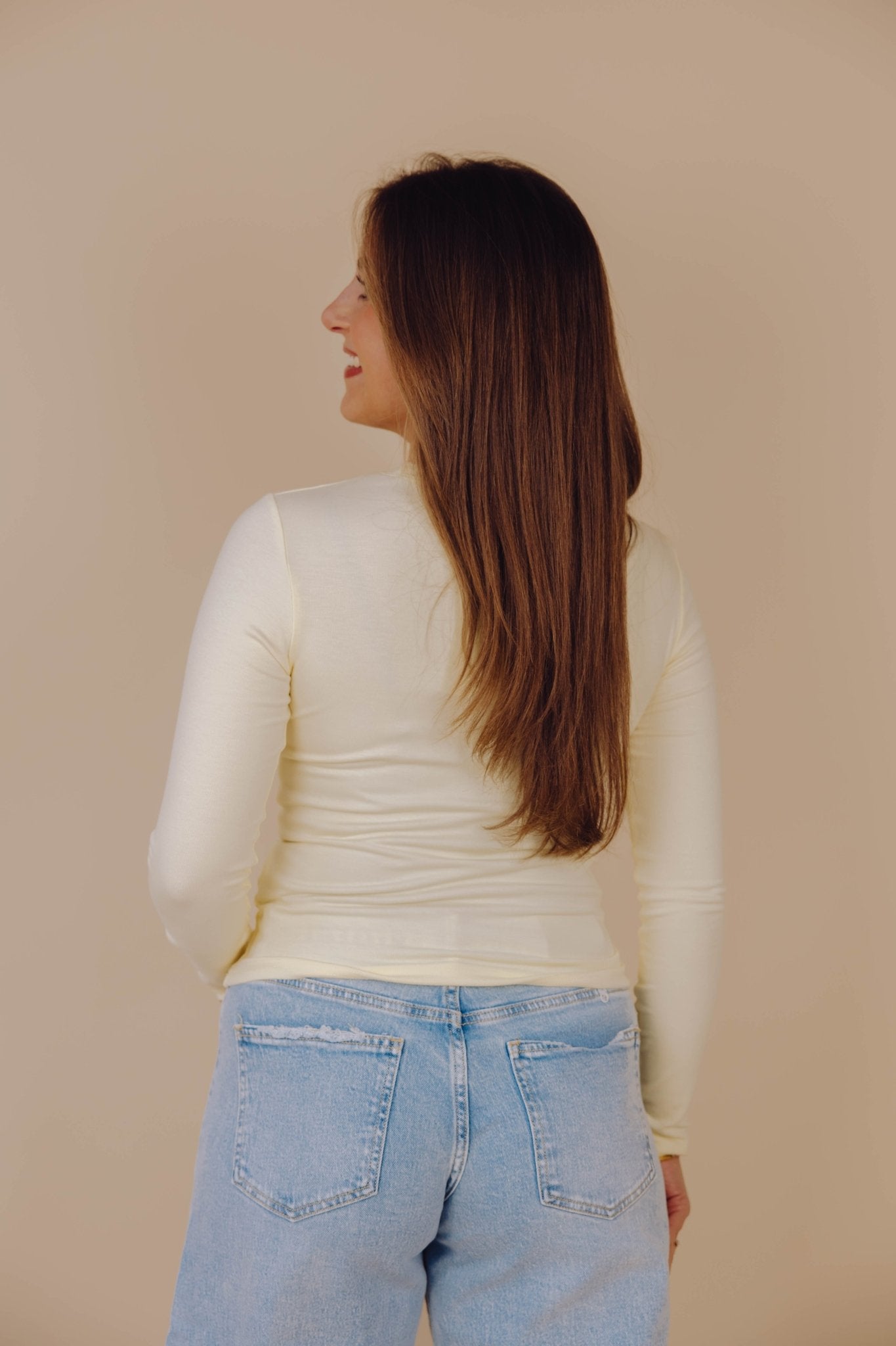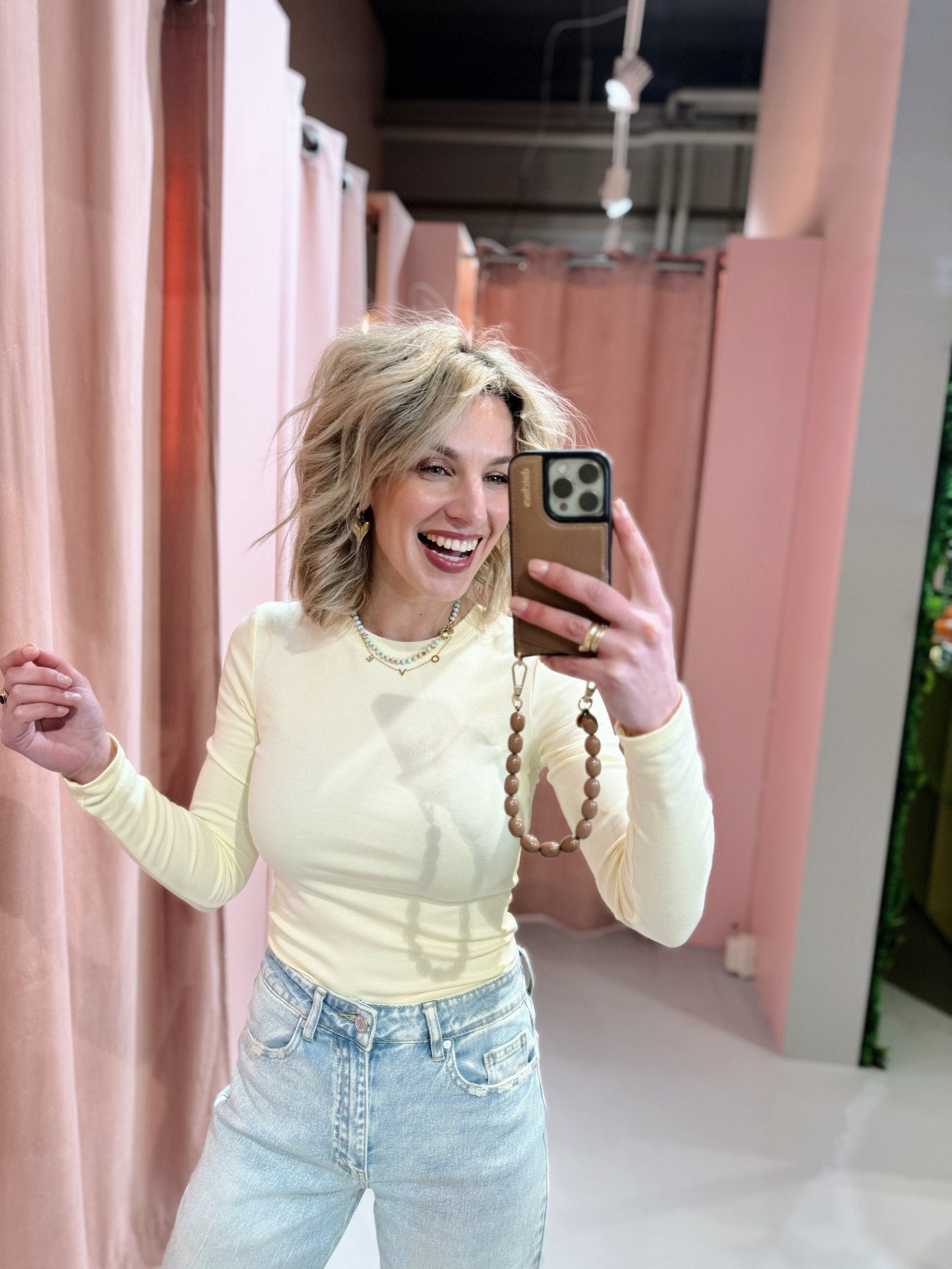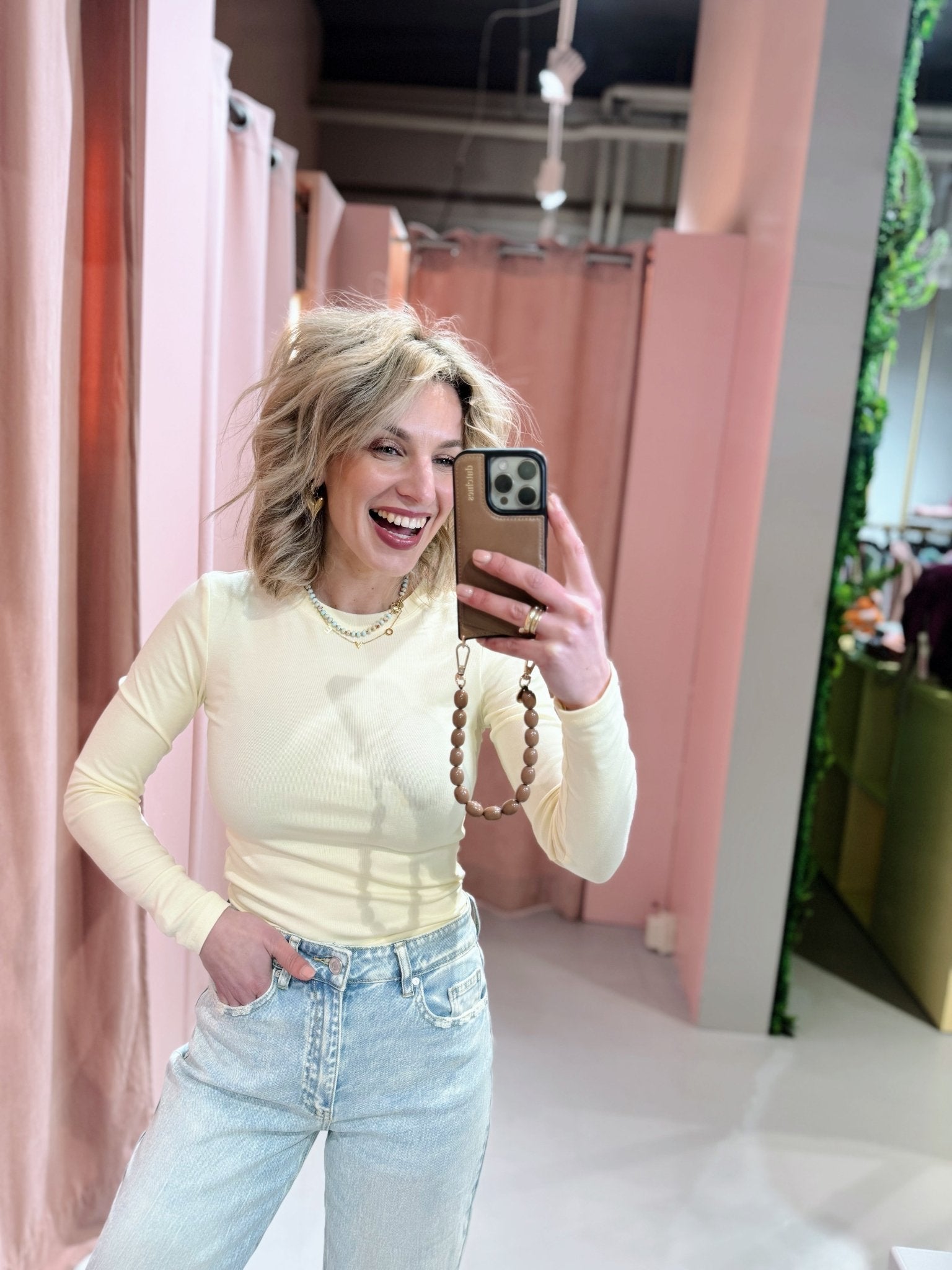 De Basic Longsleeve in geel is een top met een aansluitend model. De top heeft lange mouwen met een ronde halslijn en is de perfecte basic.