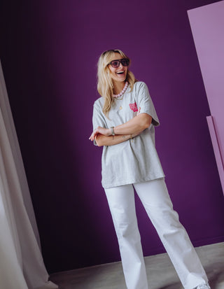Dit T-shirt is gemaakt van zwaar biologisch katoen en voelt stevig en comfortabel aan. Het model heeft een ronde hals en korte batwing mouwen, wat zorgt voor een mooie, iets wijdere pasvorm bij de schouders. De taille sluit iets meer aan, waardoor het shirt een vrouwelijk silhouet krijgt.
