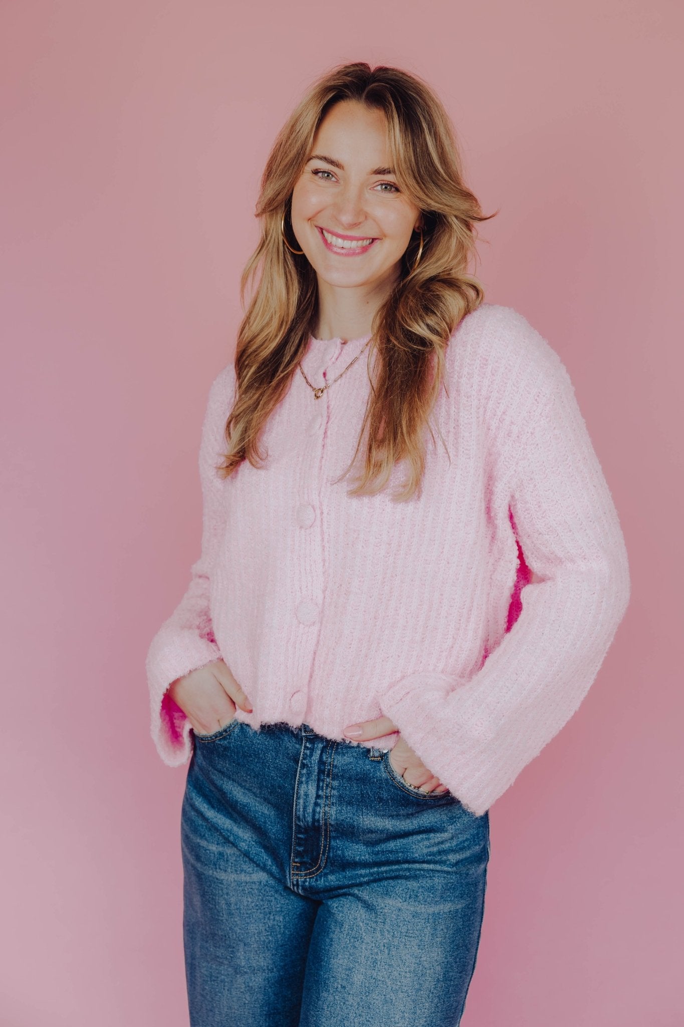 De Beau Cardigan in roze heeft een boxy fit en is gemaakt van een zachte, gebreide stof. Het vest heeft lange mouwen, een ronde hals en een knoopsluiting. Ideaal om te dragen in laagjes met het koude weer!