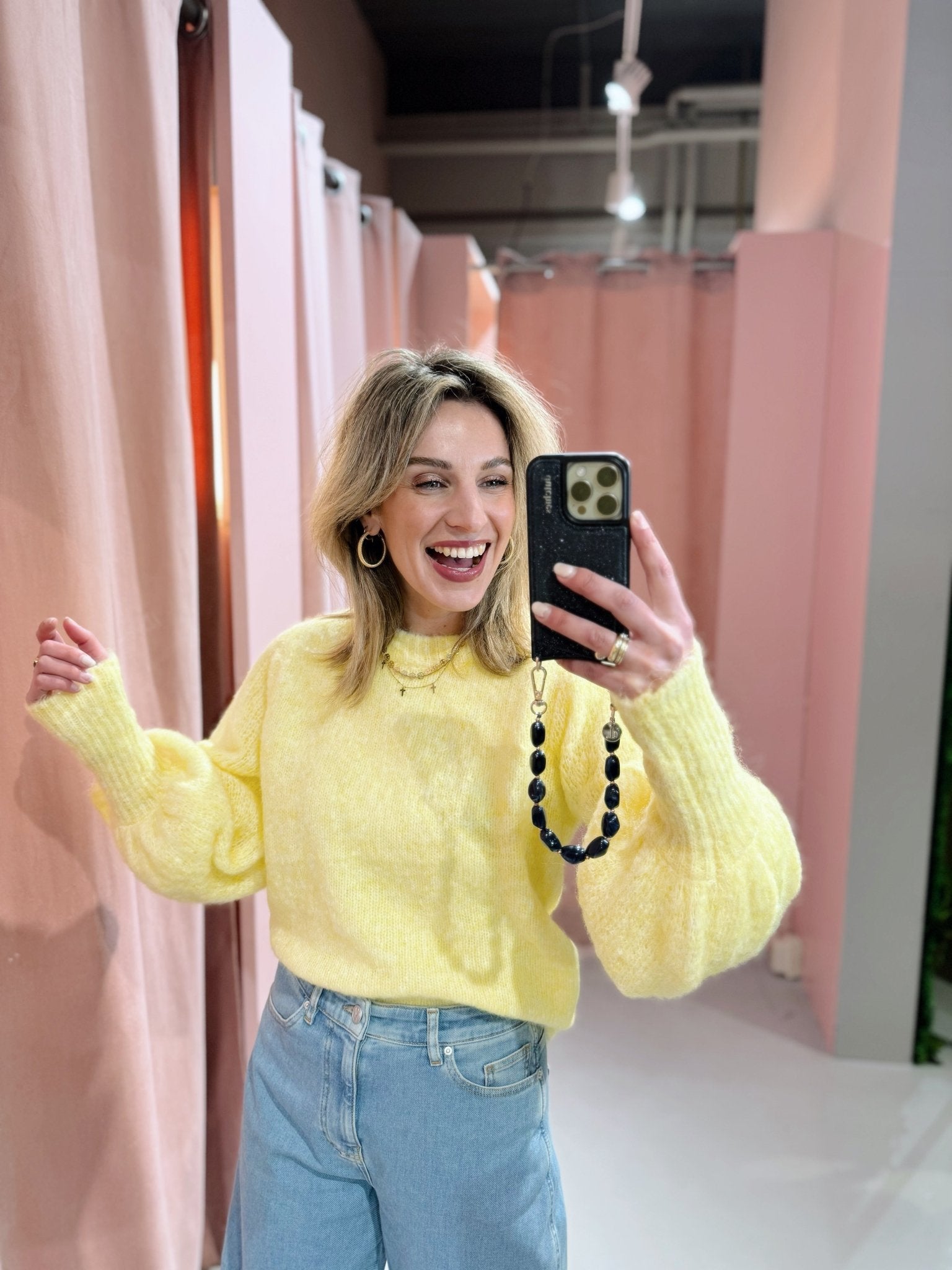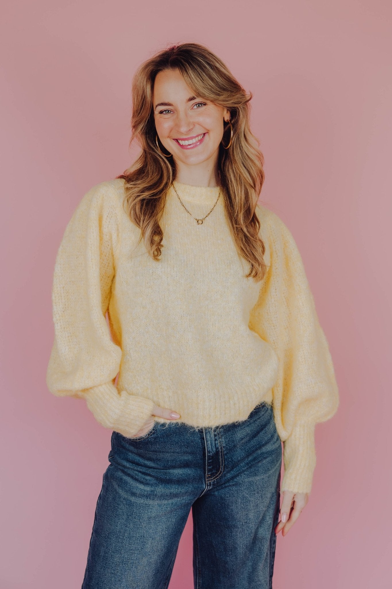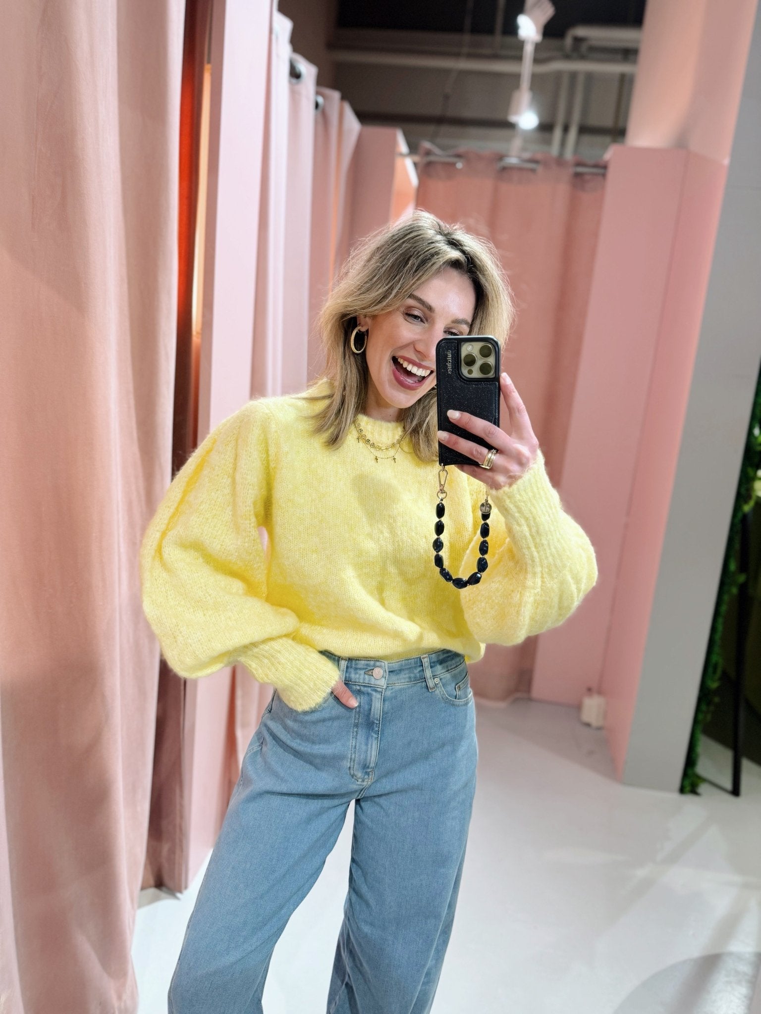 De Bella Knit in geel is een knit met een boxy model. De trui is gemaakt van een heerlijk warm gebreid materiaal, heeft lange pofmouwen met een hoge, ronde halslijn en een korte pasvorm.