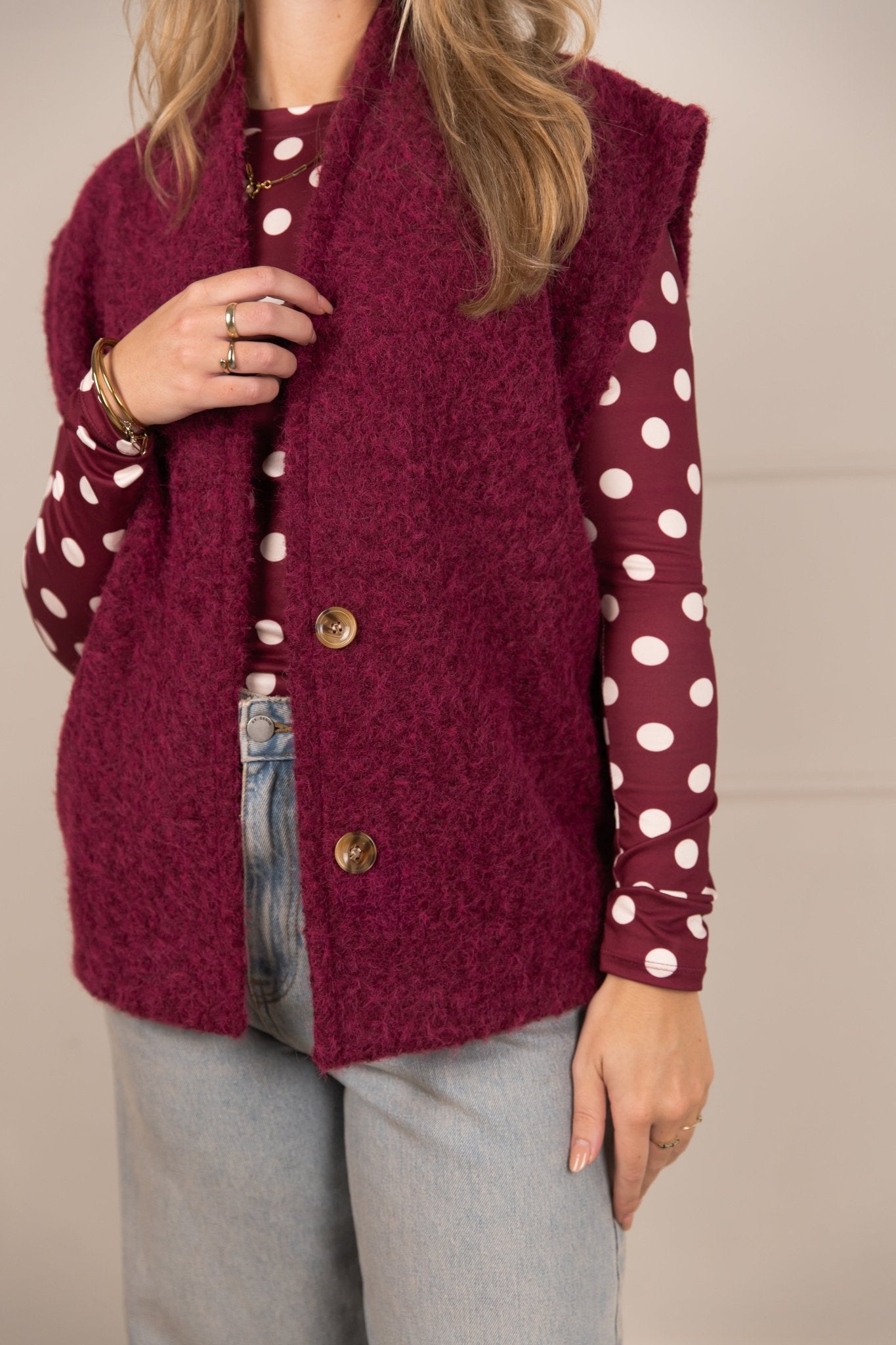 De Bente Gilet in bordeaux is gemaakt van een zachte, wollige stof, waardoor hij heerlijk warm is! Het gilet is mouwloos en is gemakkelijk aan te trekken door middel van een knoopsluiting. Combineer deBente Gilet met één van onze kleurrijke blouses!