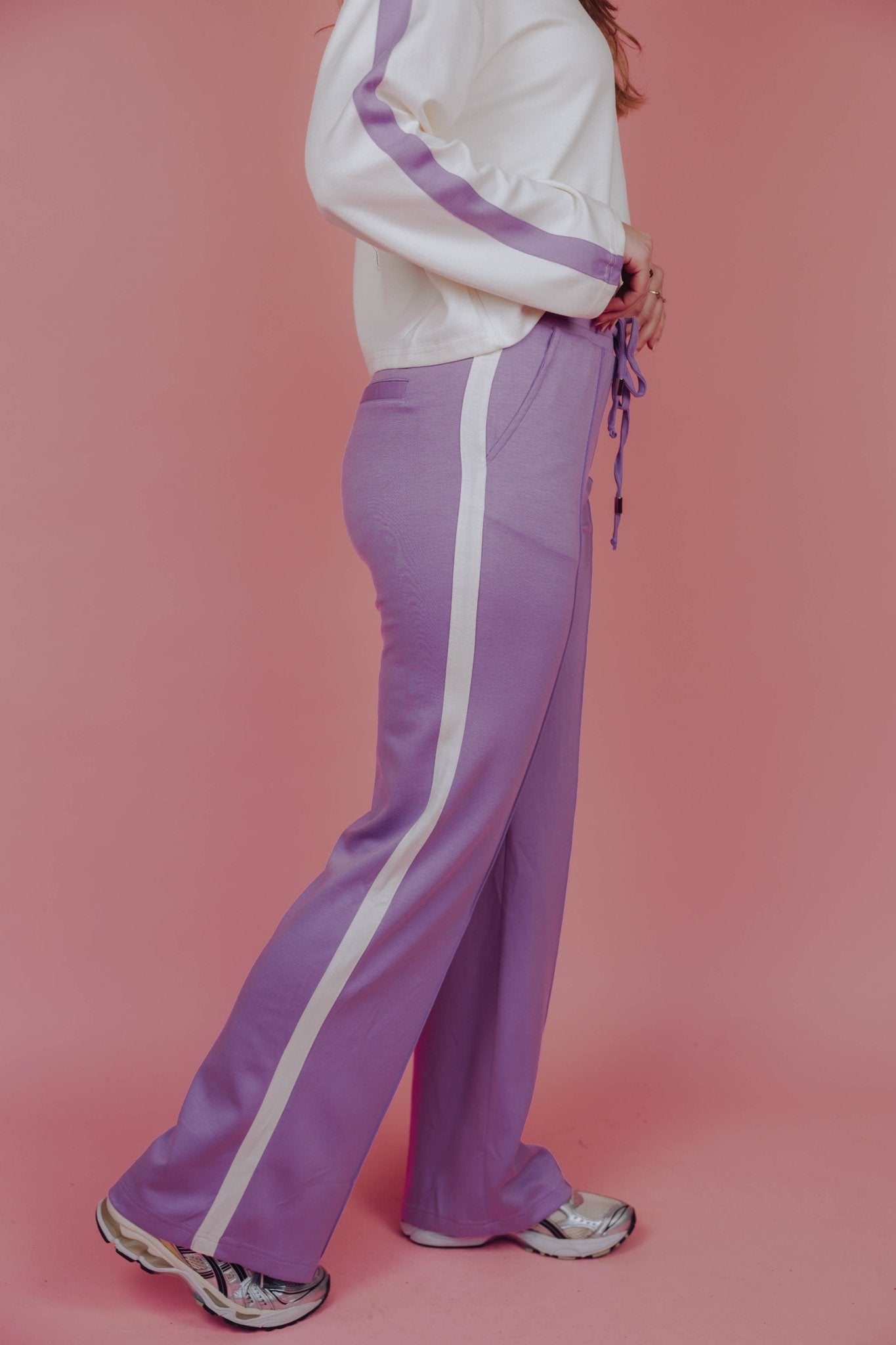 De Bente Pants in lila is een comfortabele wide leg jogger met een elastische tailleband met aantrekkoord en twee steekzakken. De zijkant van de broek is voorzien van strepen, wat hem een stoere touch geeft. Doordat de voorkant voorzien is van een biesje, is deze broek ook geschikt voor een nettere outfit. Combineer deze broek met de Bente Longsleeve voor een complete set.