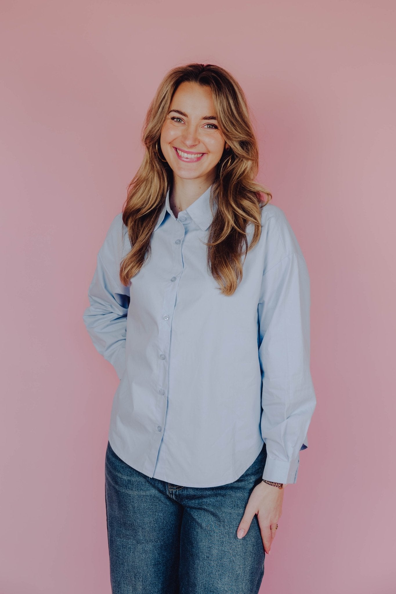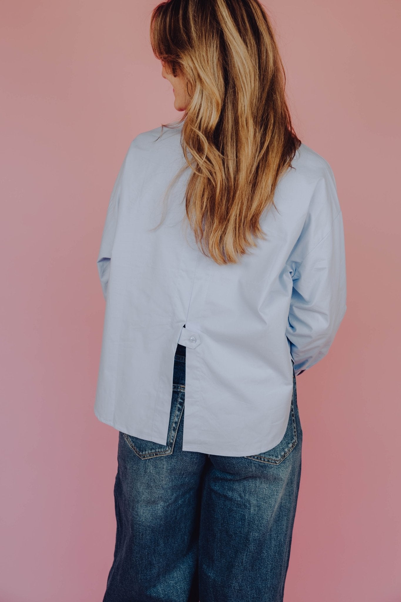 De Bibi Blouse in blauw is gemaakt van een luchtige stof en is voorzien van lange mouwen en een kraagje. De blouse heeft een boxy fit en is gemakkelijk te sluiten door middel van de knoopsluiting aan de voorkant. De blouse is daarnaast ook voorzien van een knoop detail op de achterkant, wat hem een speelse twist geeft.