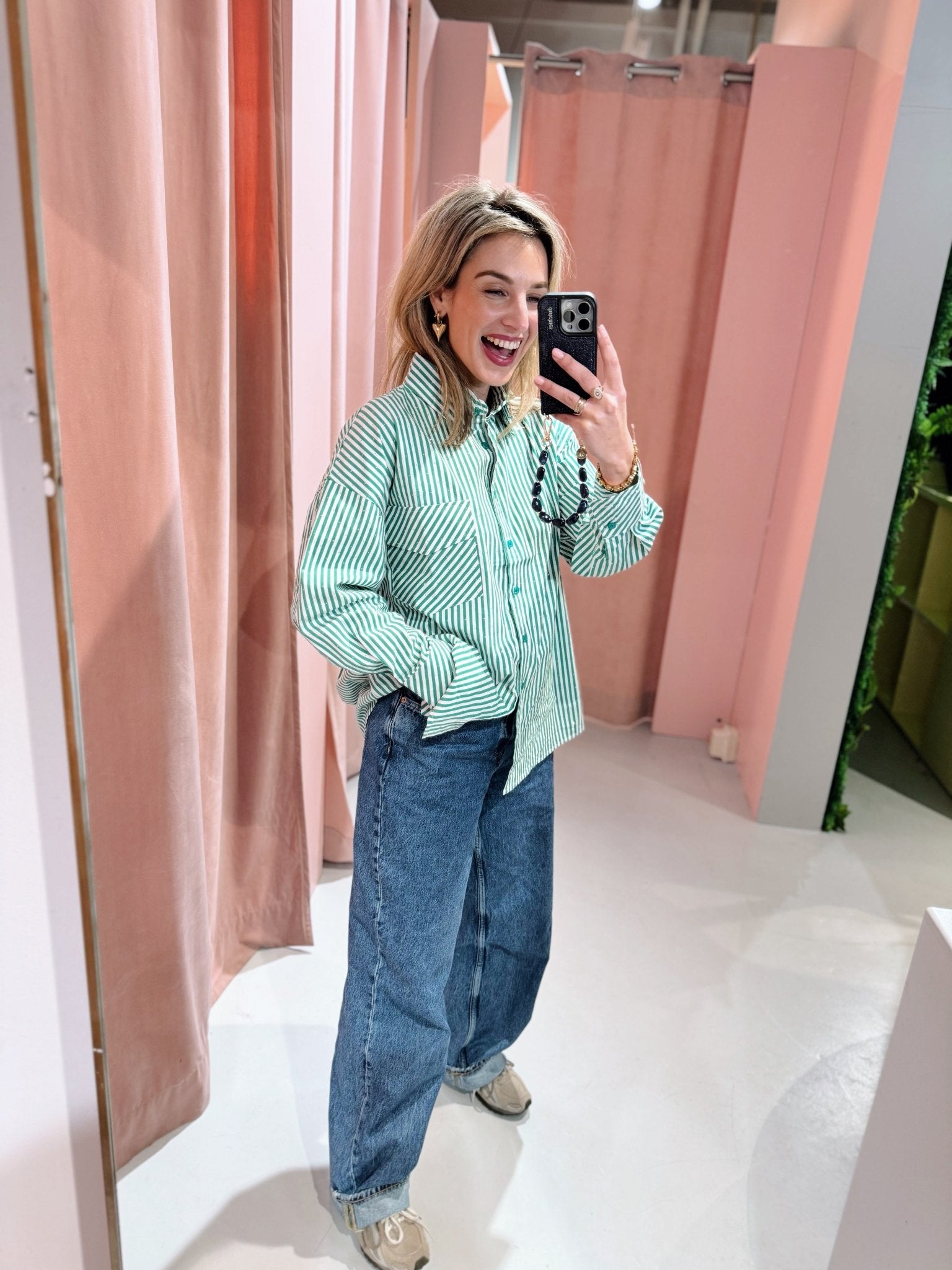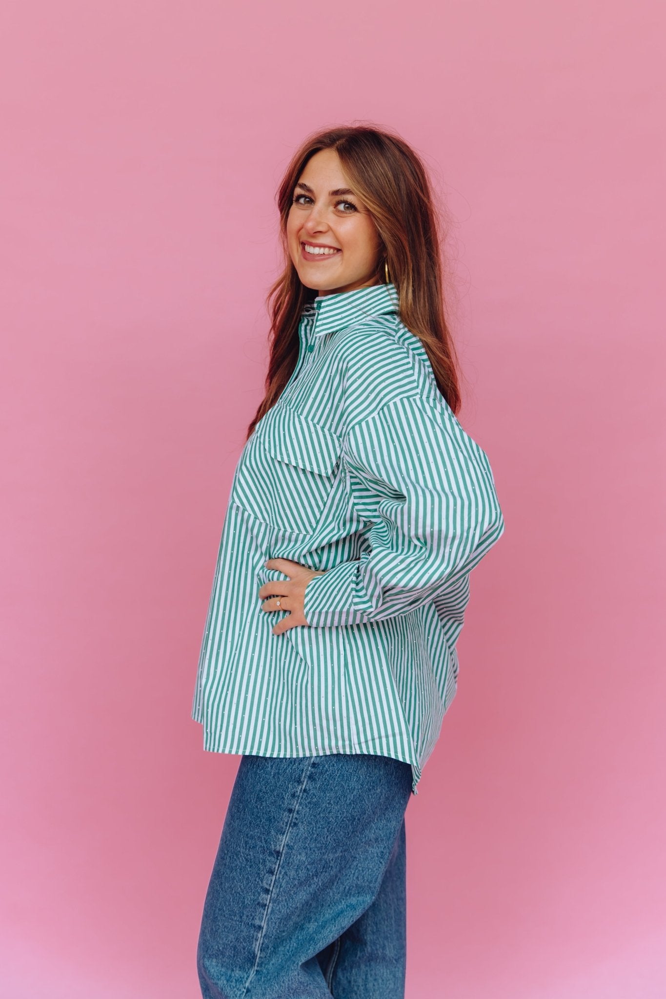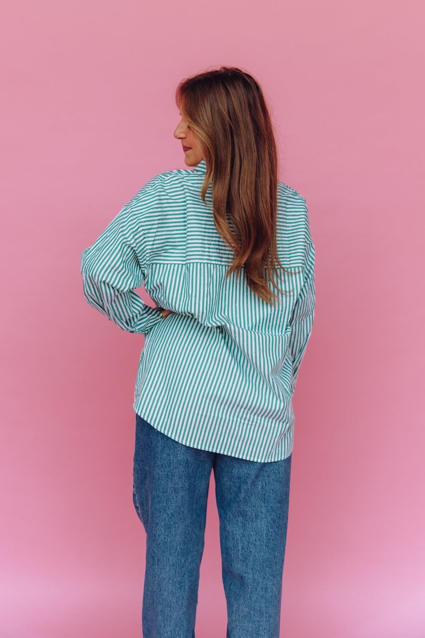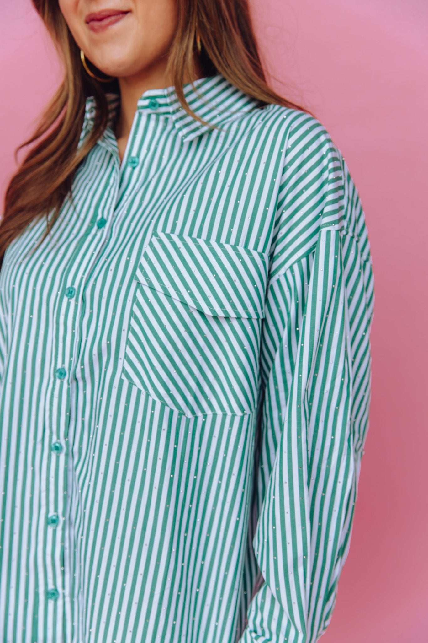 De Blise Blouse in groen is gemaakt van een luchtige stof en is voorzien van lange mouwen, een borstzak en een kraagje. Daarnaast heeft de blouse een streep patroon en een oversized fit. Je kunt de blouse gemakkelijk sluiten door middel van de knoopsluiting aan de voorkant. Doordat de blouse voorzien is van kleine glitter steentjes, is het een échte eyecatcher!