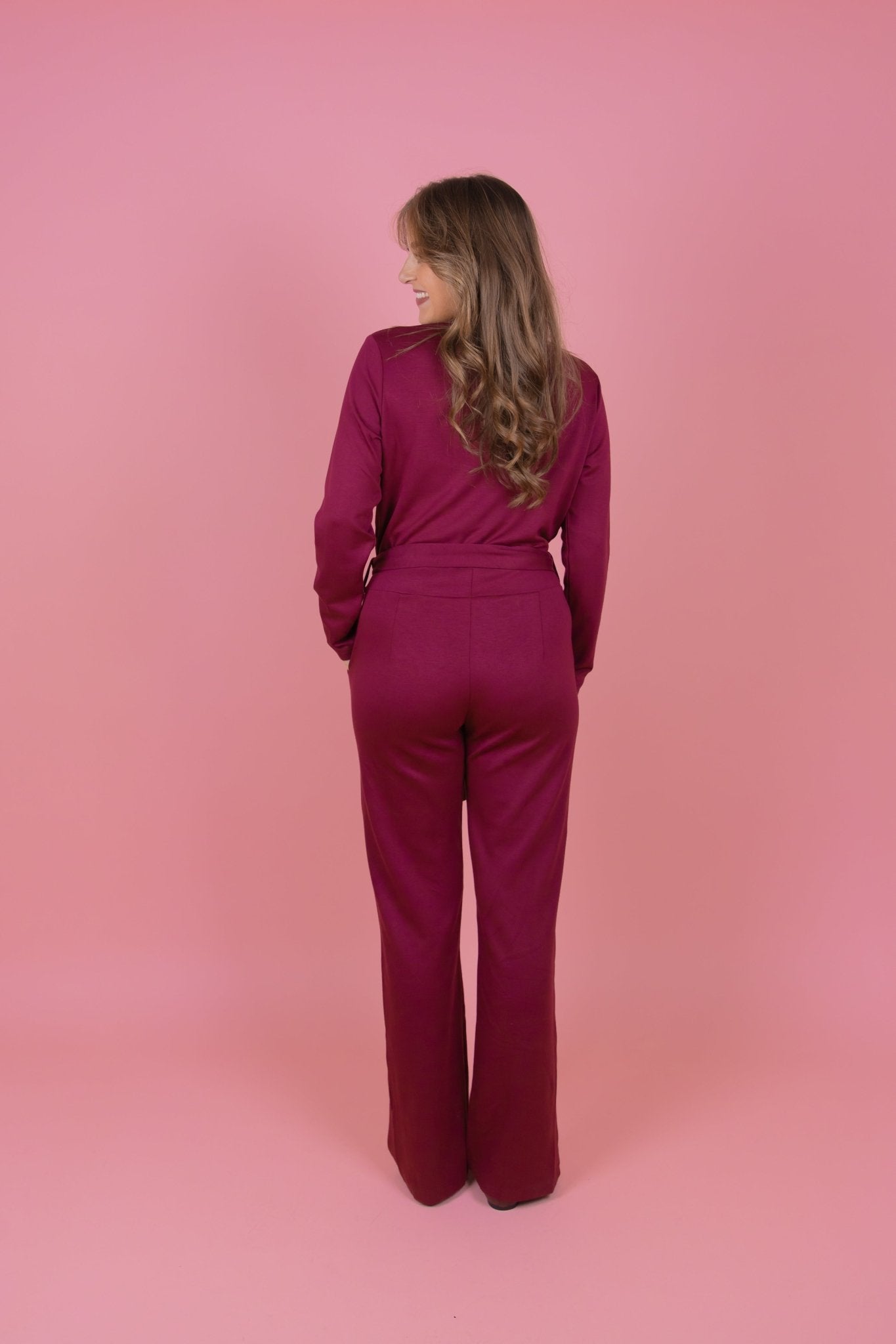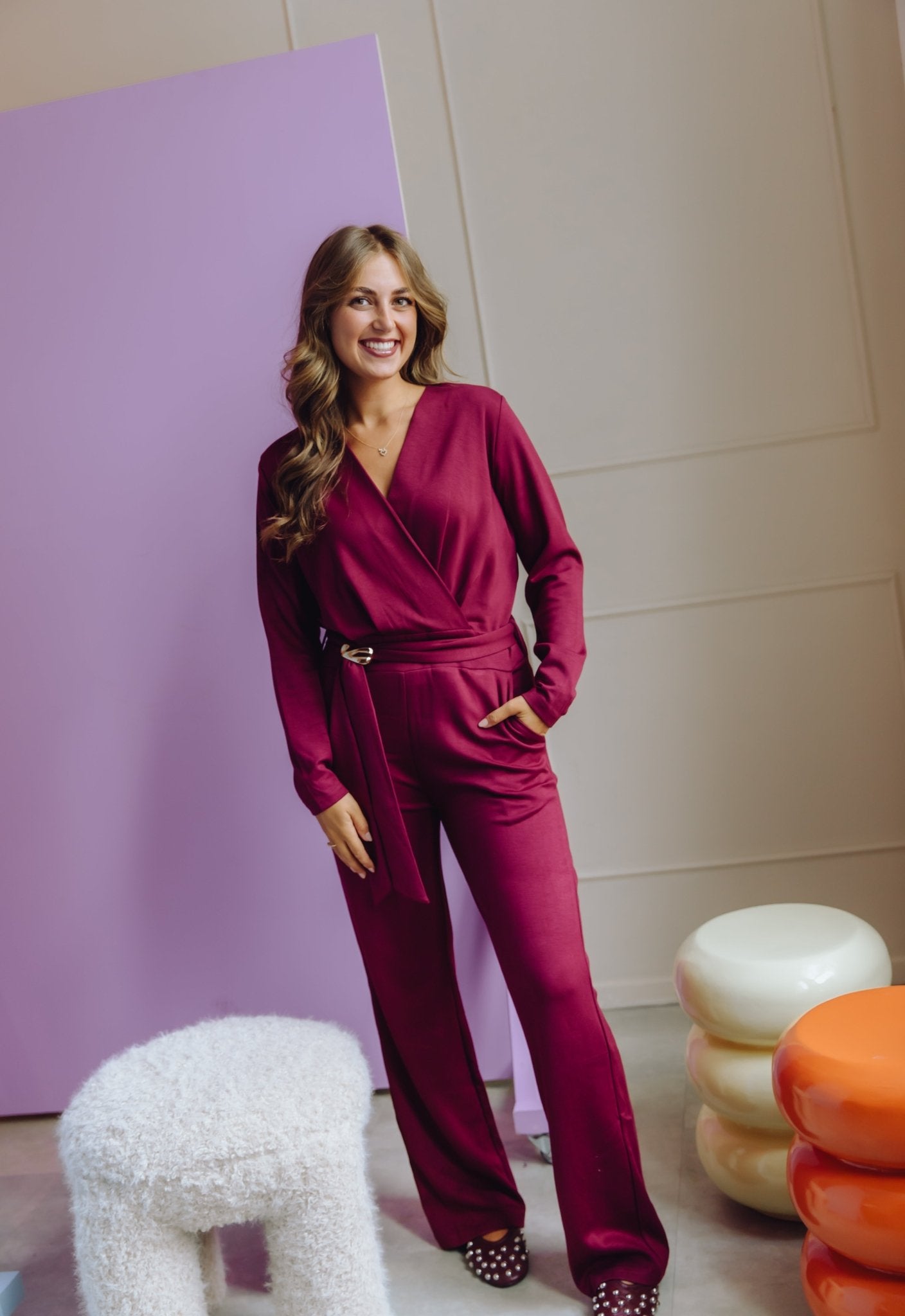 De Bliss Jumpsuit in bordeaux is een jumpsuit met een wide leg model. De jumpsuit heeft lange mouwen, steekzakken en een overslag V-hals. Daarnaast is de jumpsuit voorzien van een ceintuur met een gouden gesp, waardoor hij mooi tailleert. Bovendien sluit de jumpsuit mooi aan doordat hij veel stretch bevat.