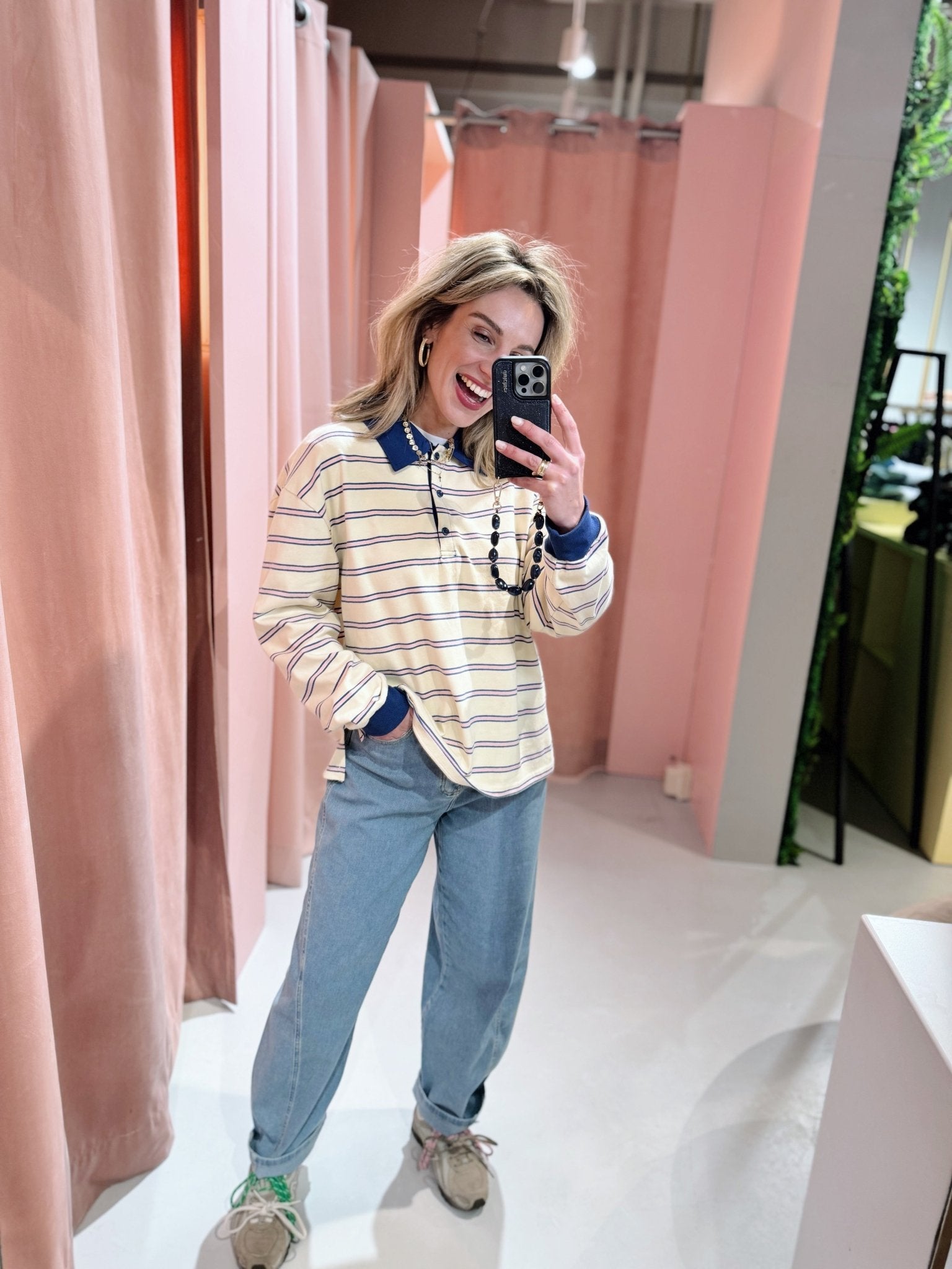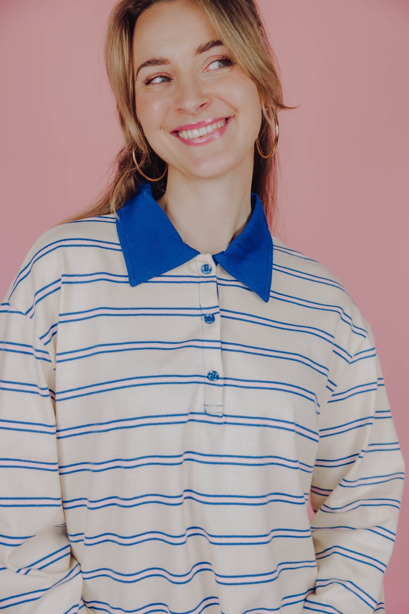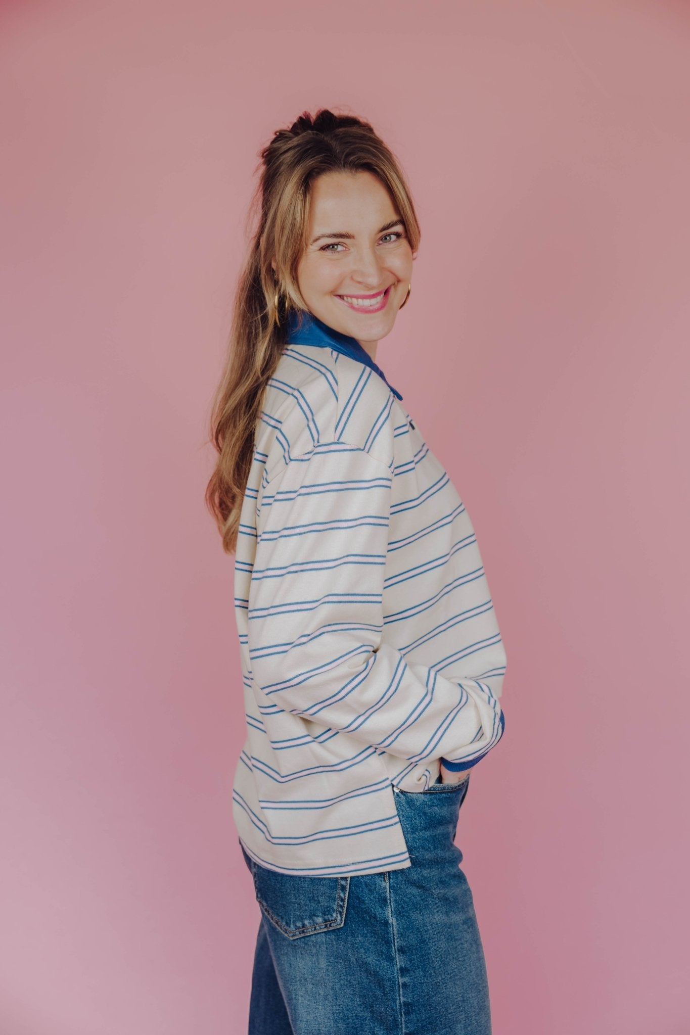 De Boaz Polo in blauw heeft een boxy model en een colorblock kraagje met knoopjes, de manchetten zijn dezelfde kleur als het kraagje, te leuk! De polo is voorzien van een blauw met roze streep patroon.