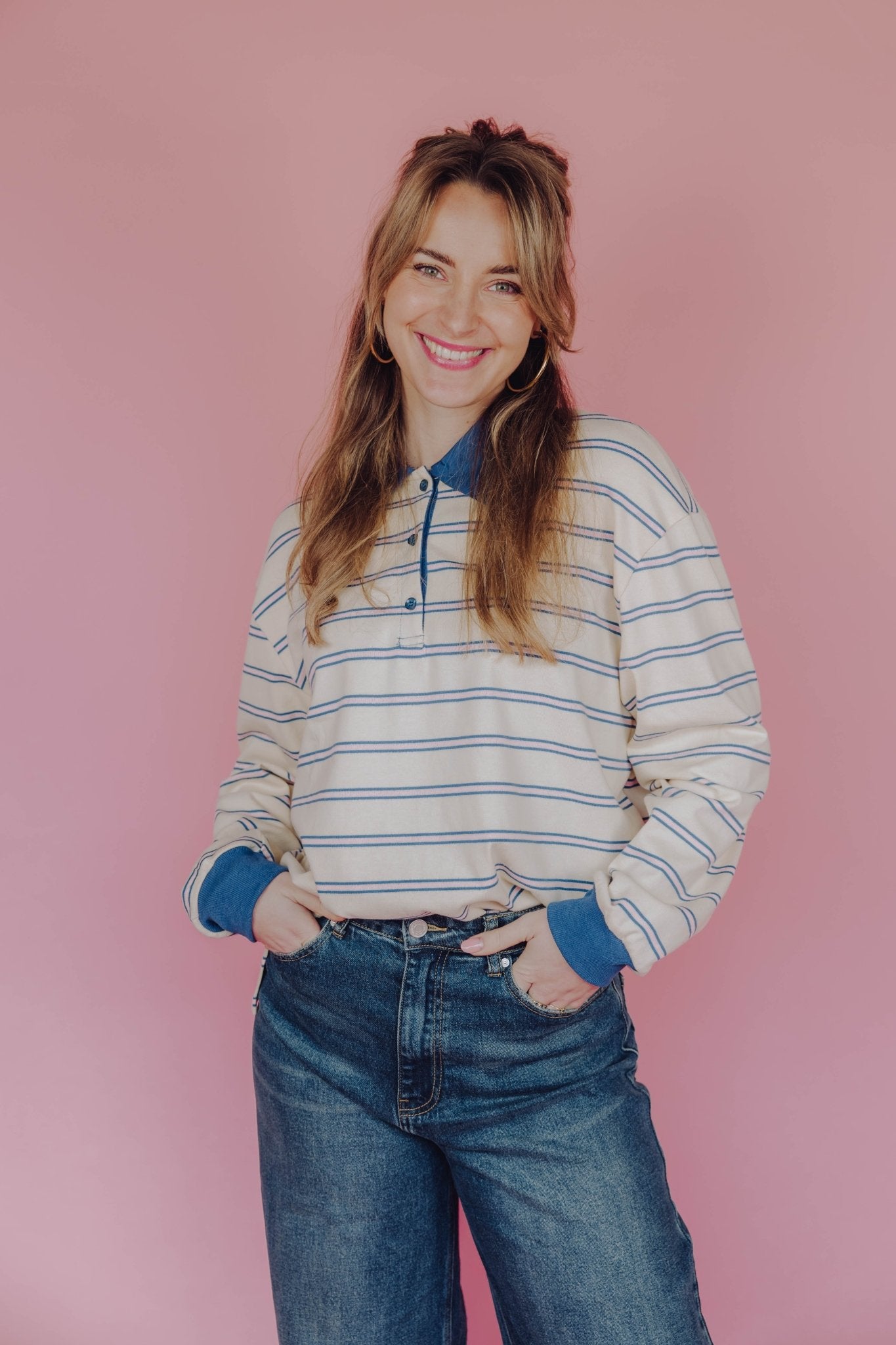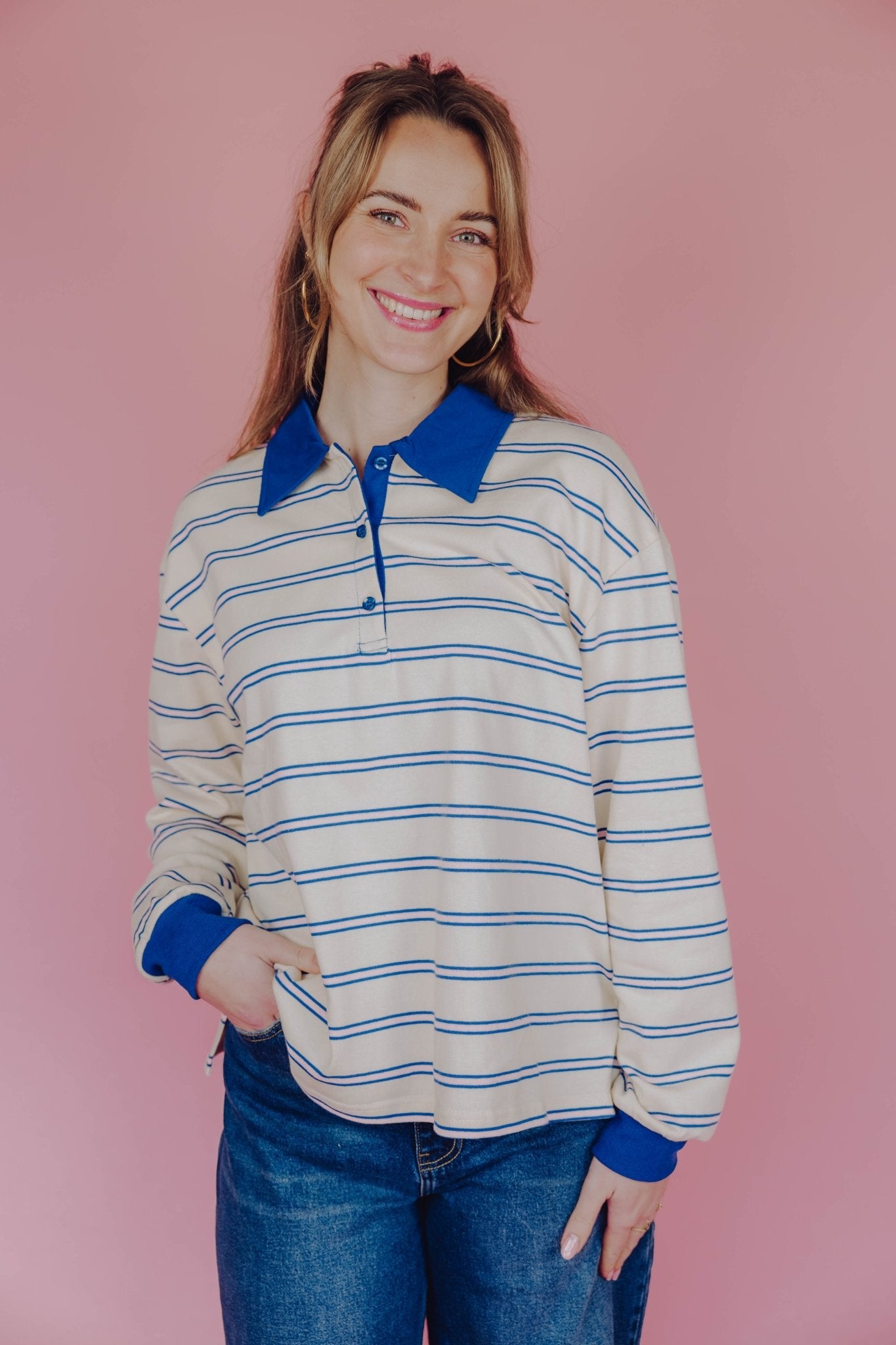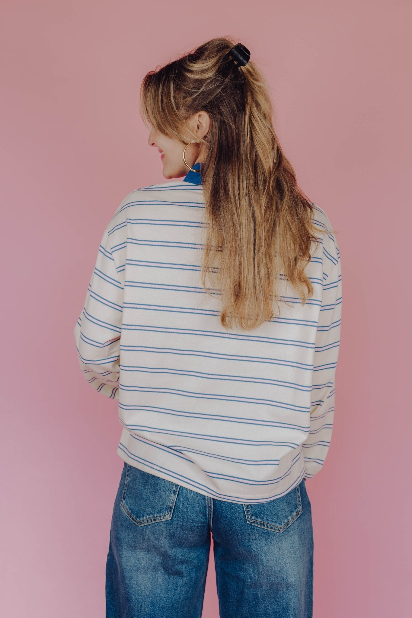 De Boaz Polo in blauw heeft een boxy model en een colorblock kraagje met knoopjes, de manchetten zijn dezelfde kleur als het kraagje, te leuk! De polo is voorzien van een blauw met roze streep patroon.