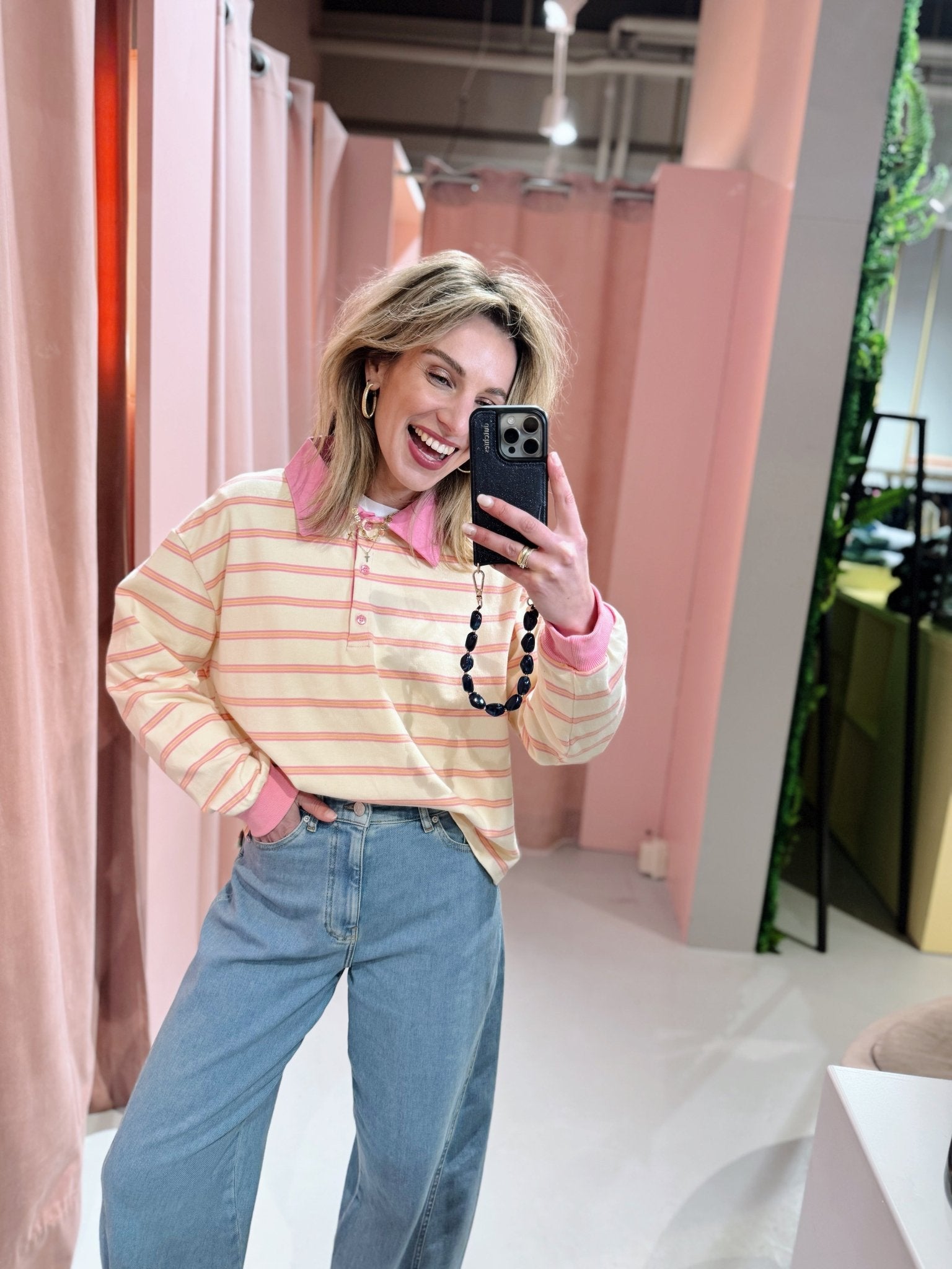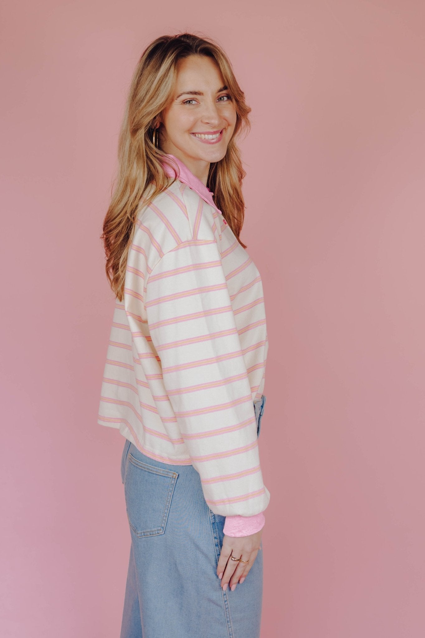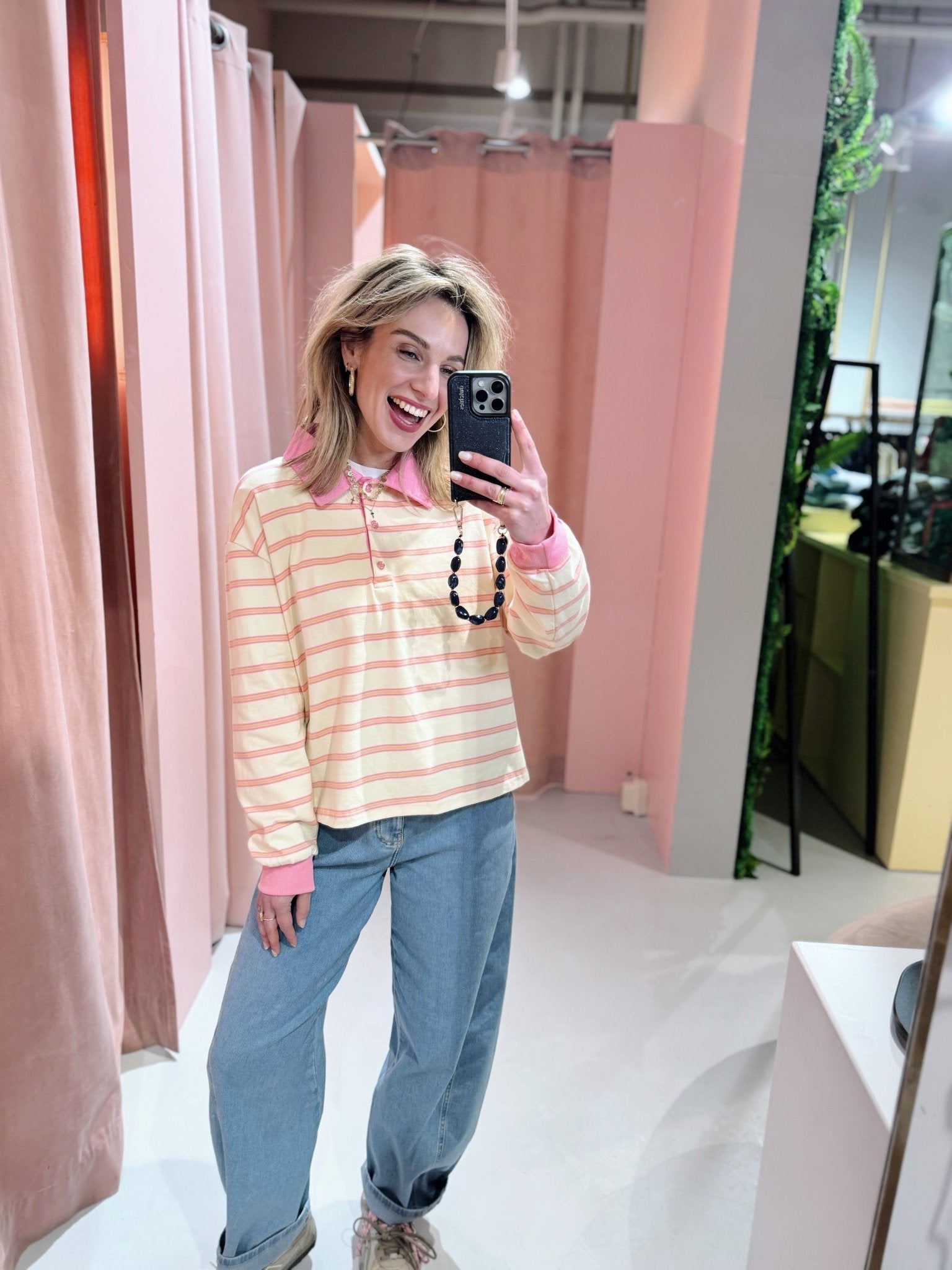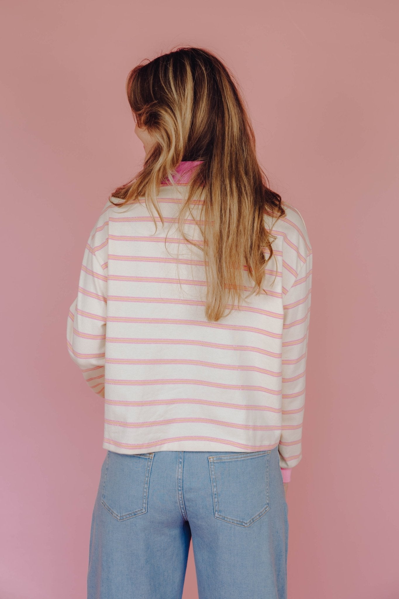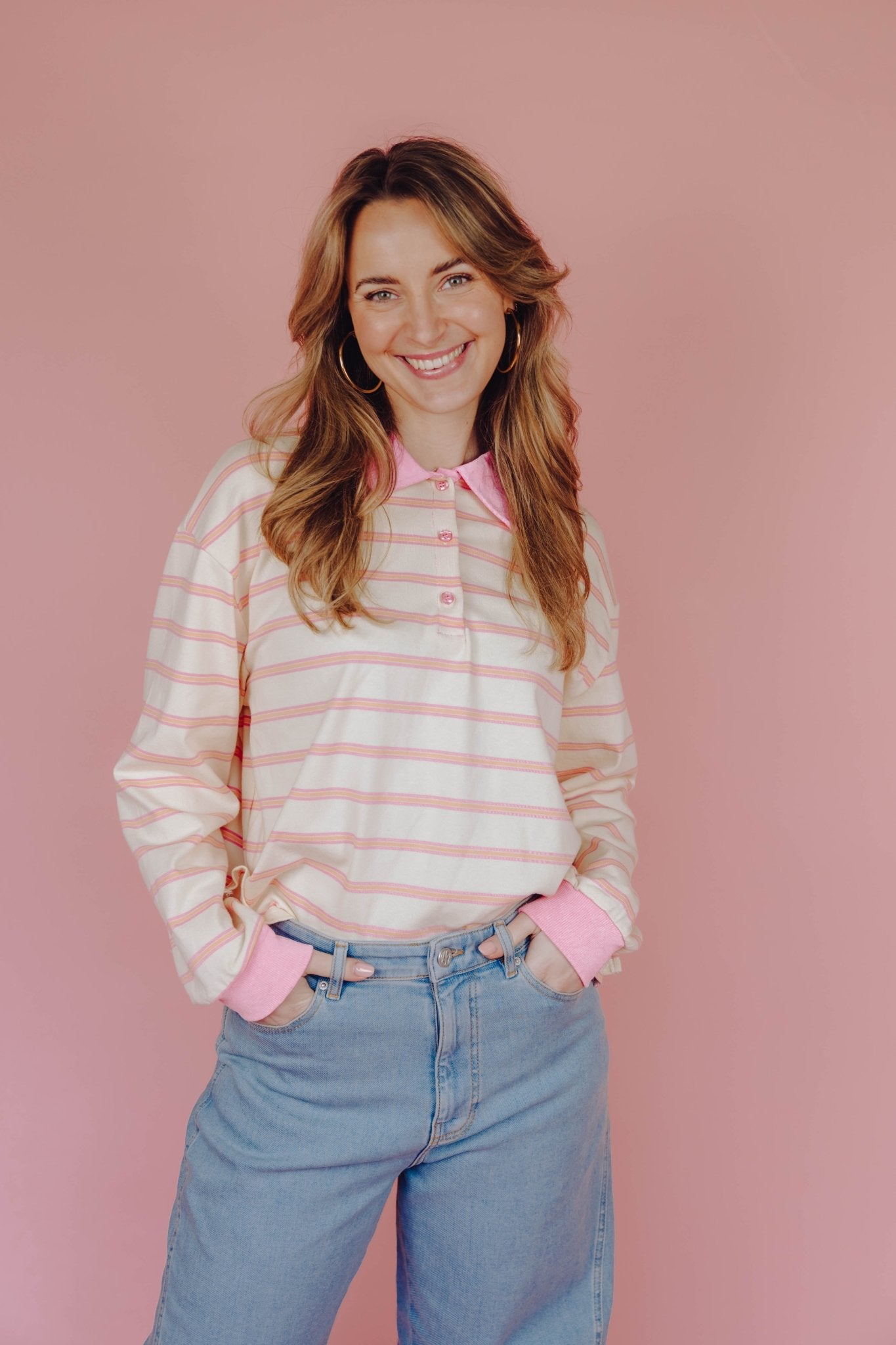 De Boaz Polo in roze heeft een boxy model en een colorblock kraagje met knoopjes, de manchetten zijn dezelfde kleur als het kraagje, te leuk! De polo is voorzien van een oranje met roze streep patroon.