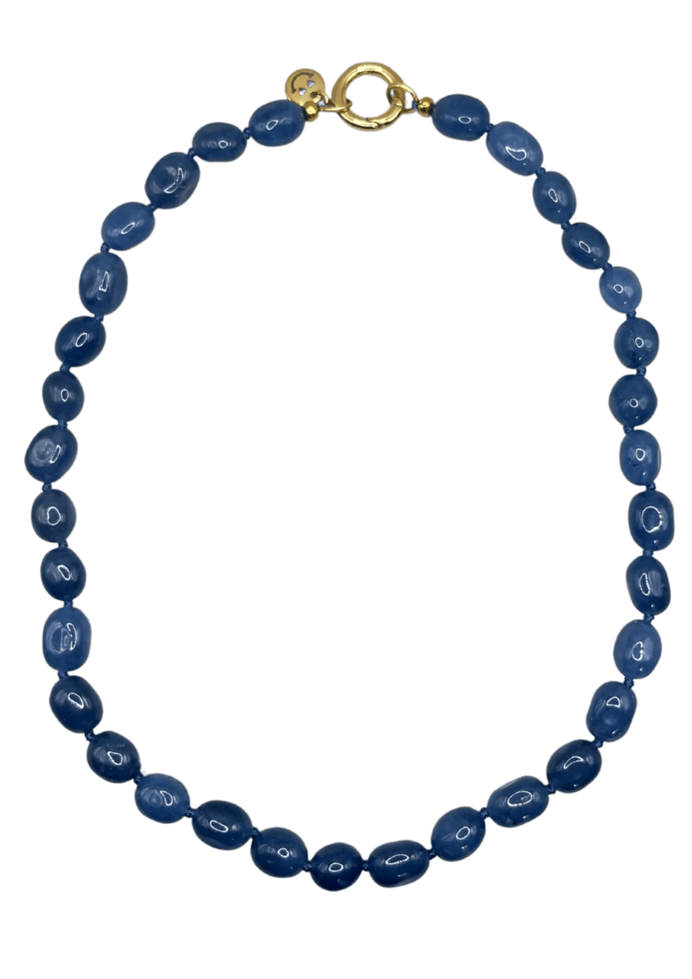 Deze ketting is gemaakt van gladde blauwe jadekralen die rust en frisheid uitstralen. Dankzij de ronde vormen en de zachte glans is dit een tijdloos sieraad dat zowel bij een casual outfit als bij een klassieke look past. De ketting sluit met een roestvrijstalen sluiting die is afgewerkt met 14K goud.