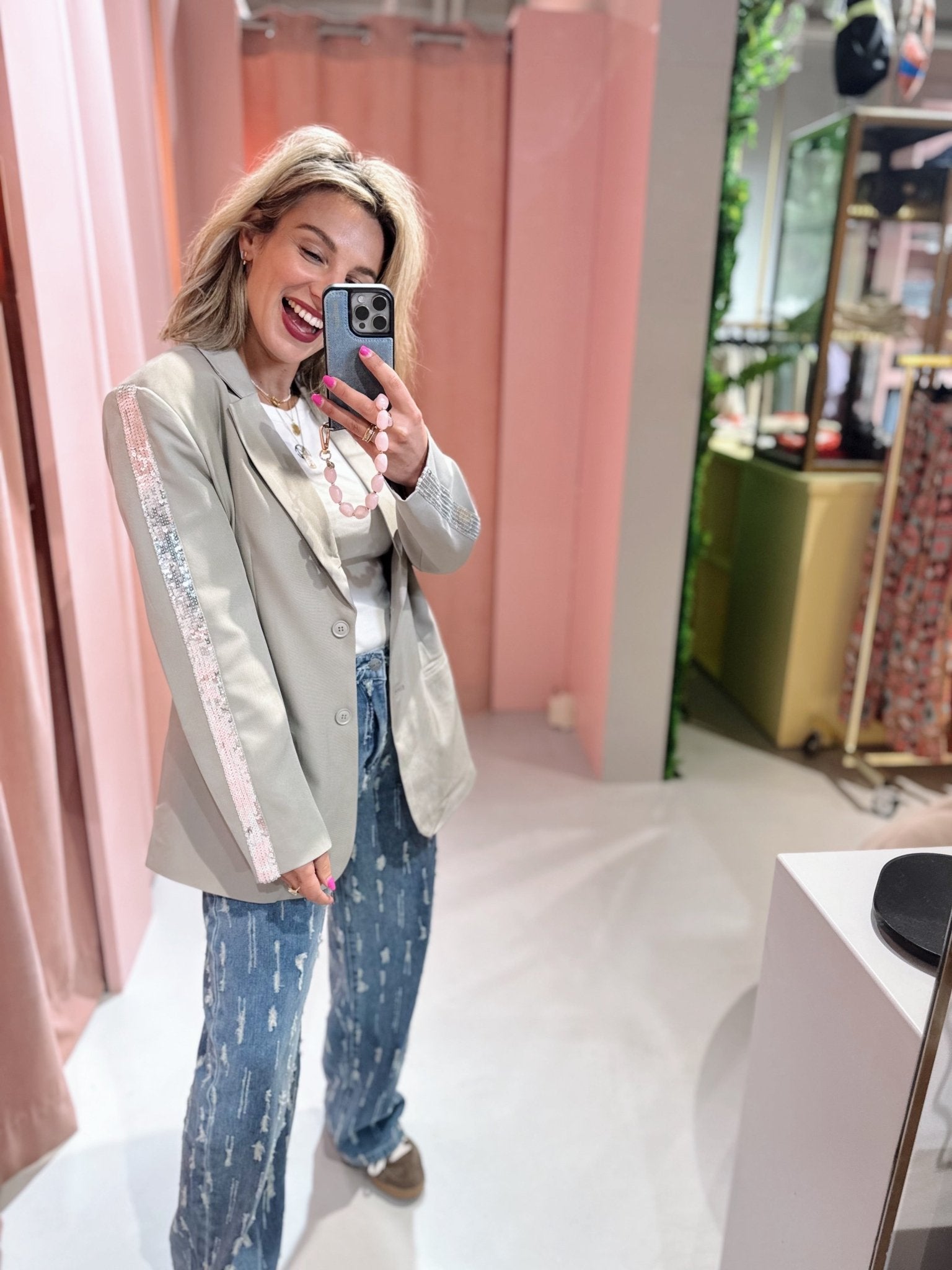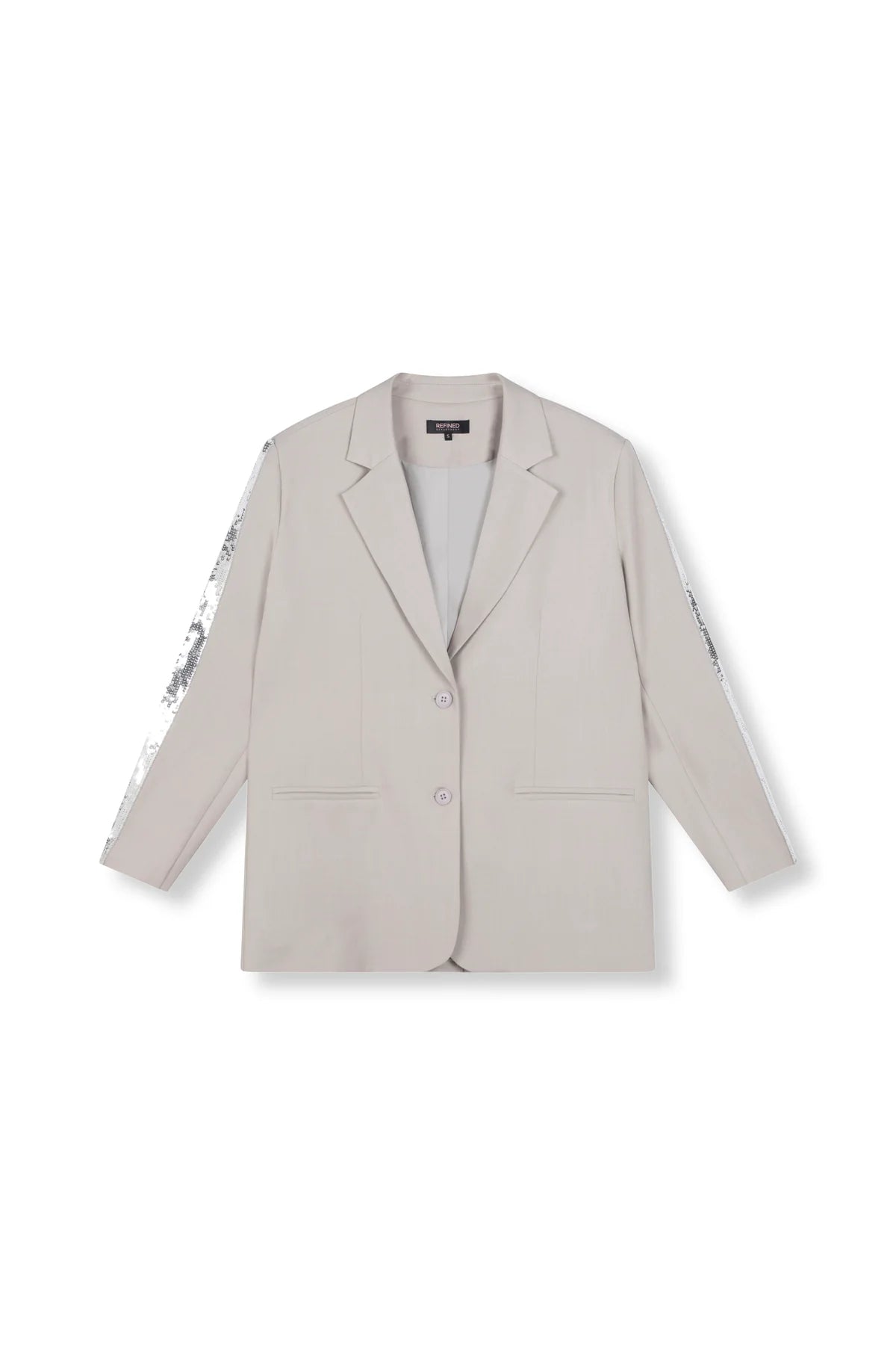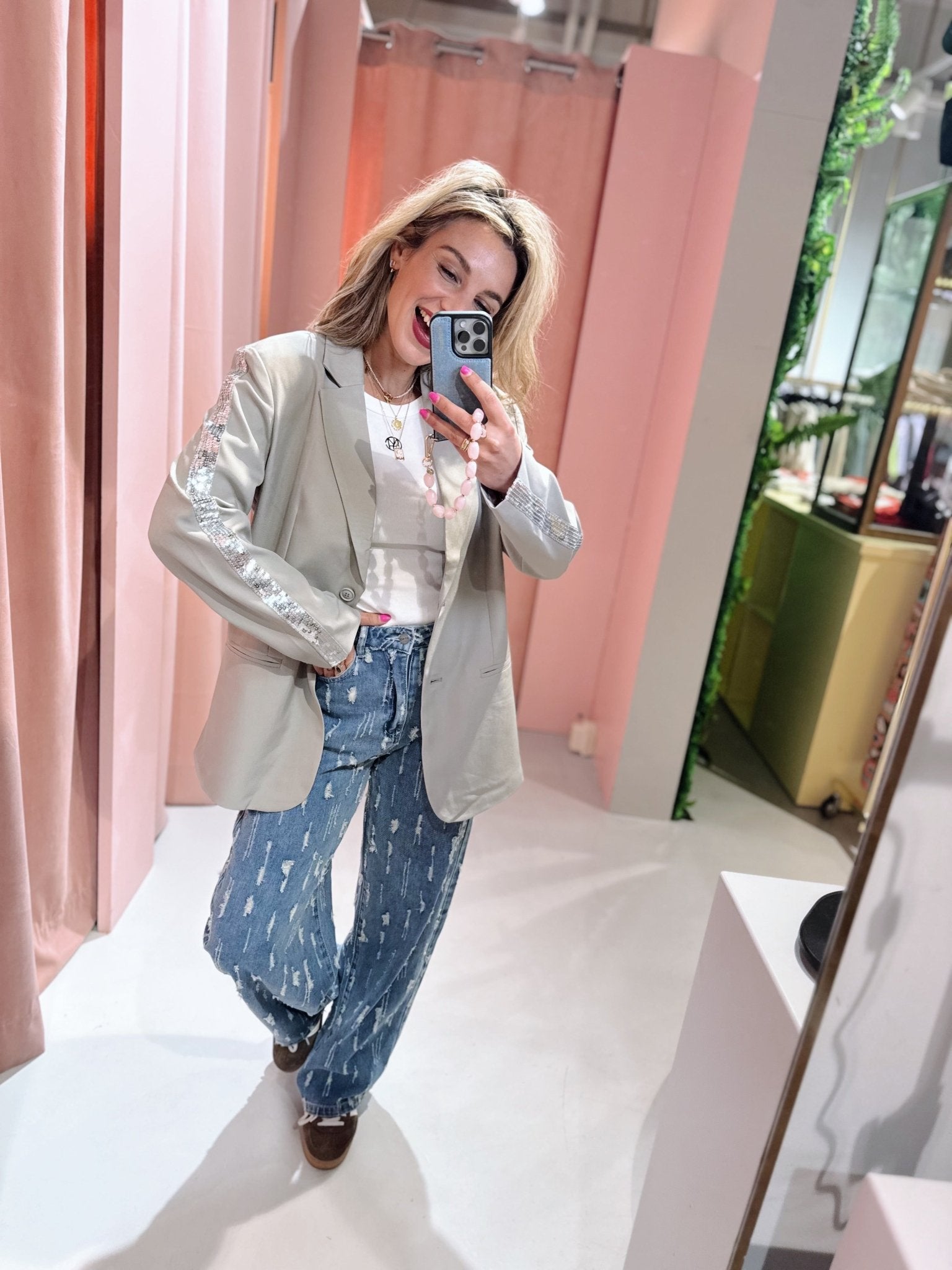 De Bodi Blazer in grijs is een echte showstopper uit de nieuwste drop van RFND. Deze oversized blazer is gemaakt van een luxe stof met lichte stretch, waardoor hij niet alleen stijlvol is, maar ook comfortabel draagt. Wat deze blazer zo leuk maakt? De sequins op de mouwen! De dubbele knoopsluiting, klassieke reverskraag en schoudervulling geven de blazer een classy uitstraling met een opvallende touch, perfect voor een bold day-to-night outfit.
