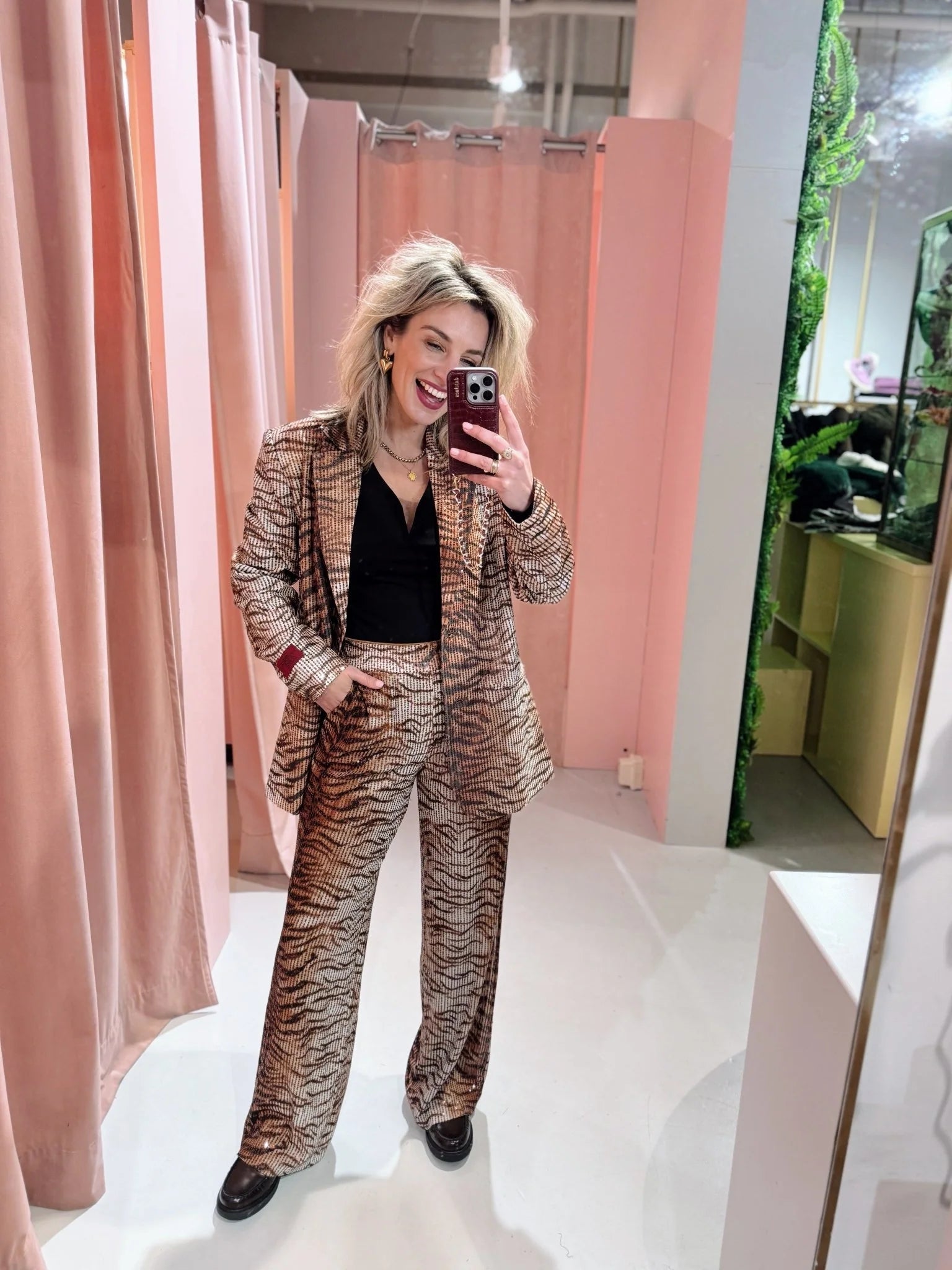 De Bodi Blazer in tiger van Refined Department is een echte eyecatcher. Deze blazer combineert een tijdloos silhouet met een opvallende, glanzende animalprint. Het rechte model met oversized fit geeft de blazer een moderne uitstraling, terwijl de pailletten hem een chique touch geven. Draag hem als statement item met de bijpassende broek voor een complete look, of combineer hem met een basic jeans voor een stijlvolle, casual outfit.