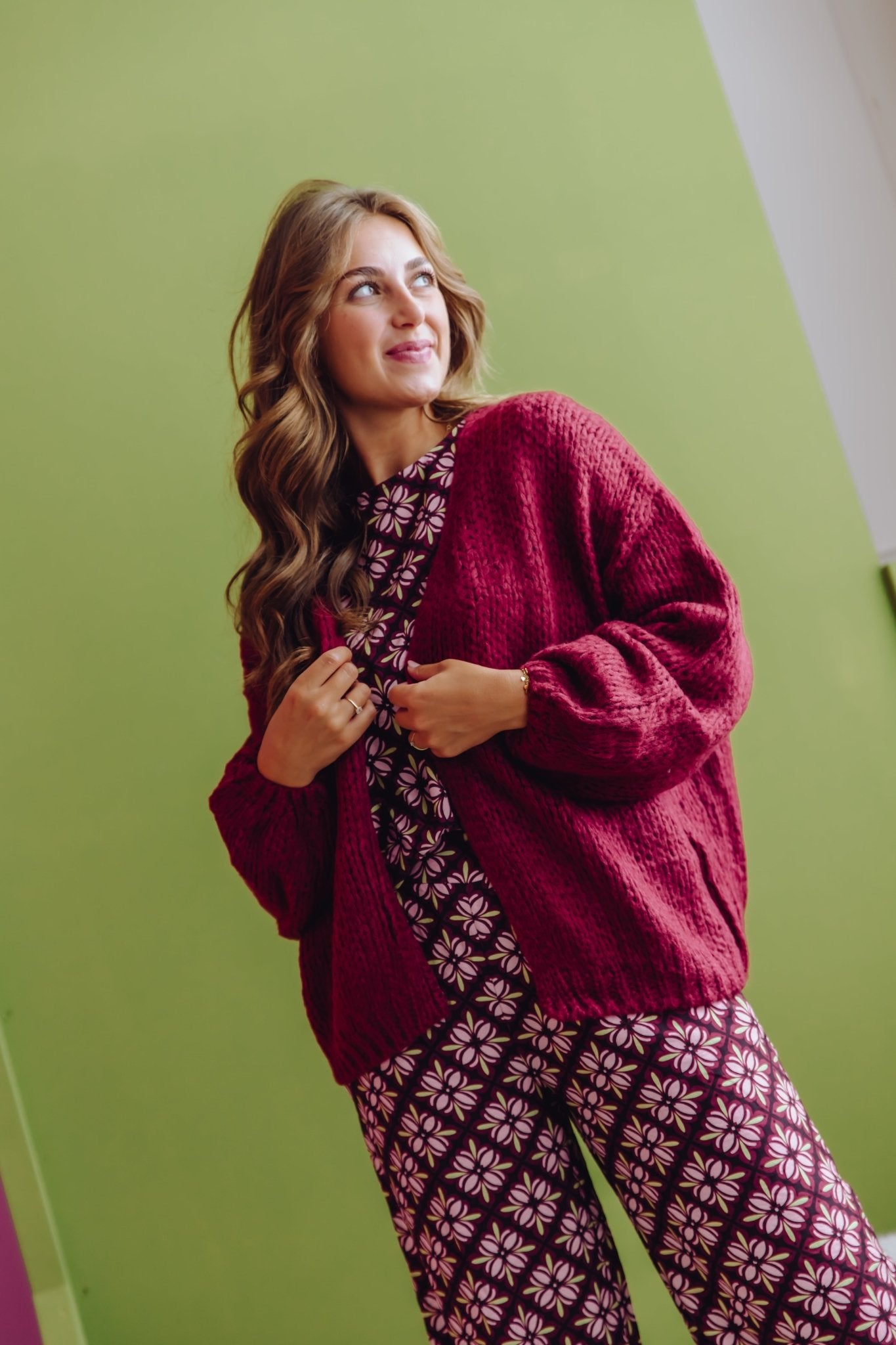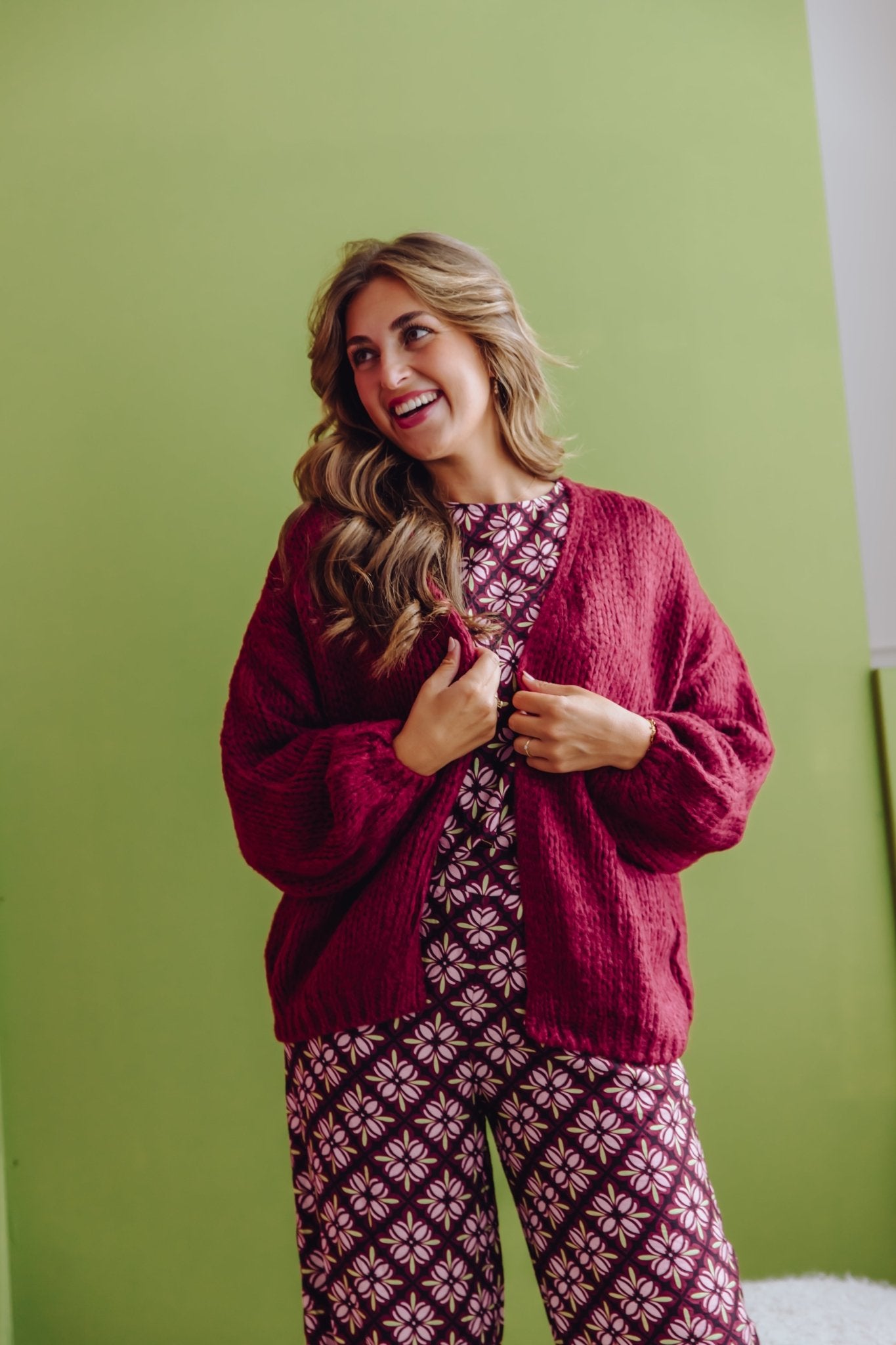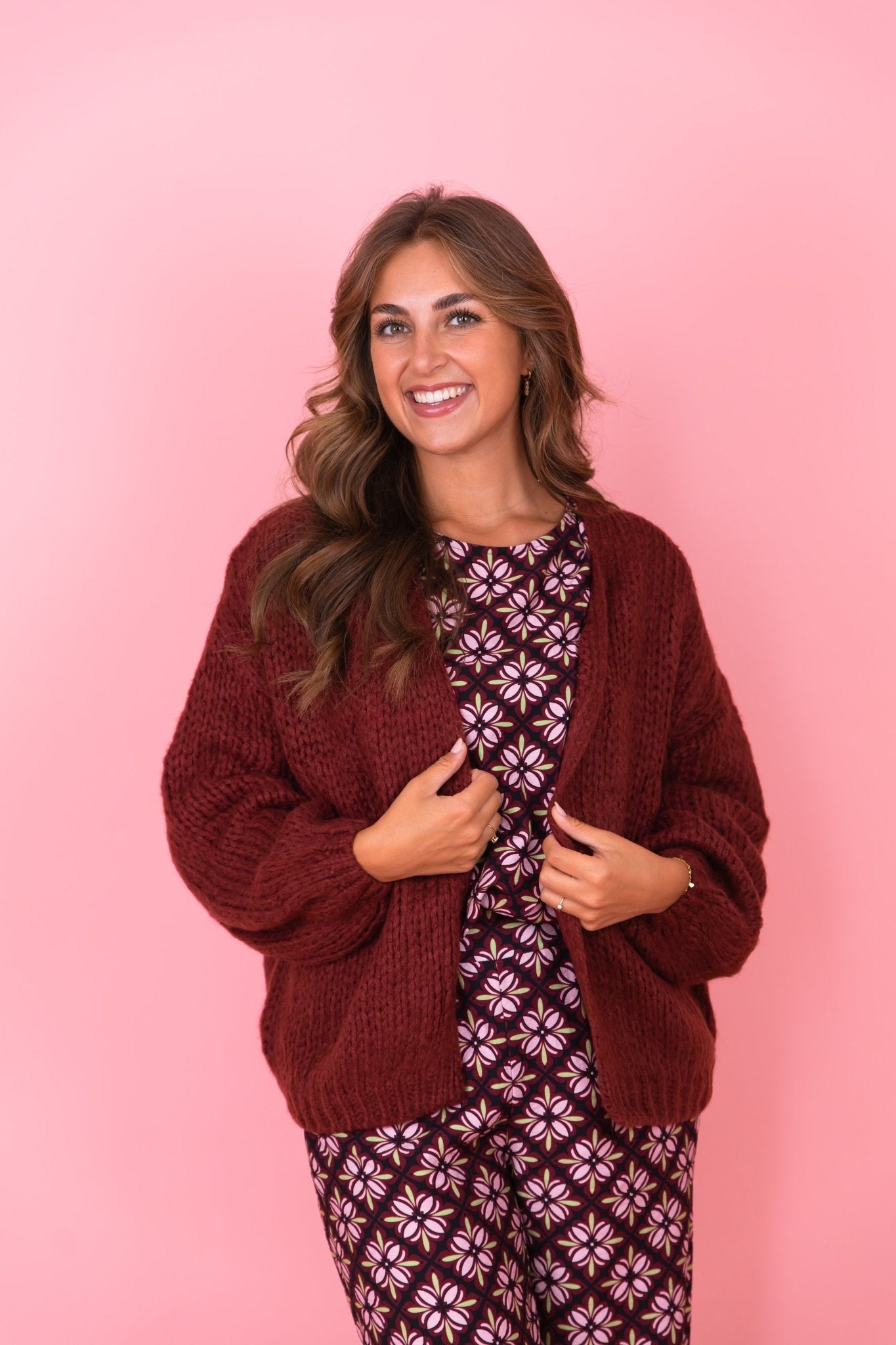 De Brooke Cardigan in bordeaux is gemaakt van een gebreid materiaal, waardoor hij heerlijk warm is! Het vest heeft lange pofmouwen, een oversized fit en is leuk te dragen op een longsleeve en een jeans.