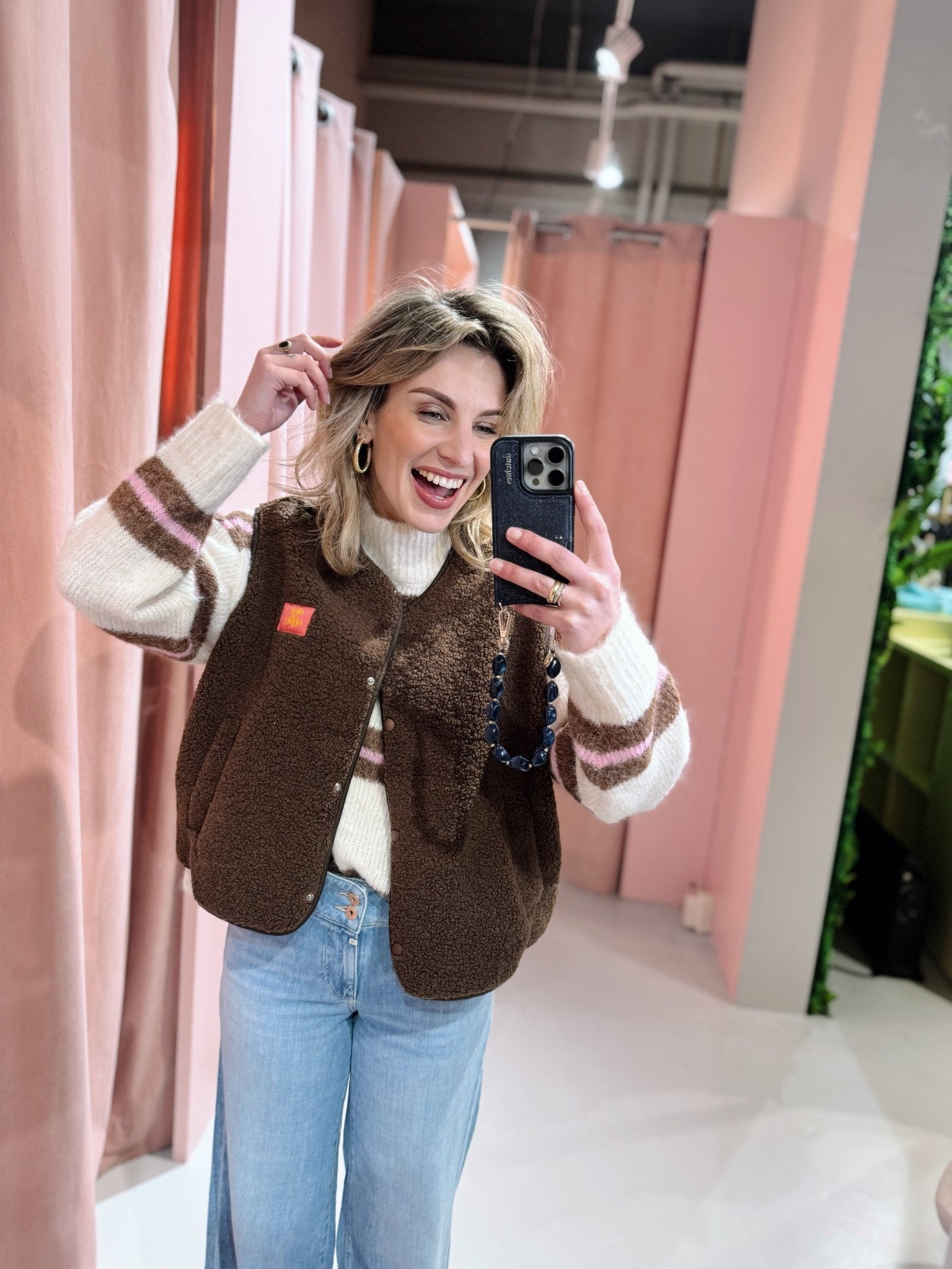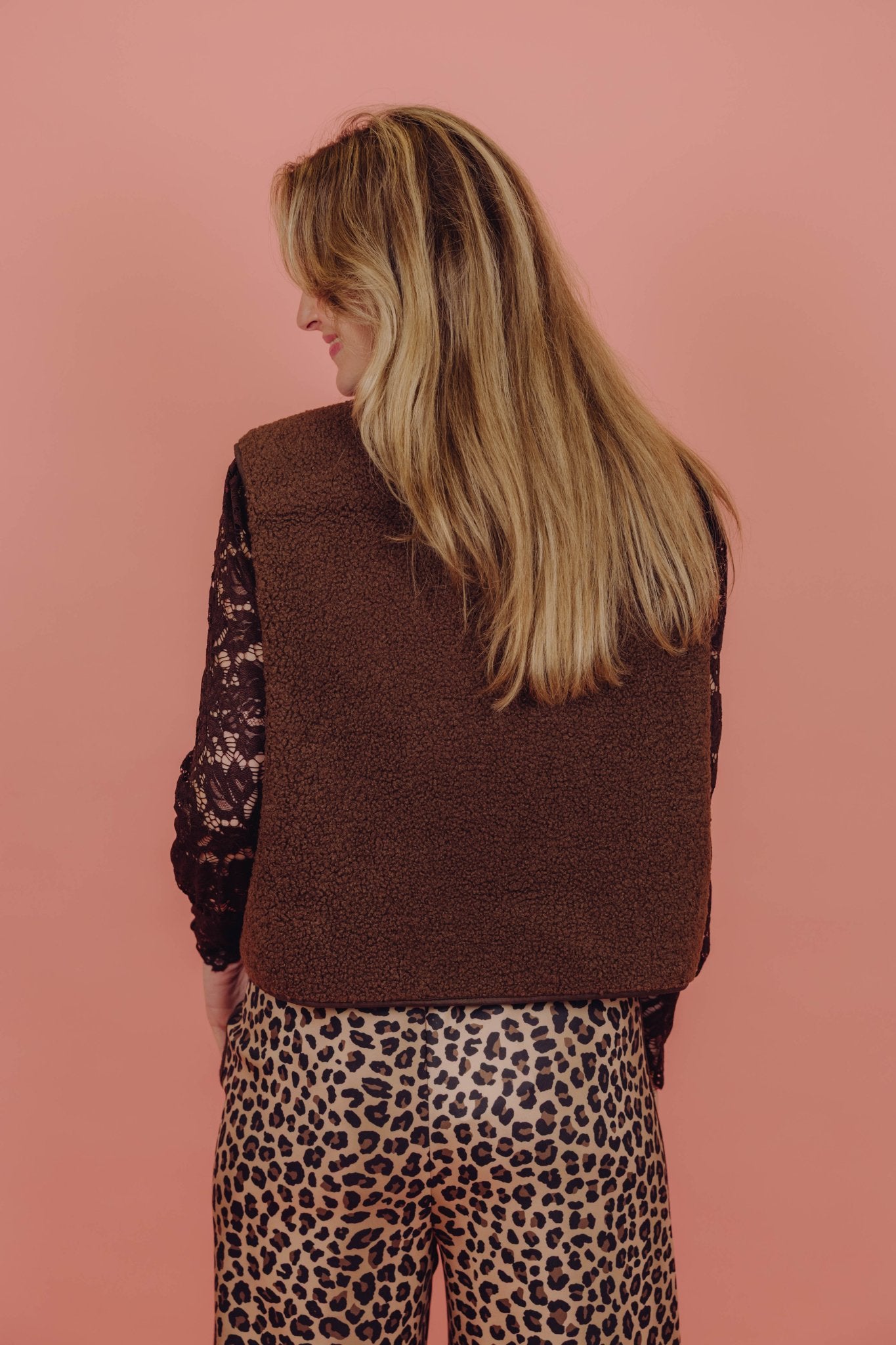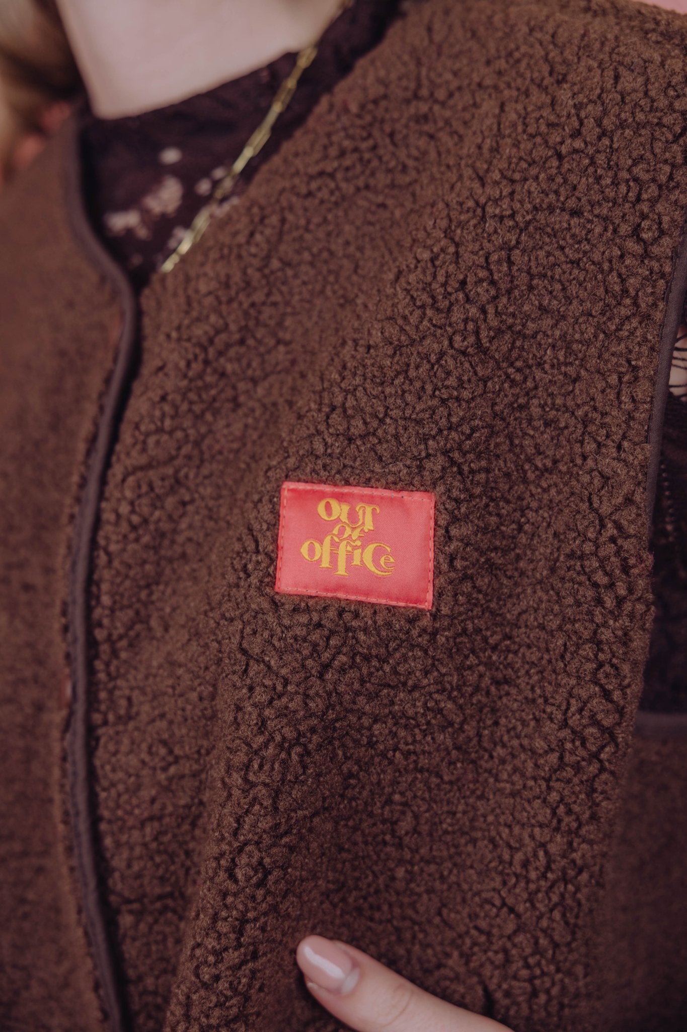 Het Carmen Teddy Gilet in bruin is een zachte teddy bodywarmer en perfect voor de koude dagen. Het gilet is heerlijk warm en is voorzien van twee steekzakken en een knoopsluiting aan de voorkant. Op de linker borst zit een patch met de tekst “ouf of office”, wat zorgt voor een leuk en speels detail.