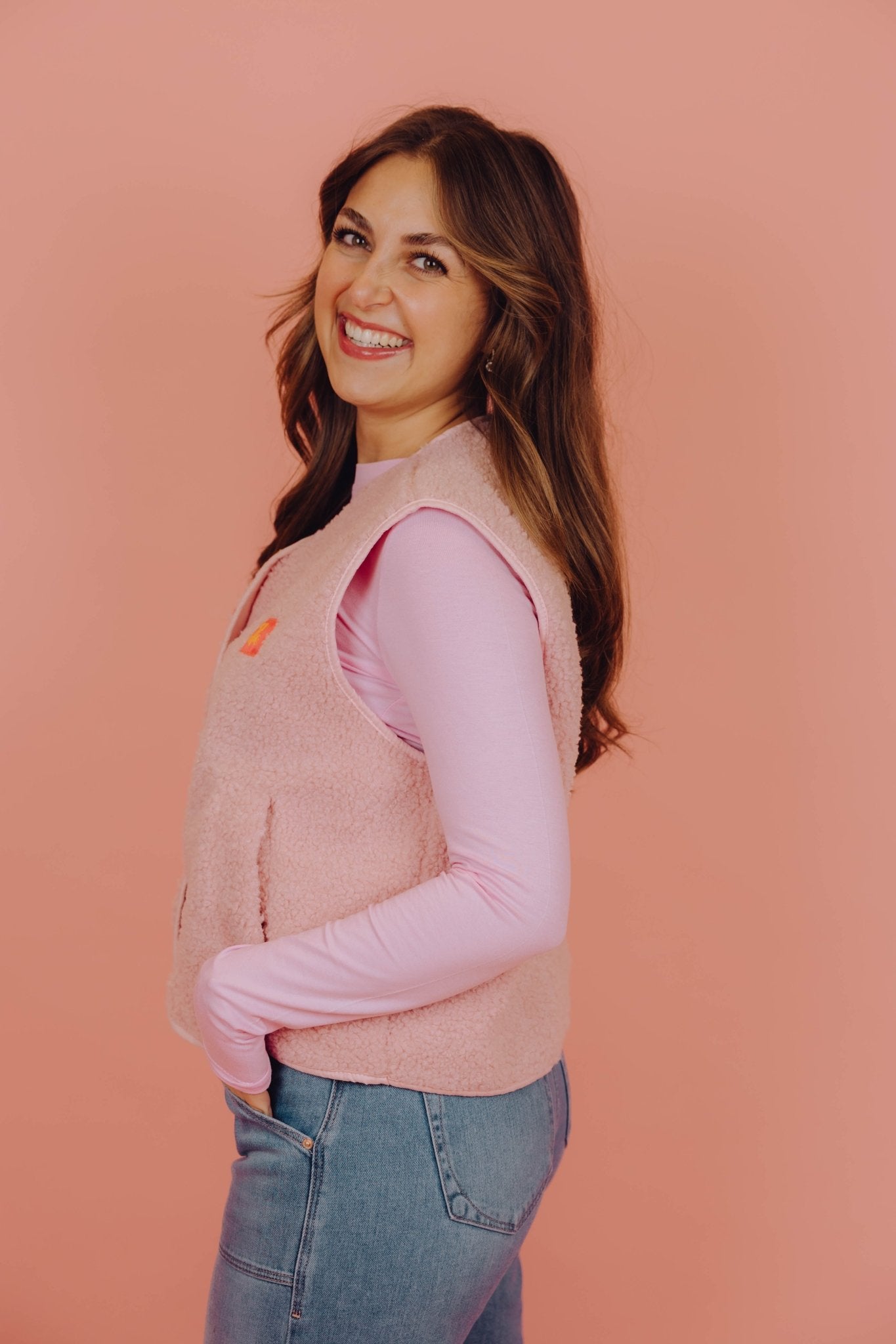 Het Carmen Teddy Gilet in lichtroze is een zachte teddy bodywarmer en perfect voor de koude dagen. Het gilet is heerlijk warm en is voorzien van twee steekzakken en een knoopsluiting aan de voorkant. Op de linker borst zit een patch met de tekst “ouf of office”, wat zorgt voor een leuk en speels detail.