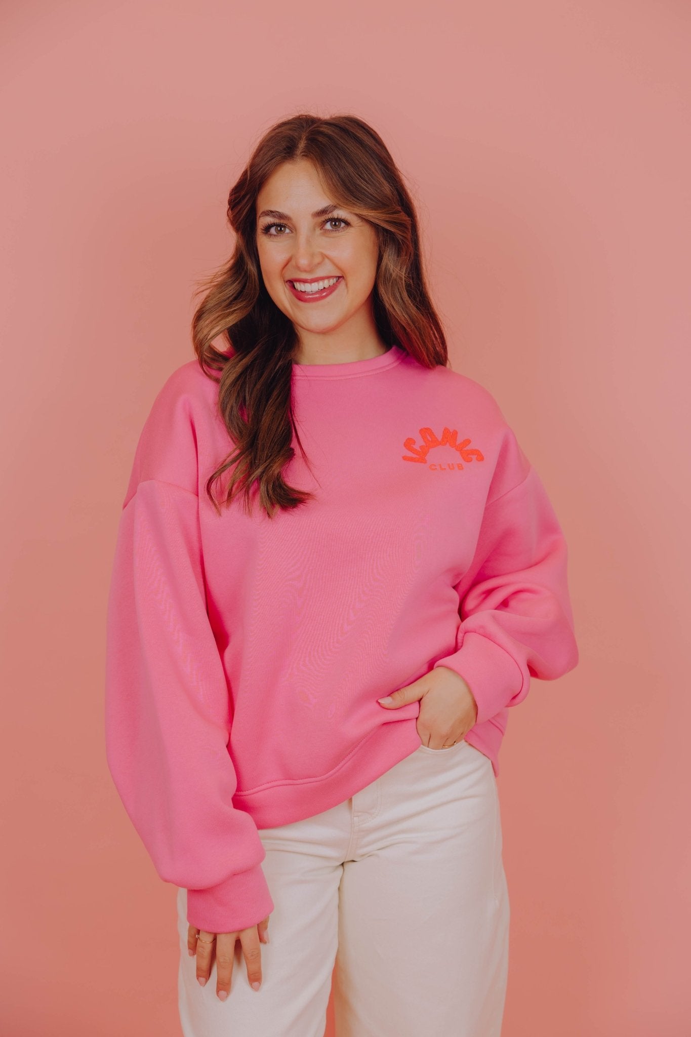 De Cato Sweater in roze is een oversized trui met lange mouwen, een ronde halslijn en een fleece binnenkant. De trui heeft een losse pasvorm en is voorzien van een teddy opdruk met de tekst "Iconic club" op de voor- en achterkant.