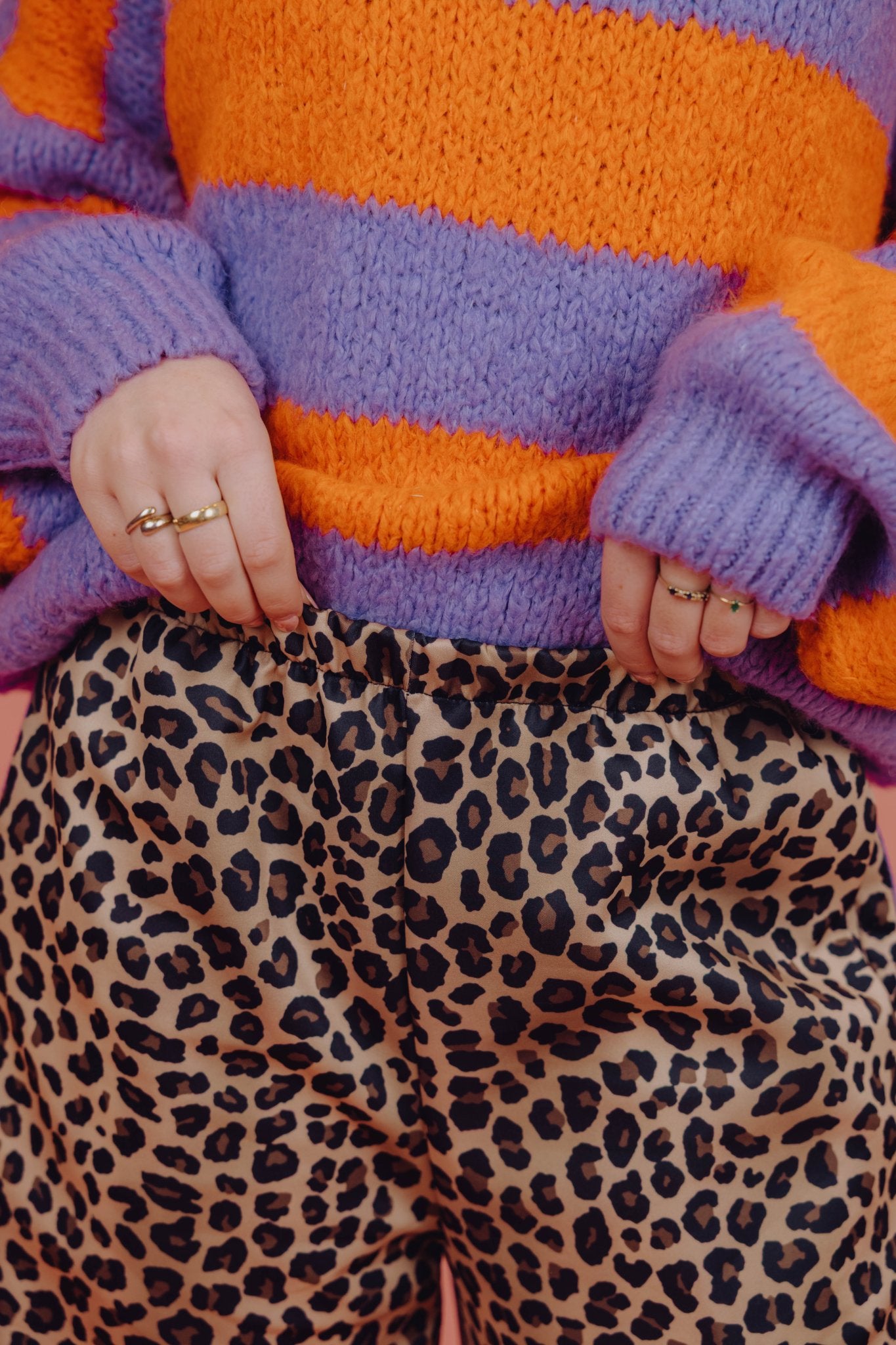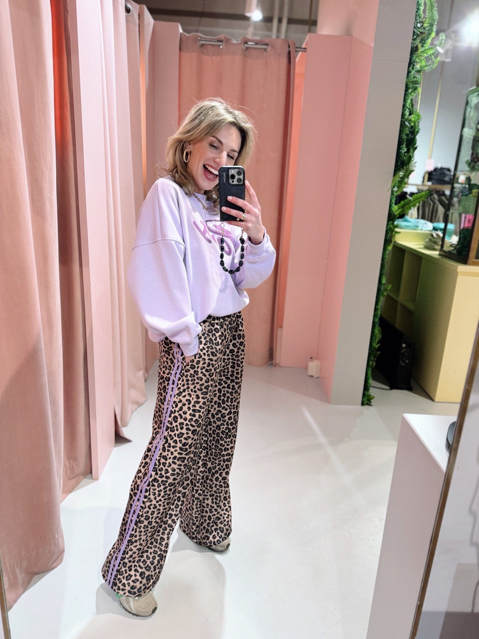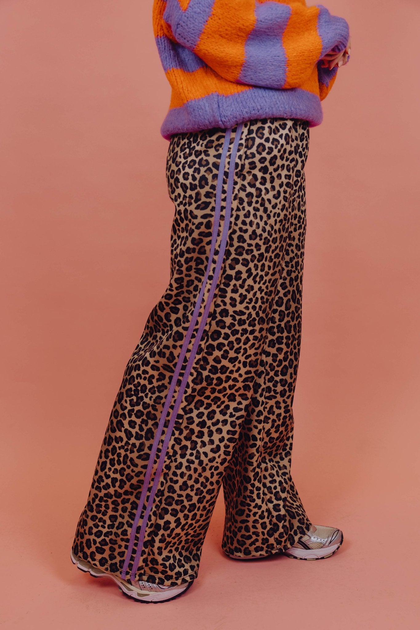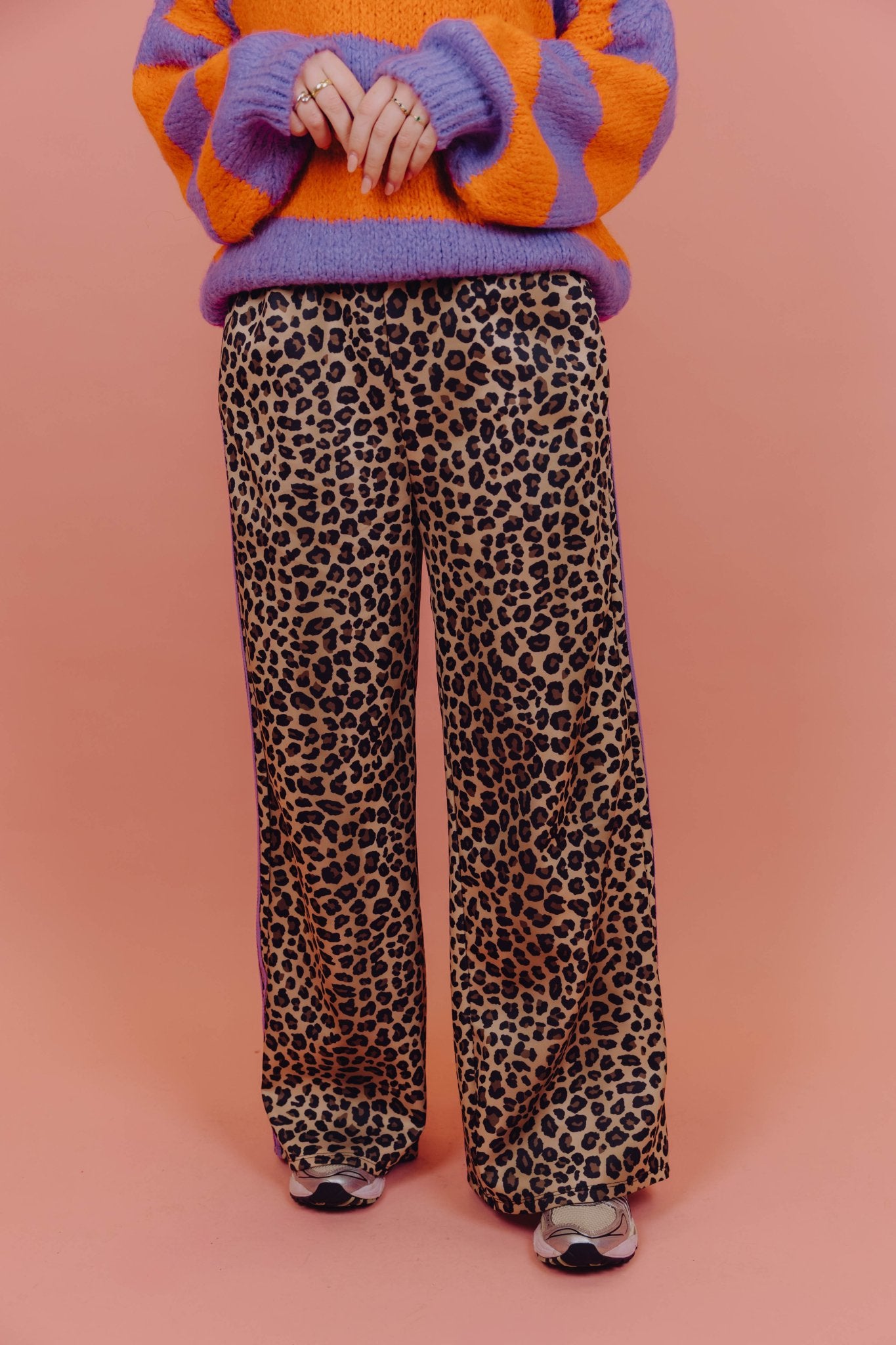 Onze bestselling Priscilla Pants, maar dan in een nieuwe kleur! De Celine Pants is een echte eyecatcher met een comfortabele fit. De broek is gemaakt van een soepele, licht glanzende stof en heeft een all-over leopard print in beige- en zwarttinten. De wide leg pasvorm zorgt voor een casual look en de elastische tailleband maakt de broek extra comfortabel om te dragen. Langs de zijkanten loopt een opvallende paarse streep, wat de broek een sportieve en kleurrijke touch geeft.
