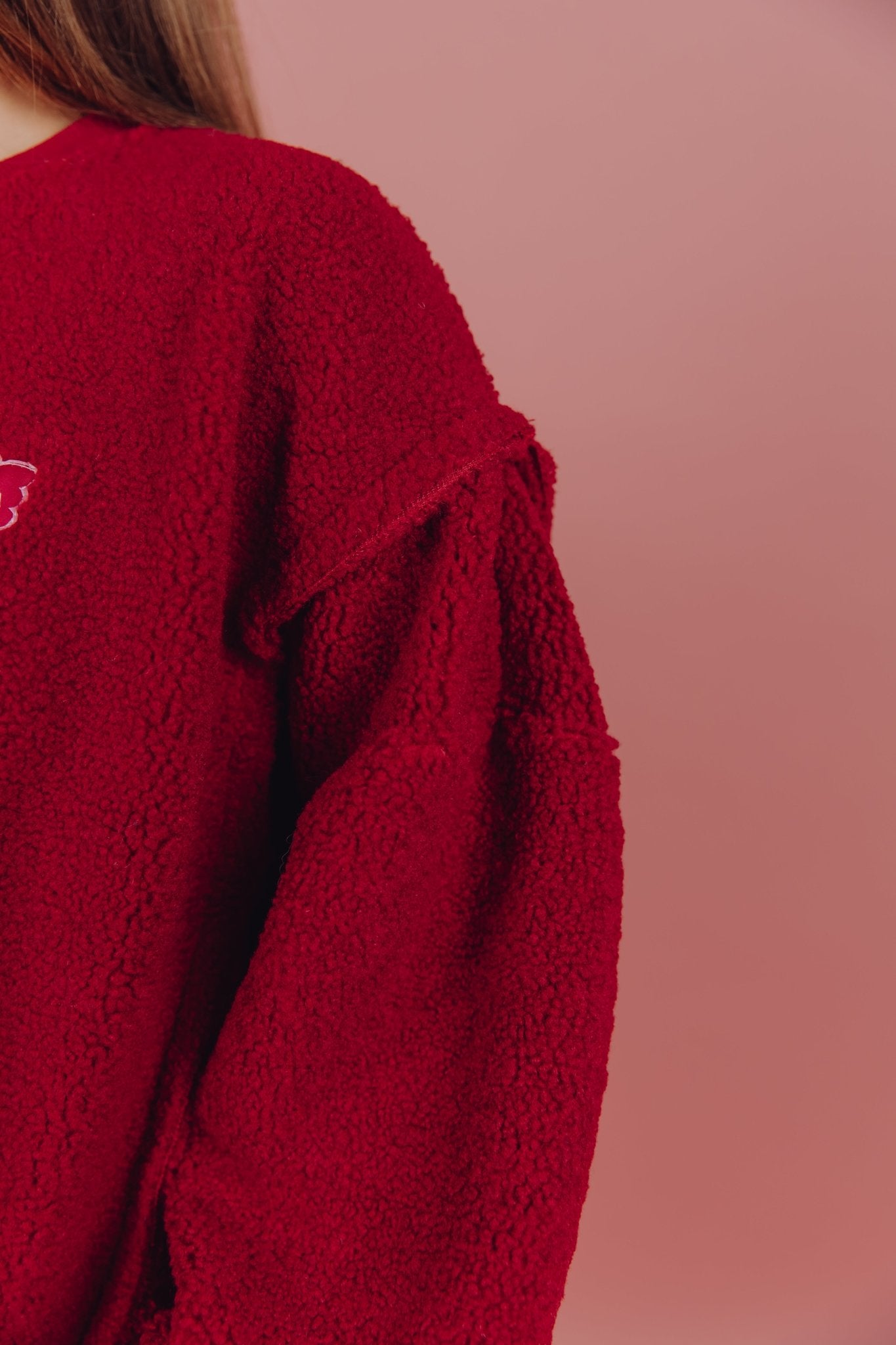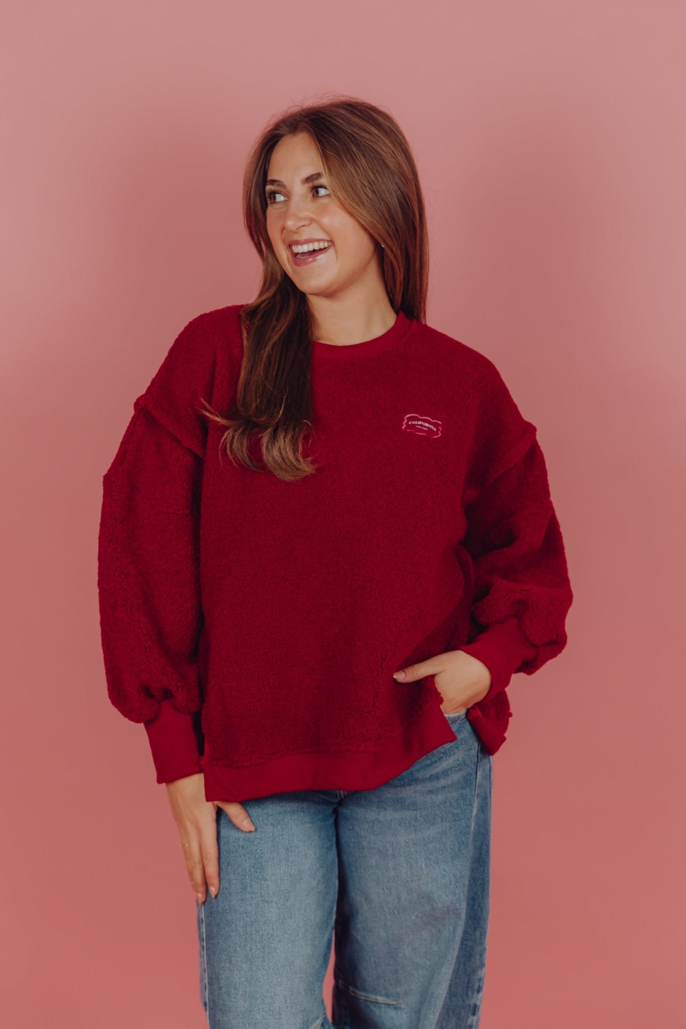 De Channah Teddy Sweater in bordeaux is gemaakt van een zacht teddy stofje, waardoor hij heerlijk warm is. De trui heeft lange mouwen, een ronde halslijn en is voorzien van een patch op de borst. Combineer deze trui met een jeans voor een casual outfit.